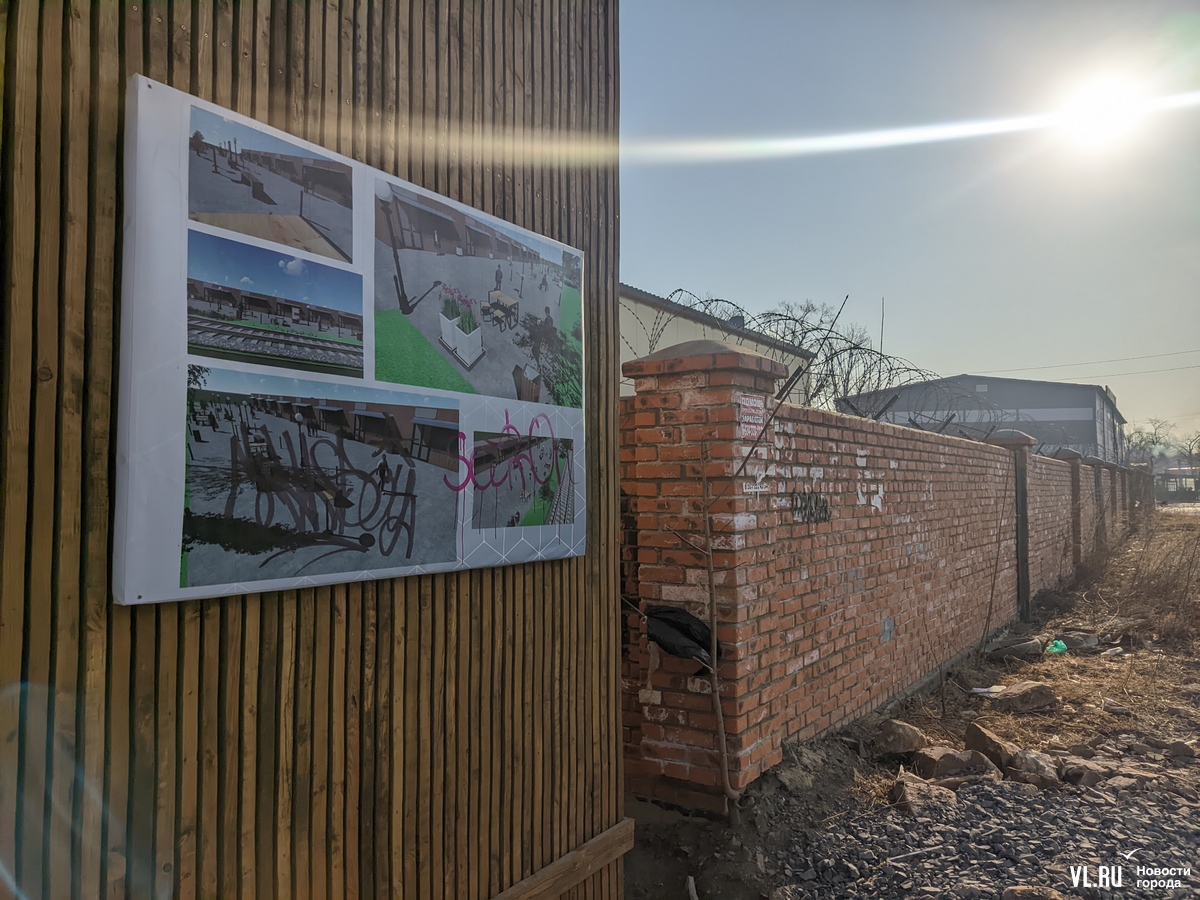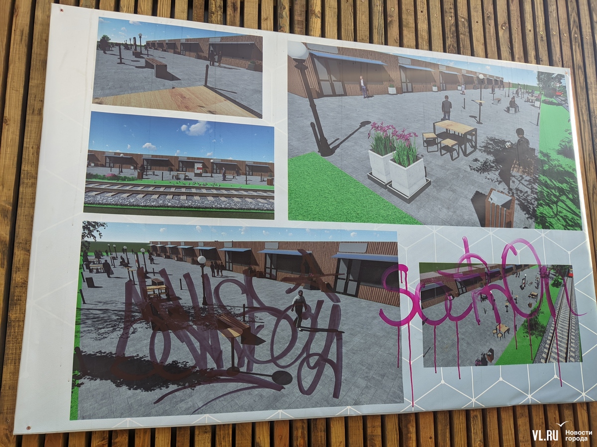 На последнем павильоне вывесили баннер с рендерами будущего «благоустройства», который уже разрисовали тегами. Сроки, заказчик и исполнитель работ не указаны, есть только картинки. Судя по ним, возле павильонов уложат тротуарную плитку, поставят фонари, скамейки, урны, пару клумб с цветами и столы – обычные со стульями и высокие уличные, вероятно, для кафе.