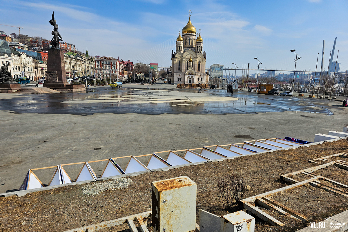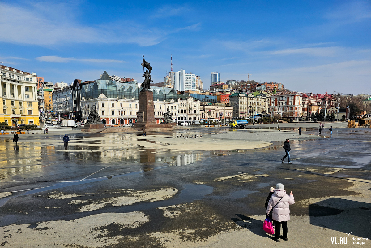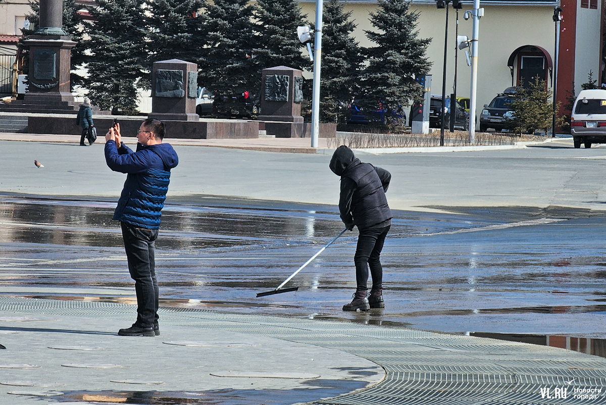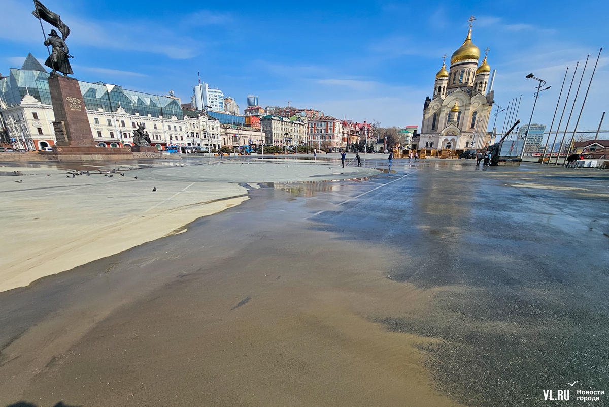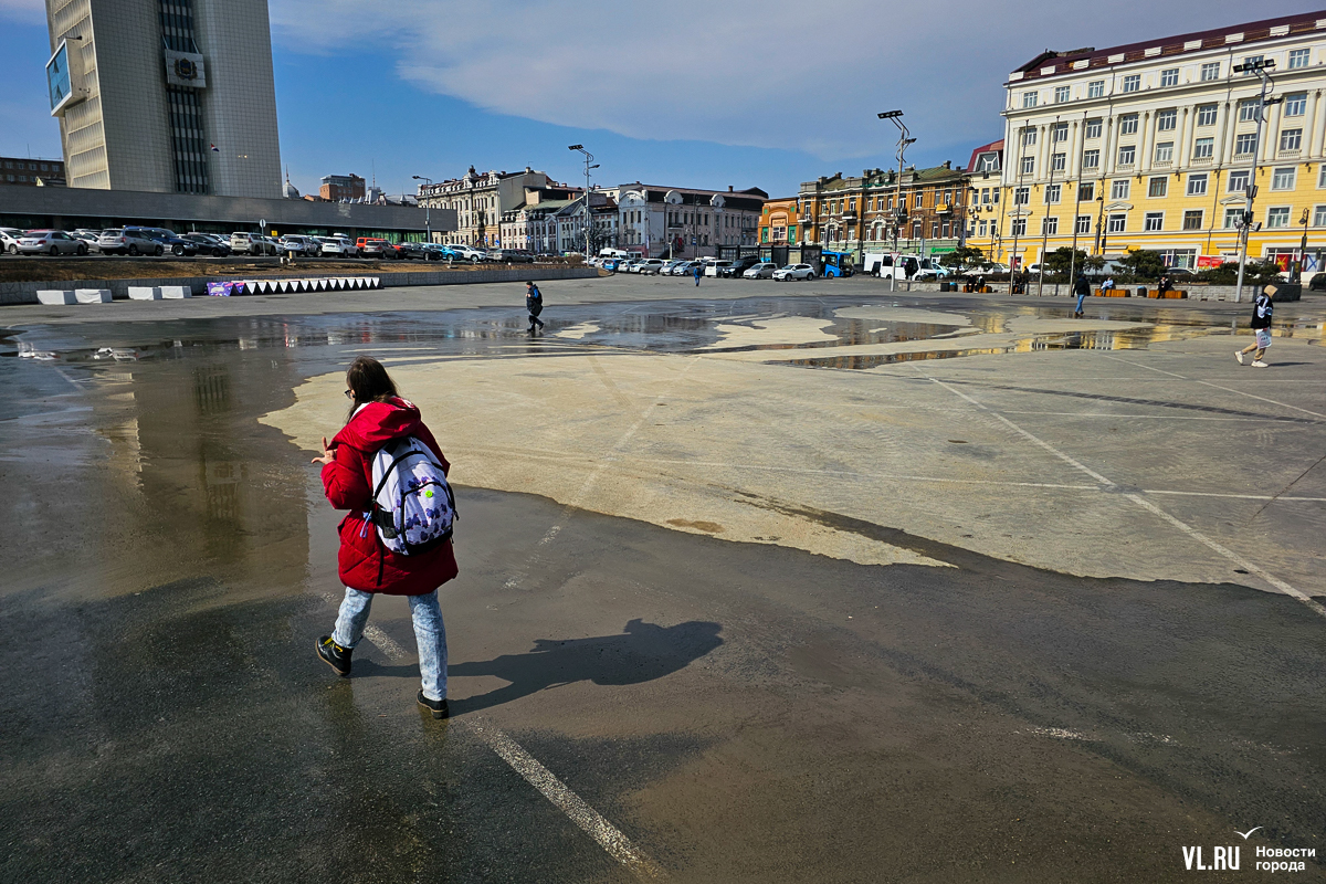 Днём в среду, 13 марта, городские дорожные службы начали убирать песок и грязь, оставшиеся от новогоднего городка на центральной площади Владивостока – в том месте, где располагался каток. Песок лежал здесь больше полумесяца, но в мэрии уже поясняли, что для качественной «влажной уборки» требовались устойчивые плюсовые температуры на улице.