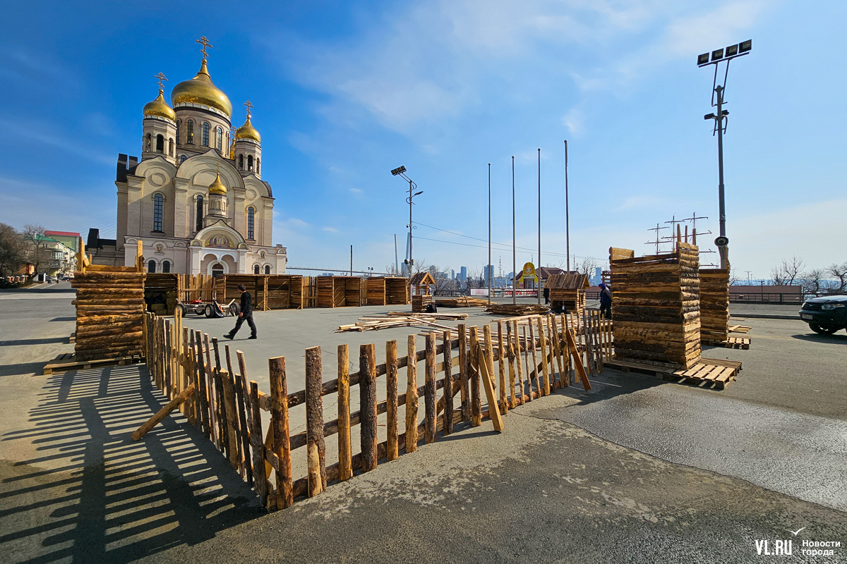 Одновременно с этим в другой стороне площади продолжается строительство домиков-избушек для празднования Масленицы.