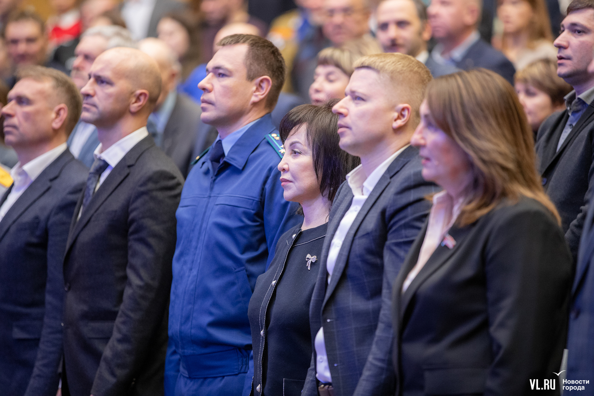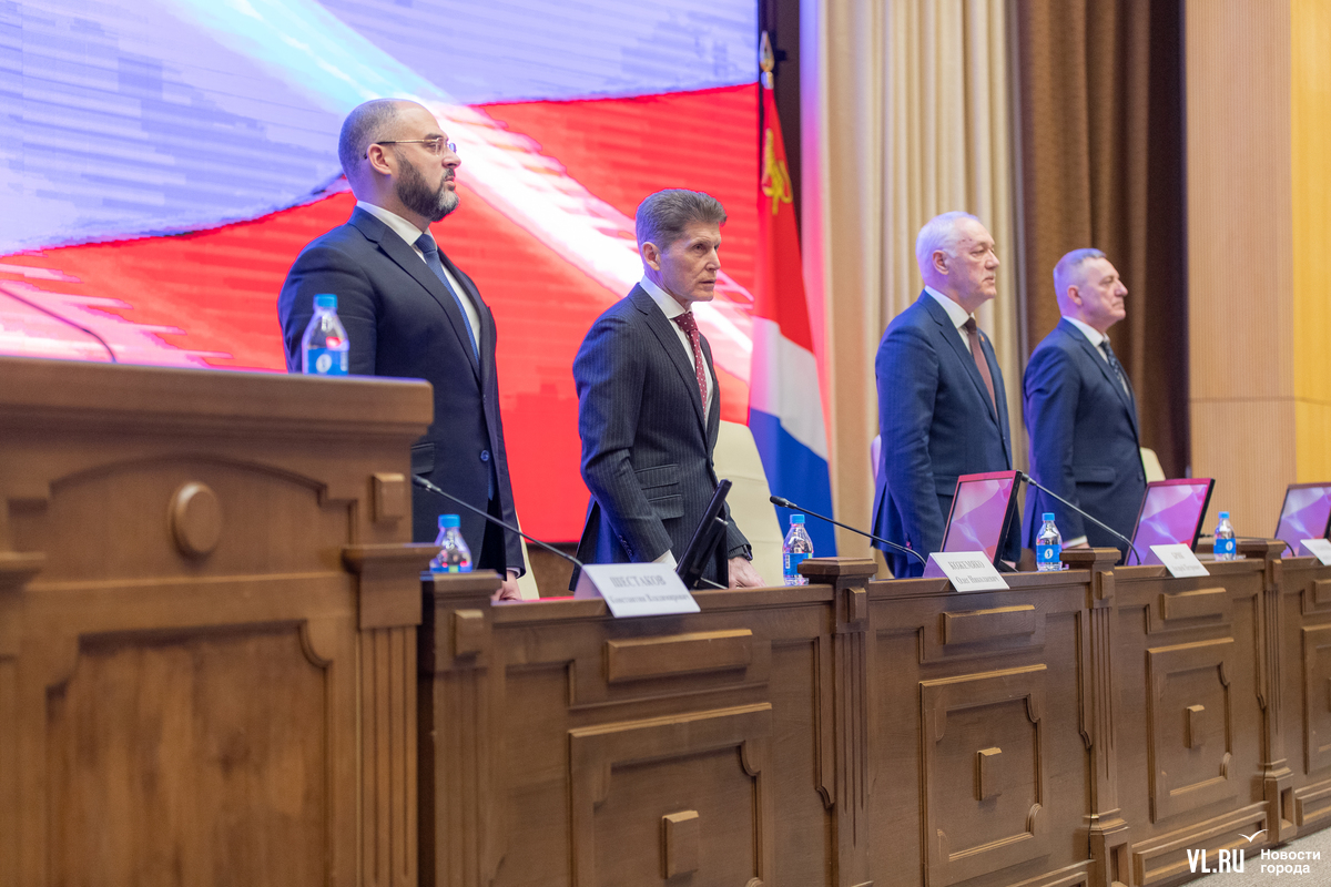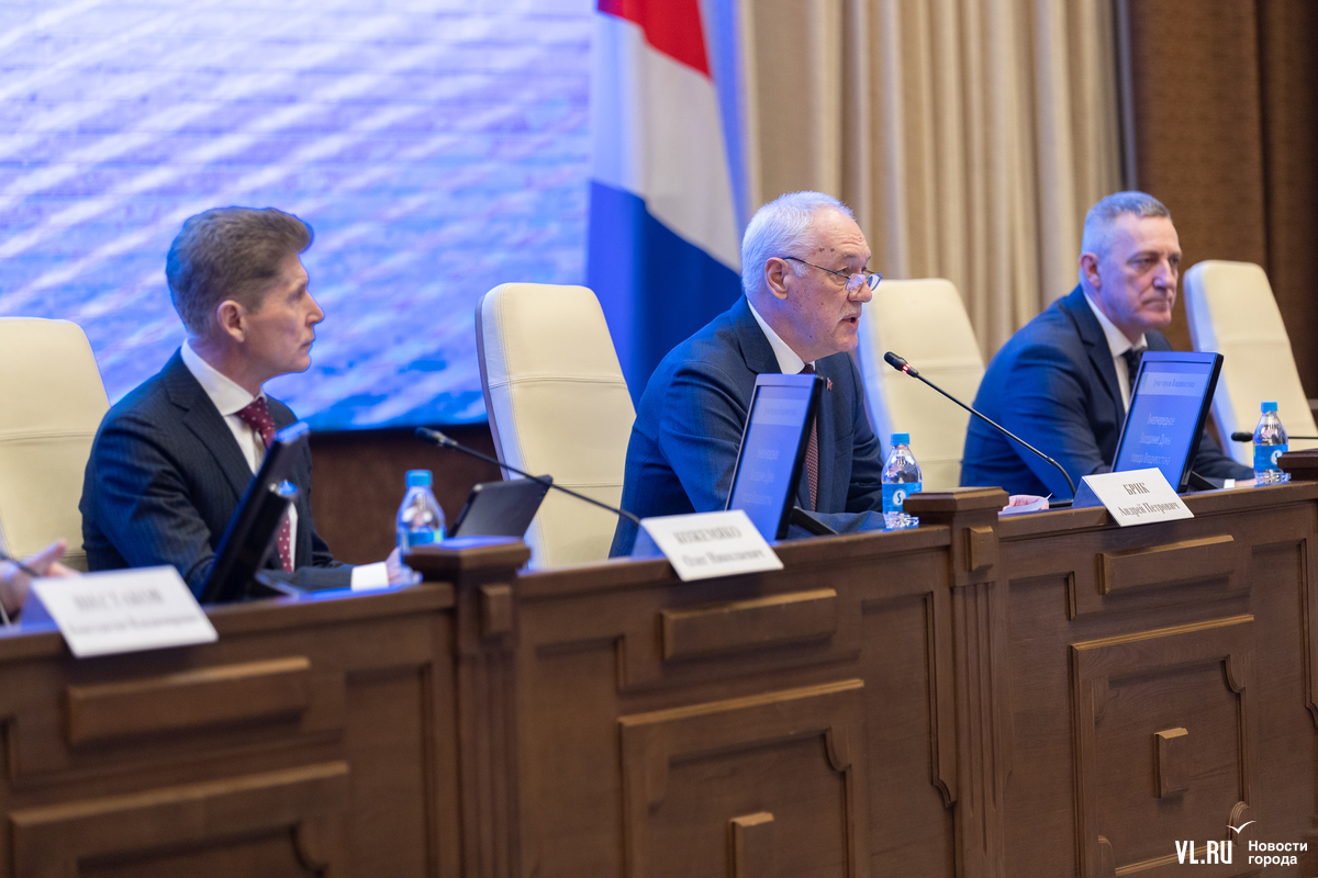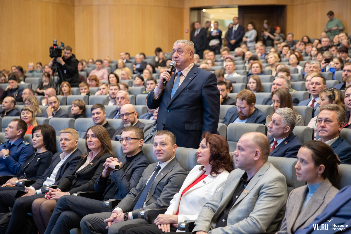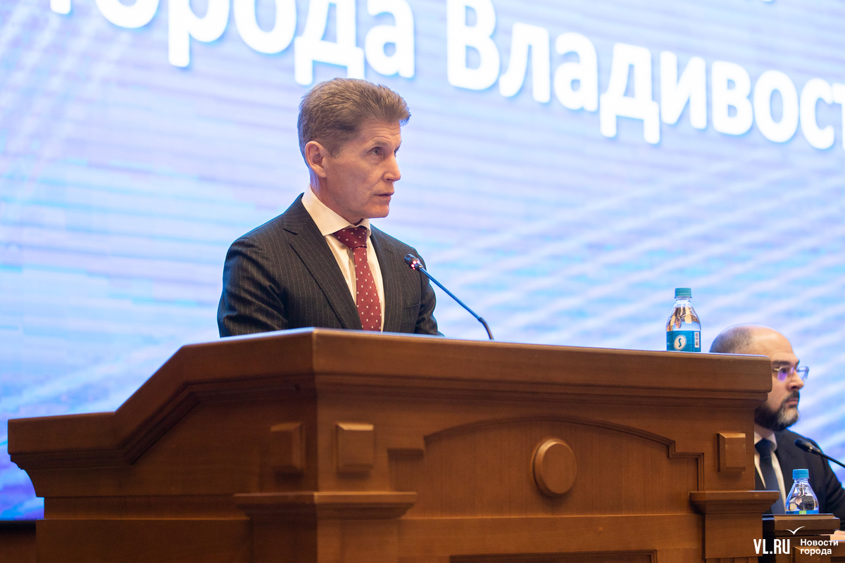 Первым взял слово губернатор Приморья Олег Кожемяко. Говорит о том, что город и край много сотрудничают. Владивосток становится краше, объёмы строительства растут. Практически решена проблема обманутых дольщиков, экономика растёт.