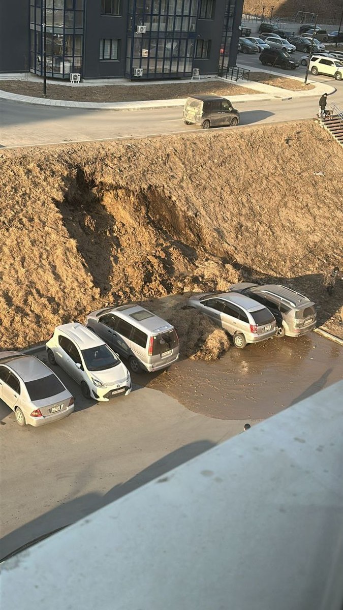 Часть грунта с травой сползла между припаркованными Toyota Noah и Toyota Nadia. Пострадали ли машины, неизвестно – владельцы быстро их убрали.
