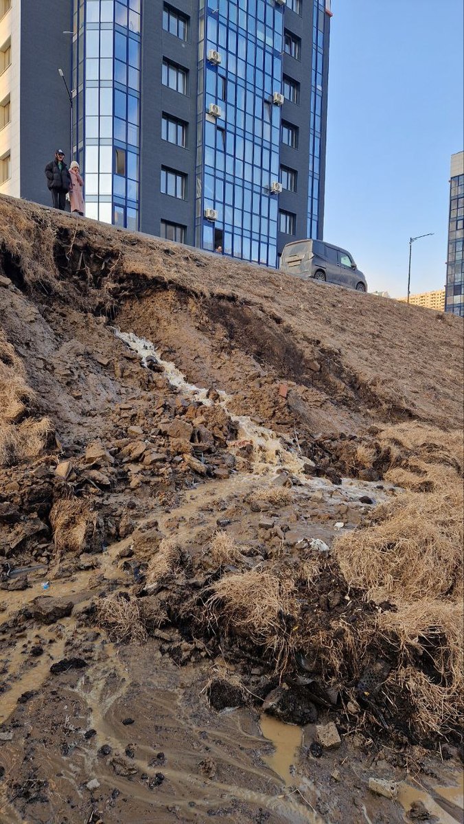 О происшествии сообщил телеграм-канал «Патрокл.Инфо». Между домами № 5, корп. 2 ЖК Costa Azzurra и № 3, корп. 2 ЖК «Восточный» на Североморской размыло косогор, по дворам и по улице потекла река.