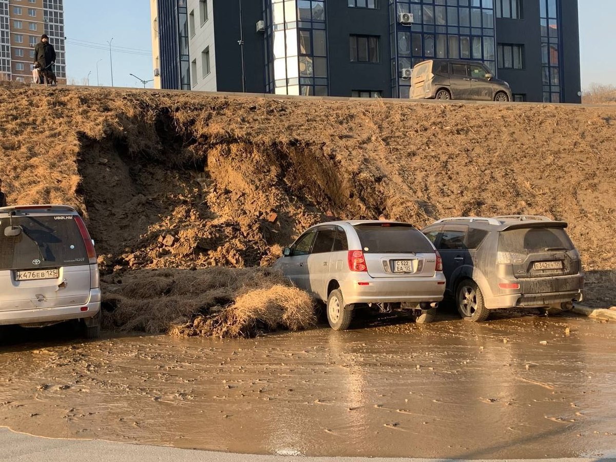 На Патрокле прорвало водопровод между домами на улице Североморской. Потоком смыло часть косогора на припаркованные автомобили и залило половину двора.