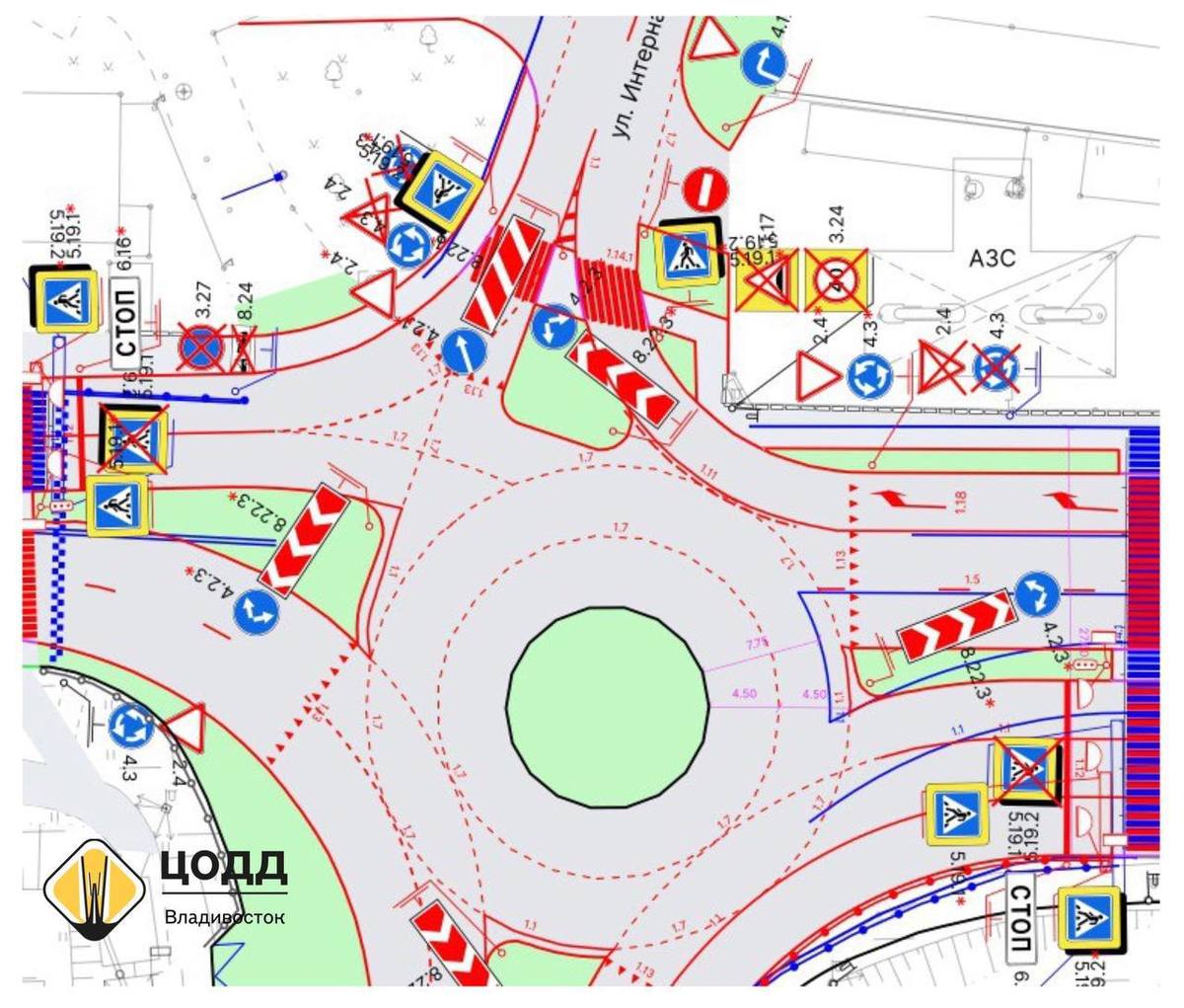 - скорректировали разметку и знаки для возможности проезда с улицы Интернациональной по кольцу в сторону развязки улиц Олега Кошевого - Окатовой - Героев Тихоокеанцев;