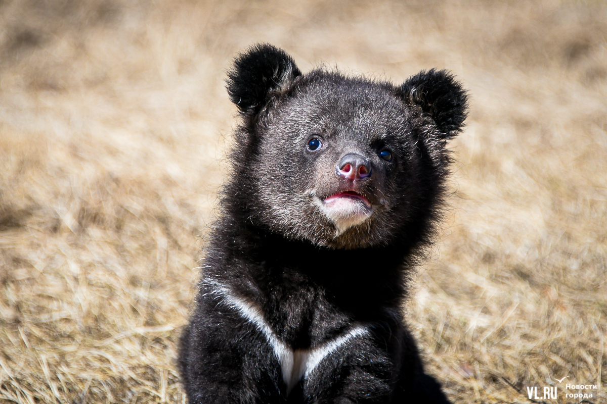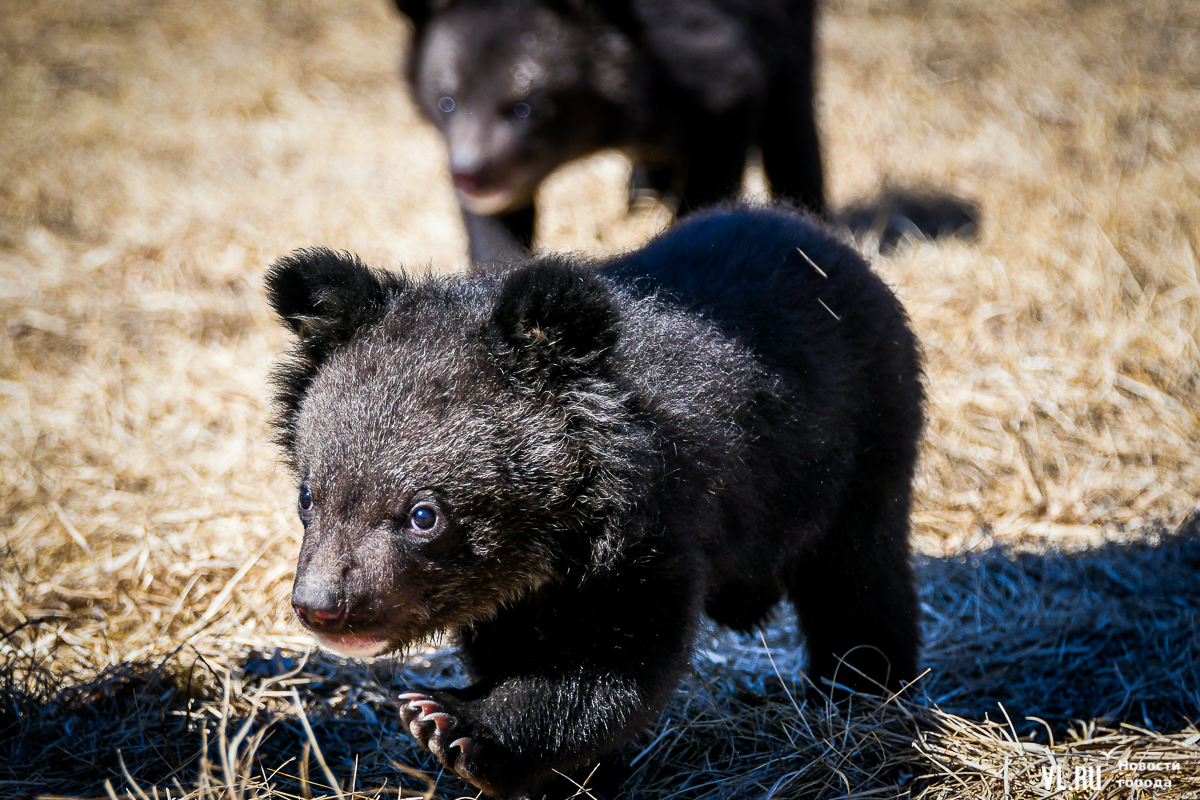 Двое гималайских мишек ещё не вышли из спячки, и за ними наблюдают по монитору. Это прошлогодние – родились прошлой зимой. Ещё двоих гималайцев, которые родились уже нынешней зимой, выводят на прогулку. Им примерно месяц, они попали сюда из разных мест в марте.