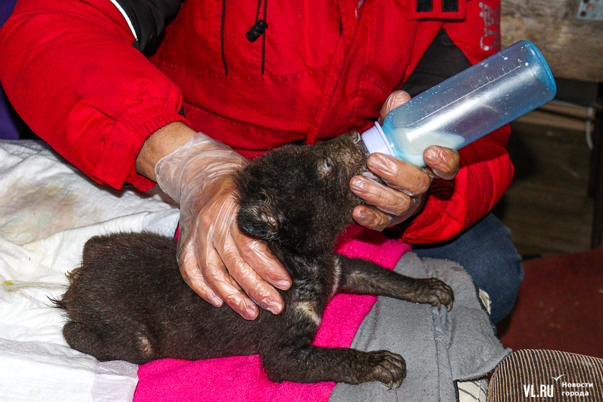Что касается медвежат – иногда есть смысл вмешаться. Медведица рожает малышей во сне, в берлоге, и во сне начинает их кормить. Если её что-то испугало, то же упавшее дерево – она выскакивает, медвежата отваливаются, а мама не возвращается. И если на улице минус сорок, а медвежата совсем маленькие – они ведь рождаются двухсотграммовыми, наверное, можно подобрать. В прошлом году таких привезли, но поздно – обморозились, их не смогли выходить. В таких ситуациях малышей нужно посадить в коробку и поскорее передать специалистам, не устраивая ясли на дому. Потому что люди начинают их кормить коровьим молоком, чего нельзя категорически – только козьим. Иначе малыши получат серьёзные проблемы с пищеварением. И всё равно и в этом случае, и в других нужно дозвониться до охотнадзора.