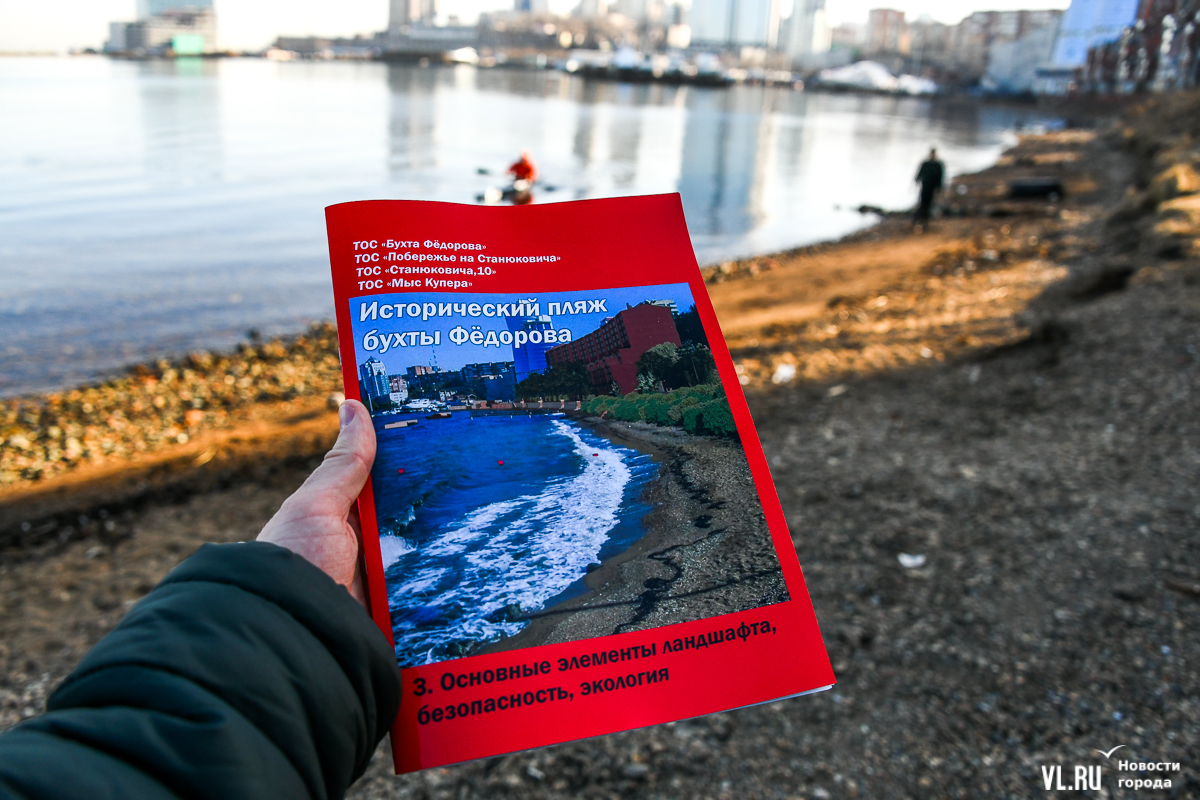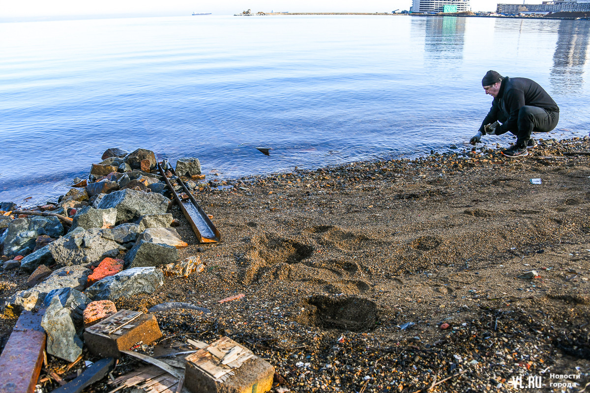 «Это может быть шикарное место. Это живая бухта, сюда киты заплывают, малый северный полосатик, ларги выходят на берег, около 20 видов водорослей, много птиц прилетает, моллюски разные. Вот смотрите: устрица, мидия, песчанка, рапан. Очень богатый водный мир для центра города» – рассказывает Сергей Бобошко, председатель ТОСа «Бухта Фёдорова» и организатор субботника.