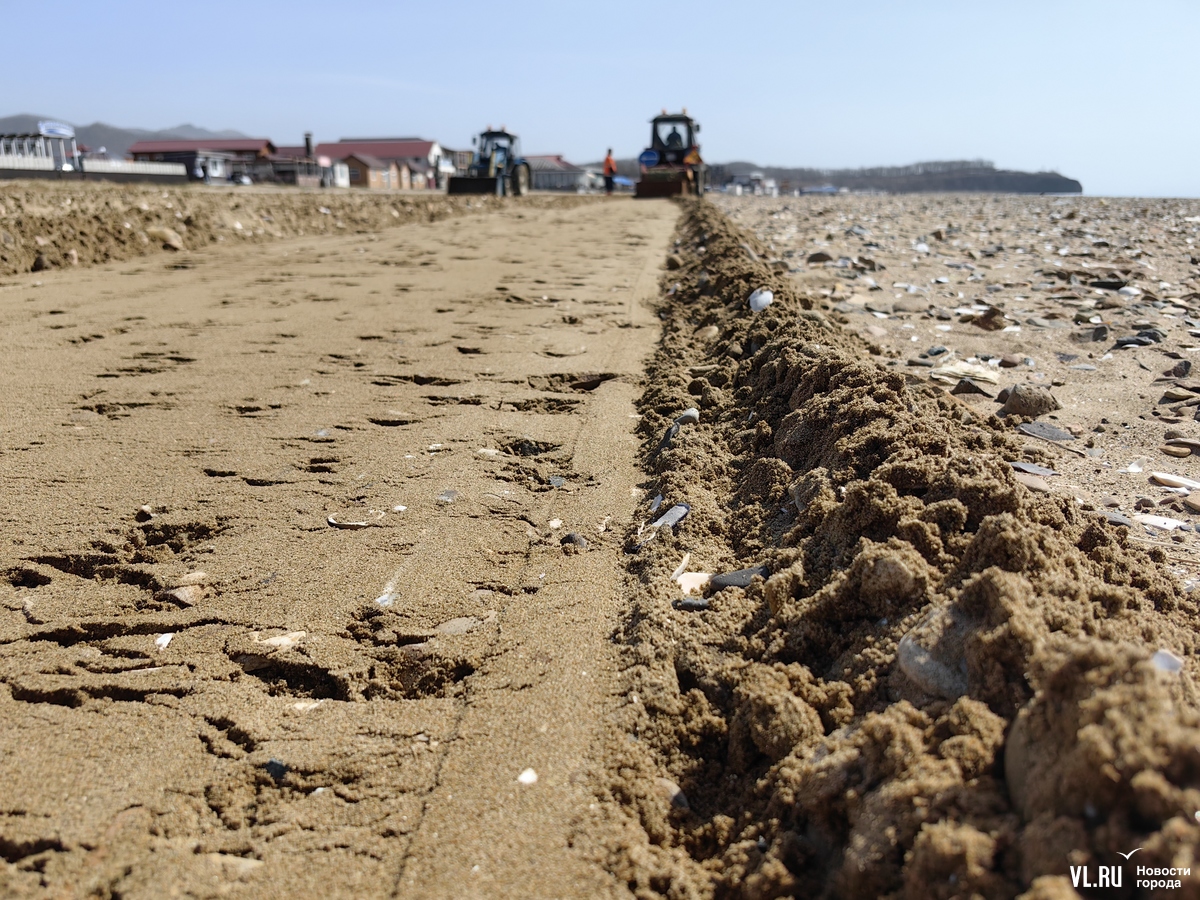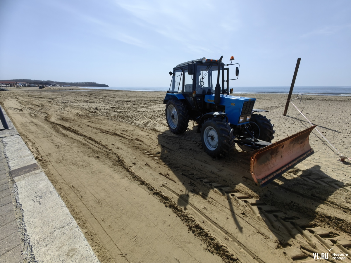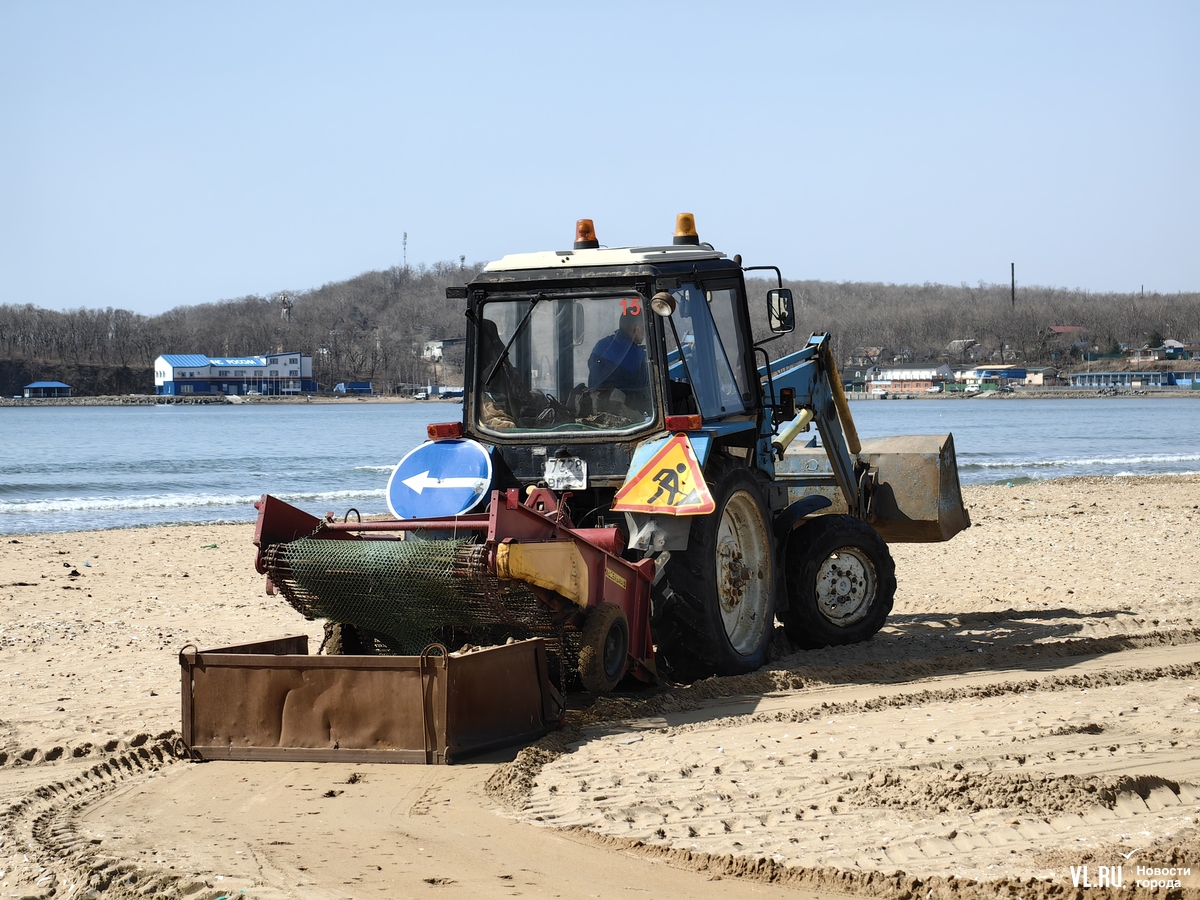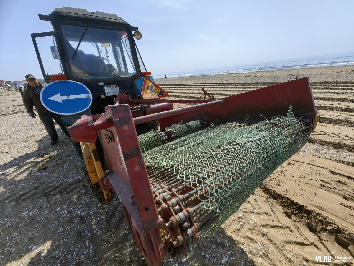 С самого утра на песке бухты Лазурной грохочут тракторы – техника муниципального предприятия «Зелёный Владивосток» просеивает песок, забирая битую ракушку, крупный мусор и камни. Работы ведут двумя единицами. К трактору сзади цепляют специальную сеялку с сеткой, позволяющую отделять фракции, и металлический поддон, в который ссыпается мусор. Оборудование сперва вспахивает и просеивает песок, и то, что оказалось крупнее ячеек сетки, ссыпается в поддон. Один «рейс» от начала участка до конца – примерно 150 метров и полная «ванна» камней и ракушек.