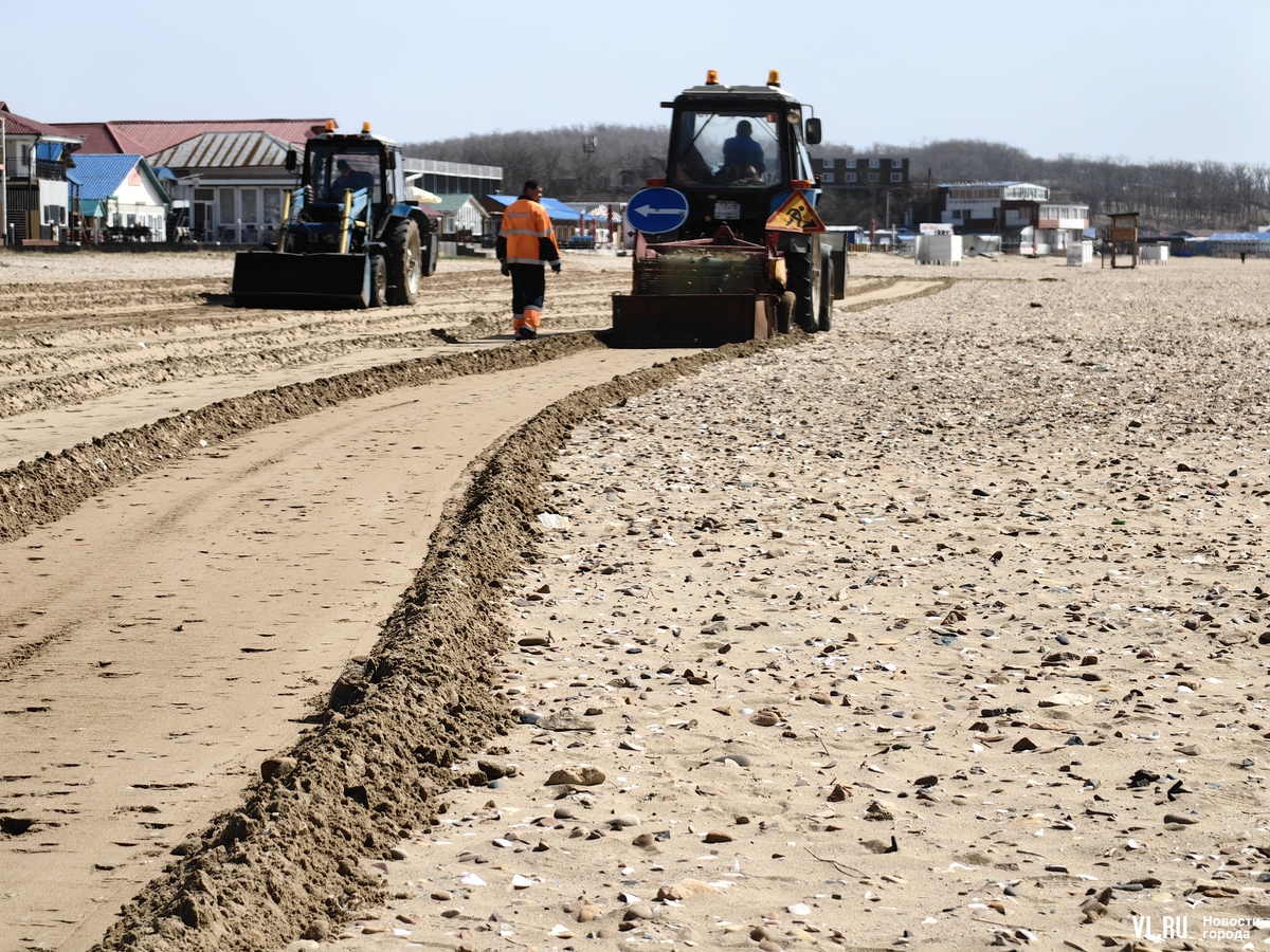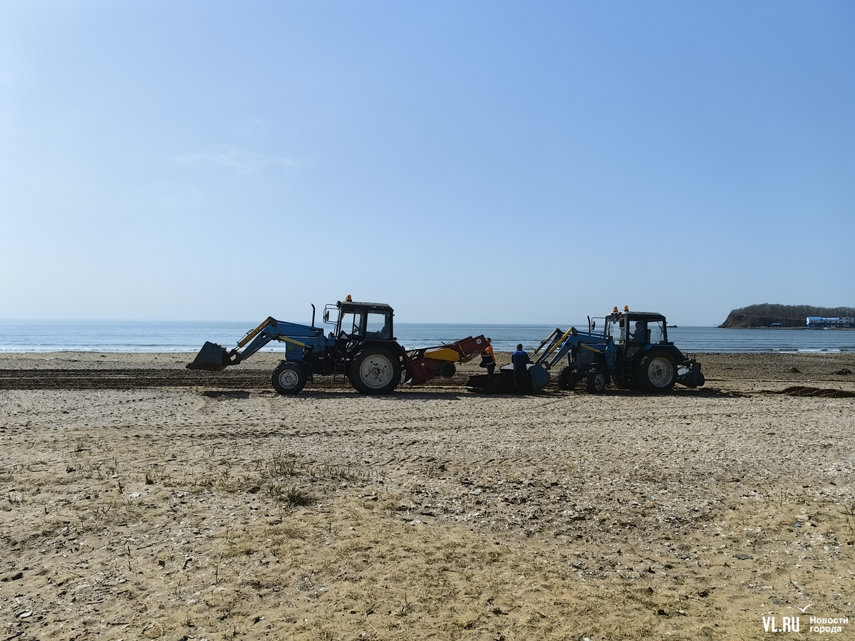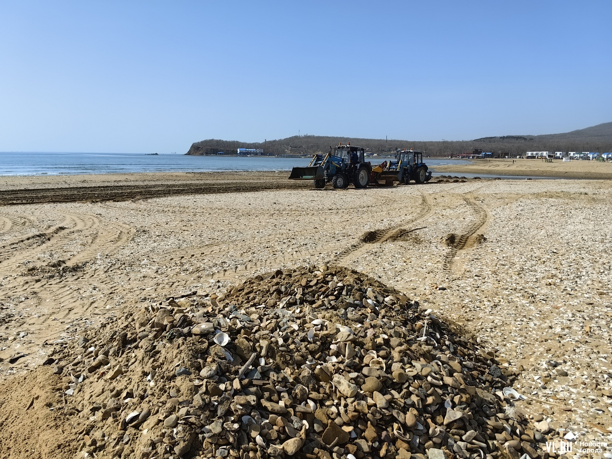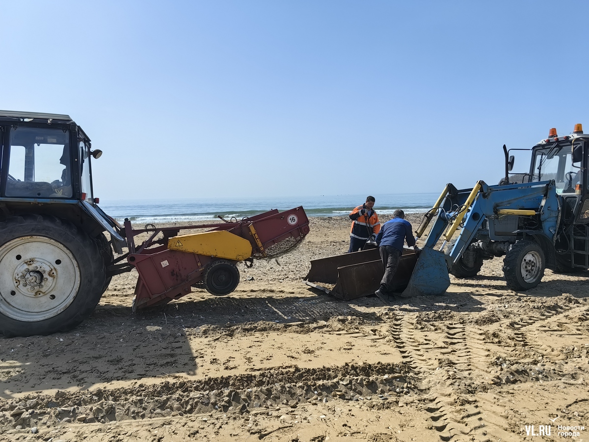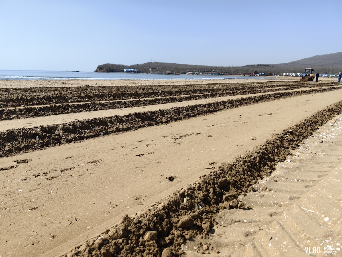 С самого утра на песке бухты Лазурной грохочут тракторы – техника муниципального предприятия «Зелёный Владивосток» просеивает песок, забирая битую ракушку, крупный мусор и камни. Работы ведут двумя единицами. К трактору сзади цепляют специальную сеялку с сеткой, позволяющую отделять фракции, и металлический поддон, в который ссыпается мусор. Оборудование сперва вспахивает и просеивает песок, и то, что оказалось крупнее ячеек сетки, ссыпается в поддон. Один «рейс» от начала участка до конца – примерно 150 метров и полная «ванна» камней и ракушек.