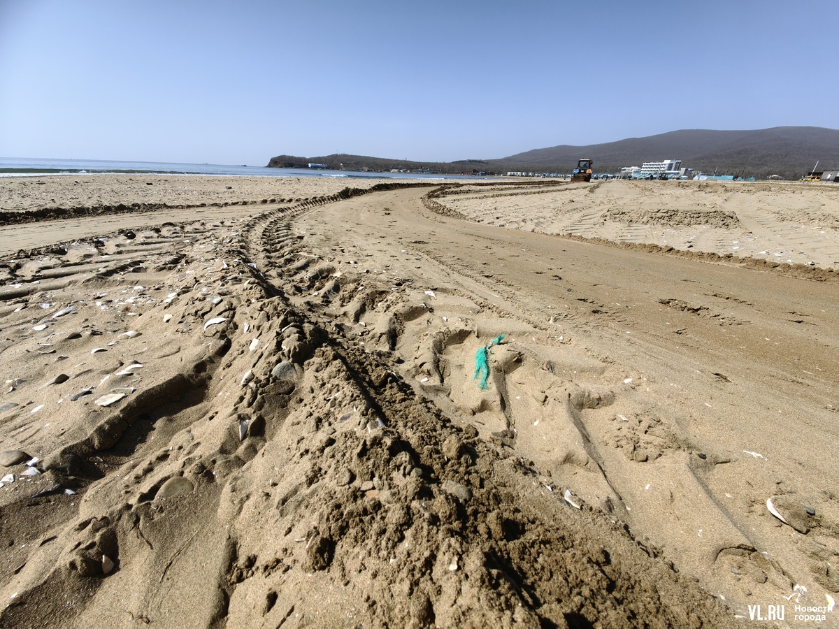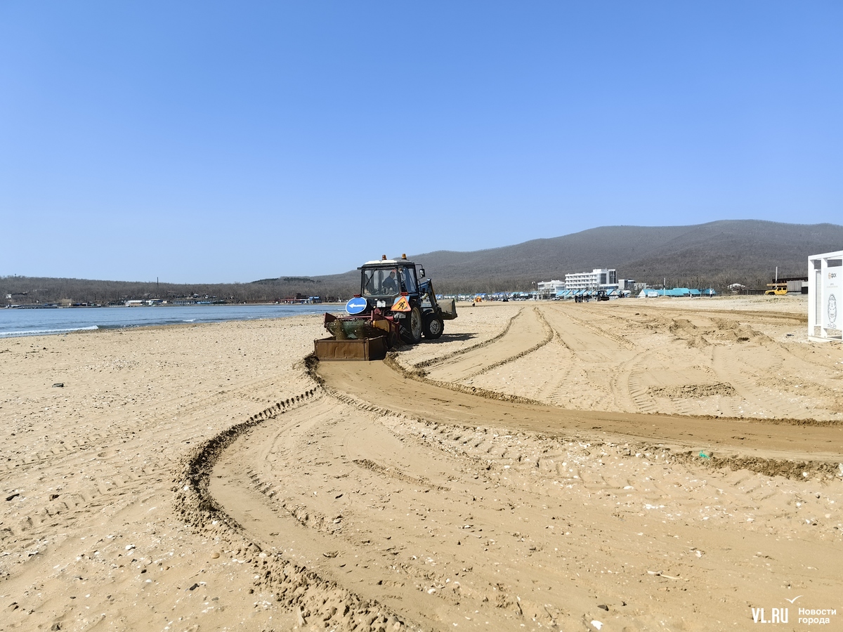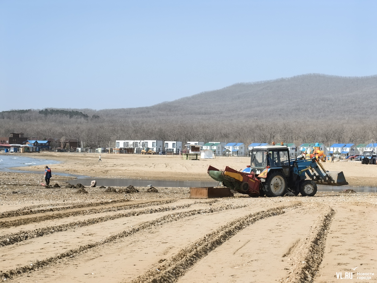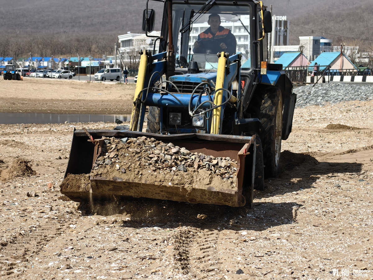 С самого утра на песке бухты Лазурной грохочут тракторы – техника муниципального предприятия «Зелёный Владивосток» просеивает песок, забирая битую ракушку, крупный мусор и камни. Работы ведут двумя единицами. К трактору сзади цепляют специальную сеялку с сеткой, позволяющую отделять фракции, и металлический поддон, в который ссыпается мусор. Оборудование сперва вспахивает и просеивает песок, и то, что оказалось крупнее ячеек сетки, ссыпается в поддон. Один «рейс» от начала участка до конца – примерно 150 метров и полная «ванна» камней и ракушек.