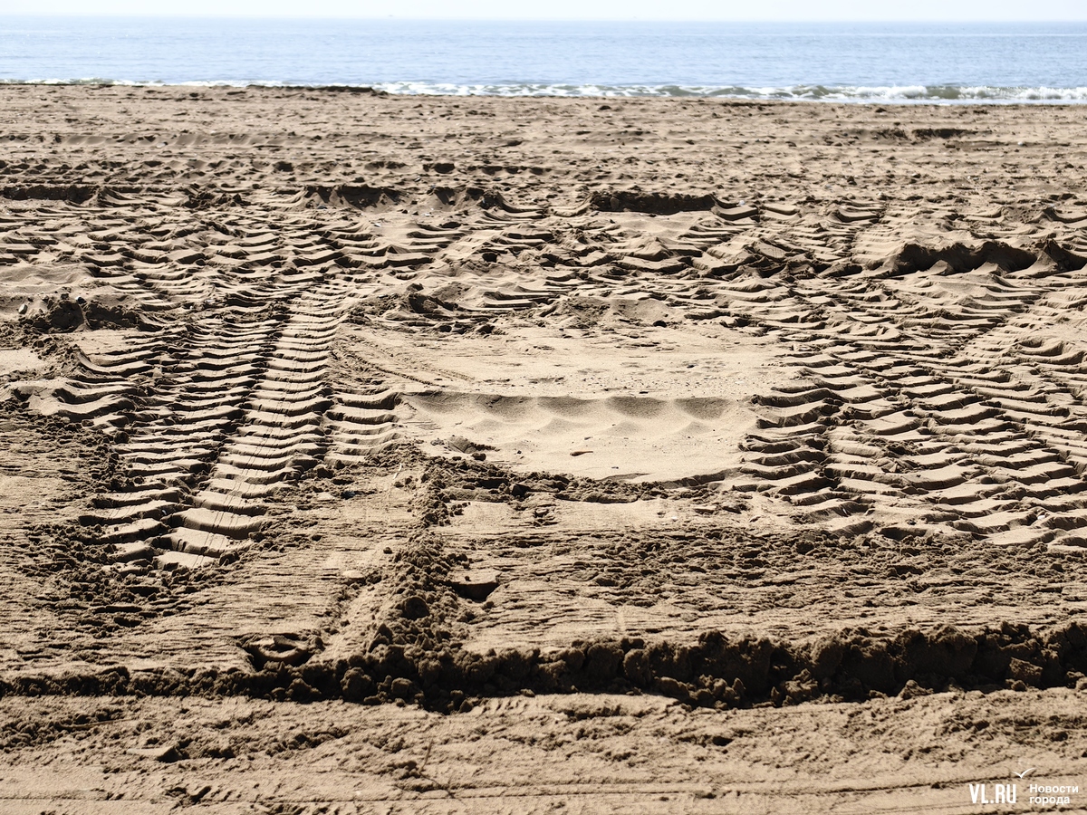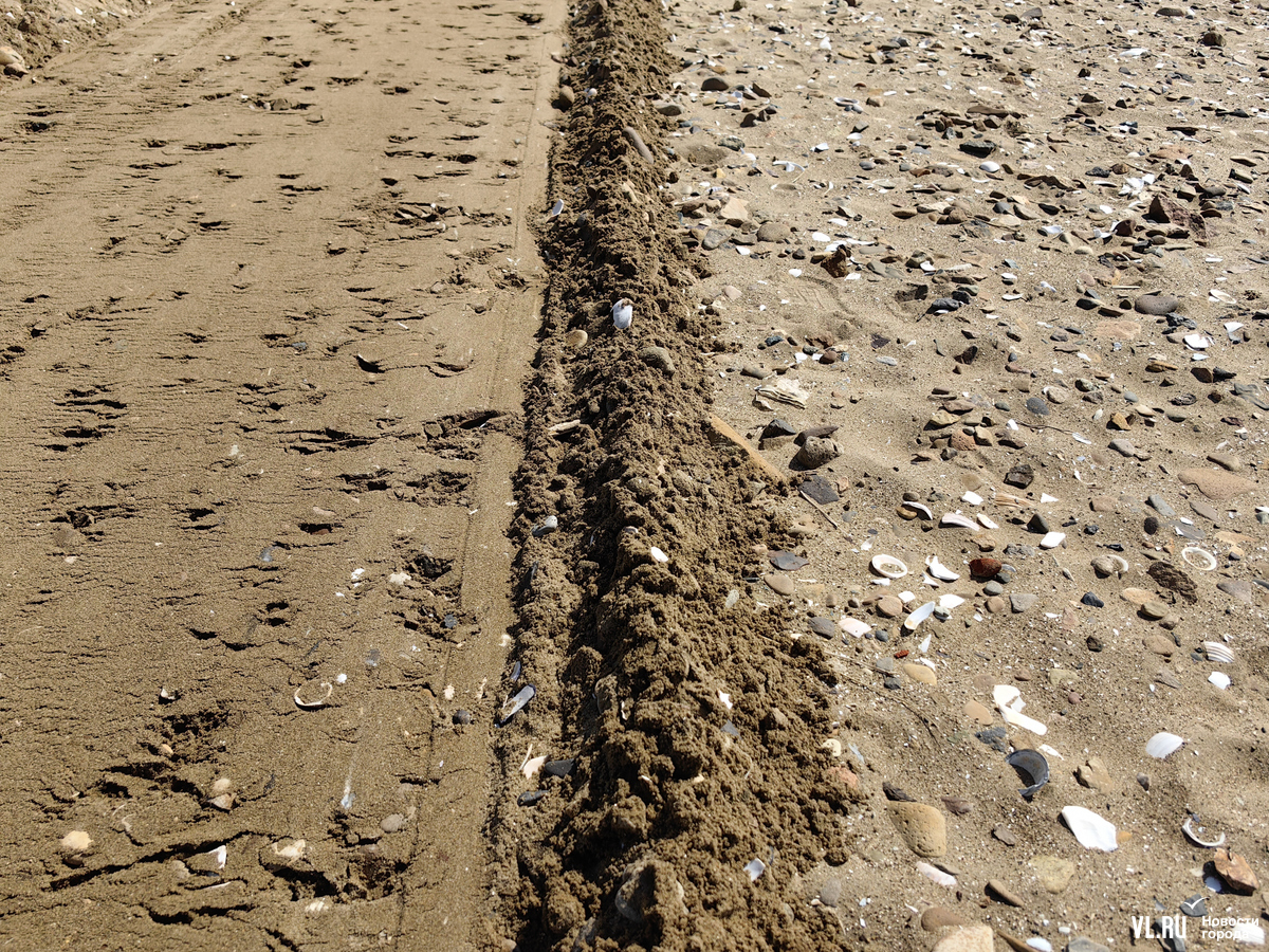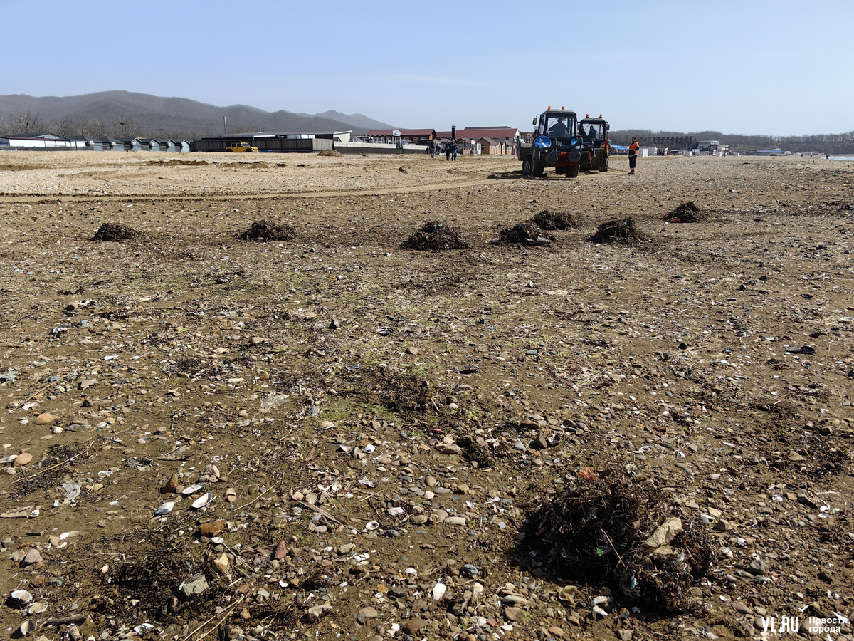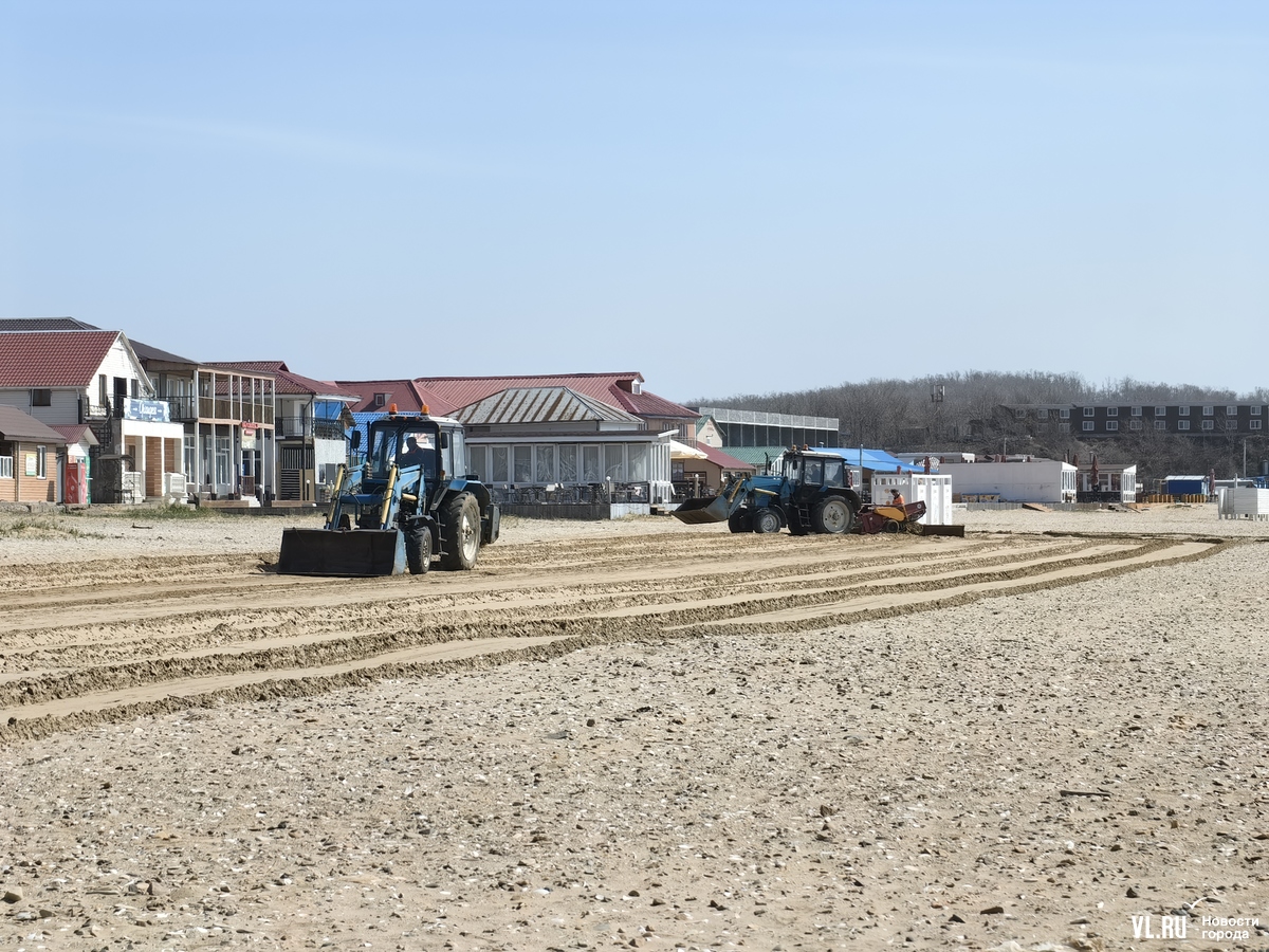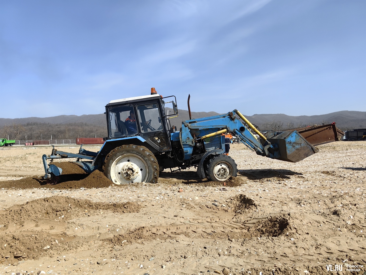 С самого утра на песке бухты Лазурной грохочут тракторы – техника муниципального предприятия «Зелёный Владивосток» просеивает песок, забирая битую ракушку, крупный мусор и камни. Работы ведут двумя единицами. К трактору сзади цепляют специальную сеялку с сеткой, позволяющую отделять фракции, и металлический поддон, в который ссыпается мусор. Оборудование сперва вспахивает и просеивает песок, и то, что оказалось крупнее ячеек сетки, ссыпается в поддон. Один «рейс» от начала участка до конца – примерно 150 метров и полная «ванна» камней и ракушек.