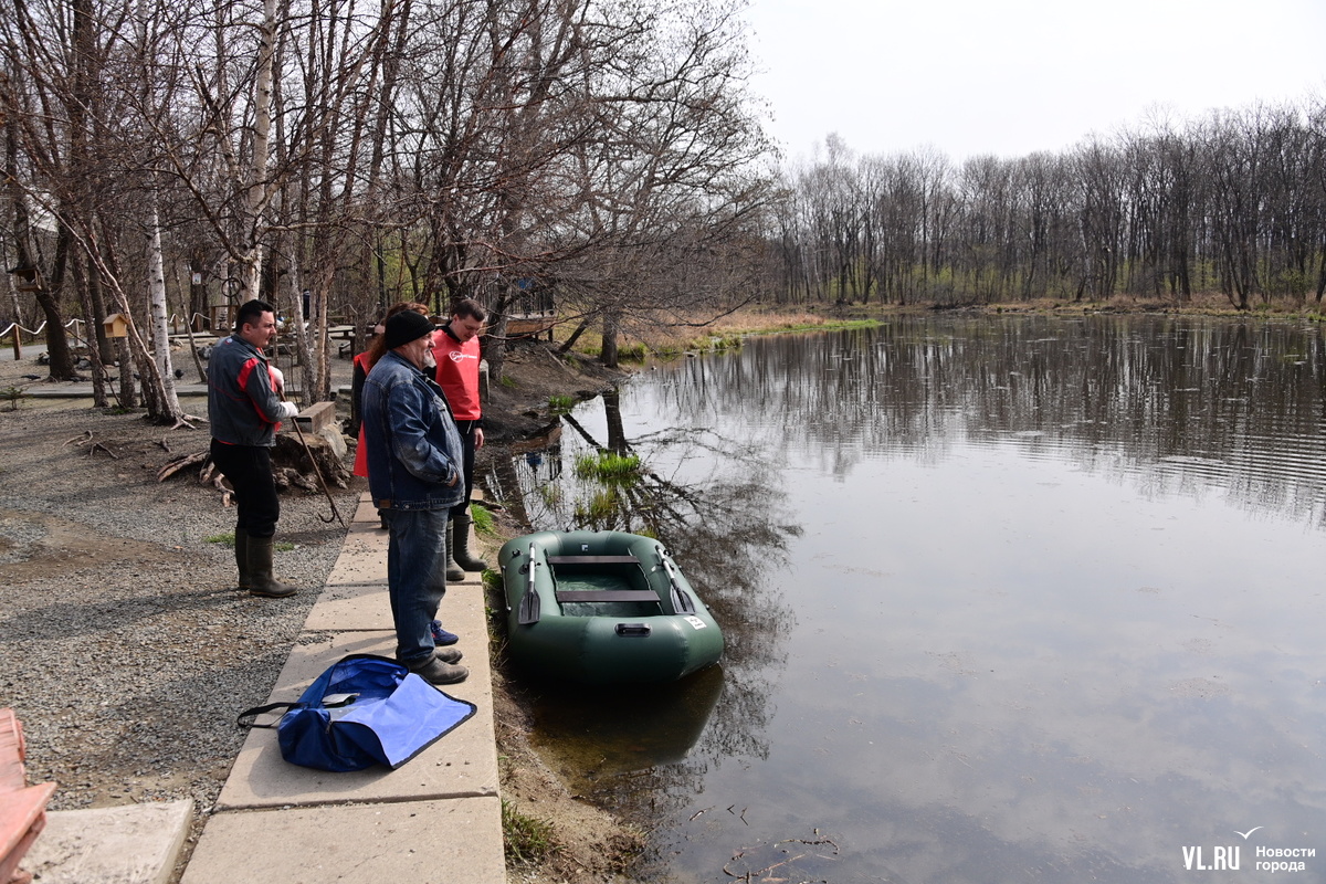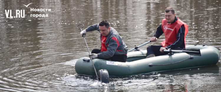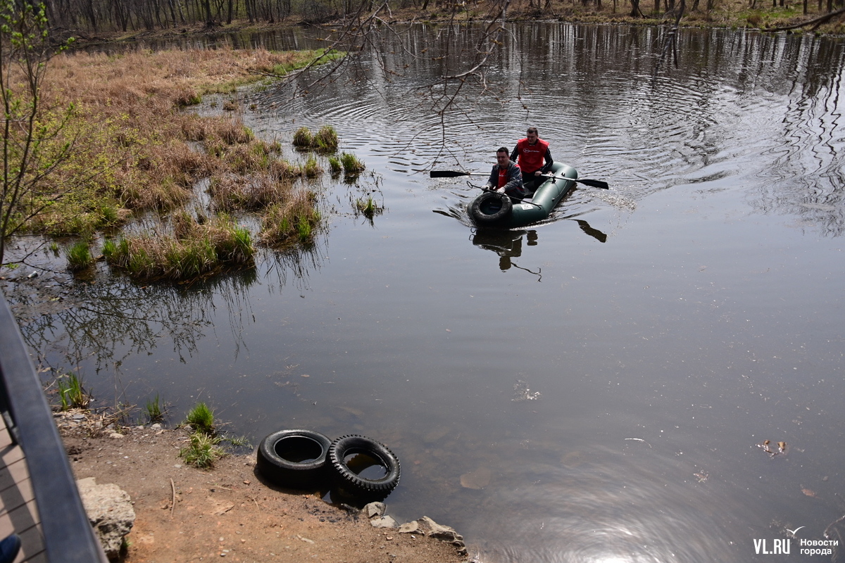 Пока за территорией на регулярной основе следят предприниматели – представители «Саммит Моторс» приезжают сюда ежегодно: подкрасить элементы благоустройства и выловить злополучные шины. Двое крепких мужчин надувают лодку и при помощи багров извлекают отходы из протоки.