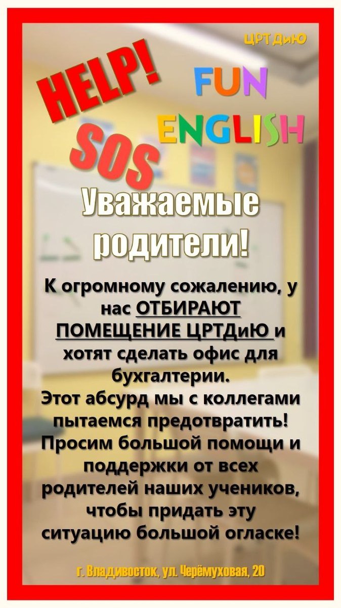 Отметим, что жители района также распространяют по соцсетям объявление, из содержания которого можно предположить, что Дом детского творчества сам опубликовал информацию о проблемной ситуации. В частности, на изображении-листовке написано, что помещение отбирают у ЦРТДиЮ, вместо него хотят сделать офис для бухгалтерии, и что «этот абсурд с коллегами мы пытаемся предотвратить».