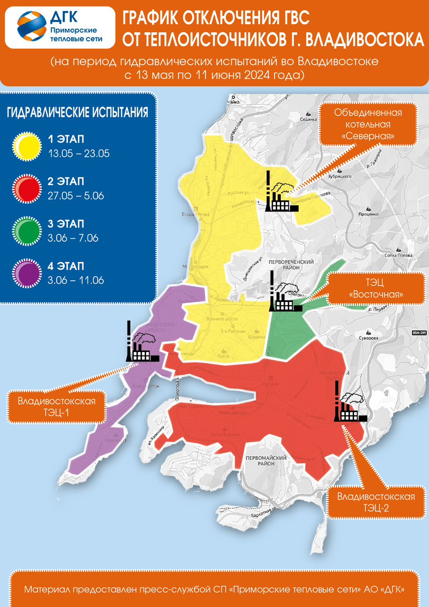 Четвёртый этап – с 3 по 11 июня ГВС ограничат во Фрунзенском и части Ленинского, а также Первореченского районов, получающих тепло от Владивостокской ТЭЦ-1.