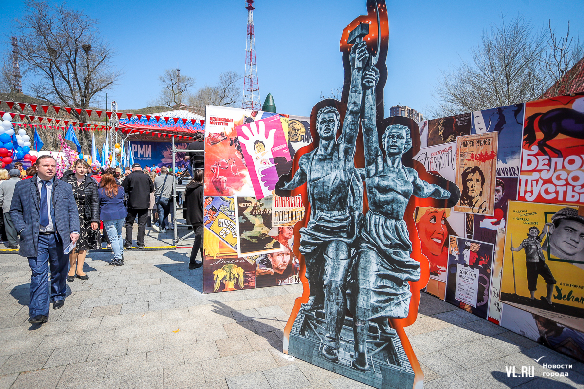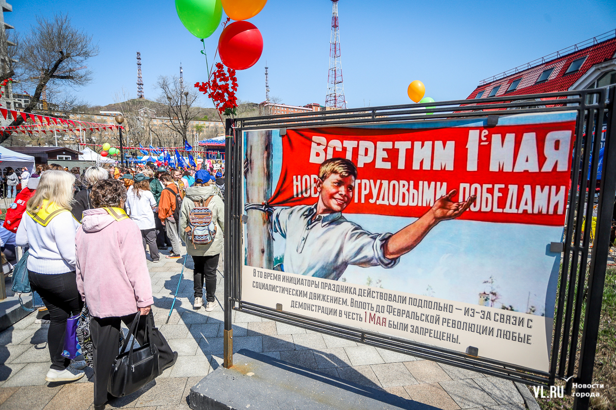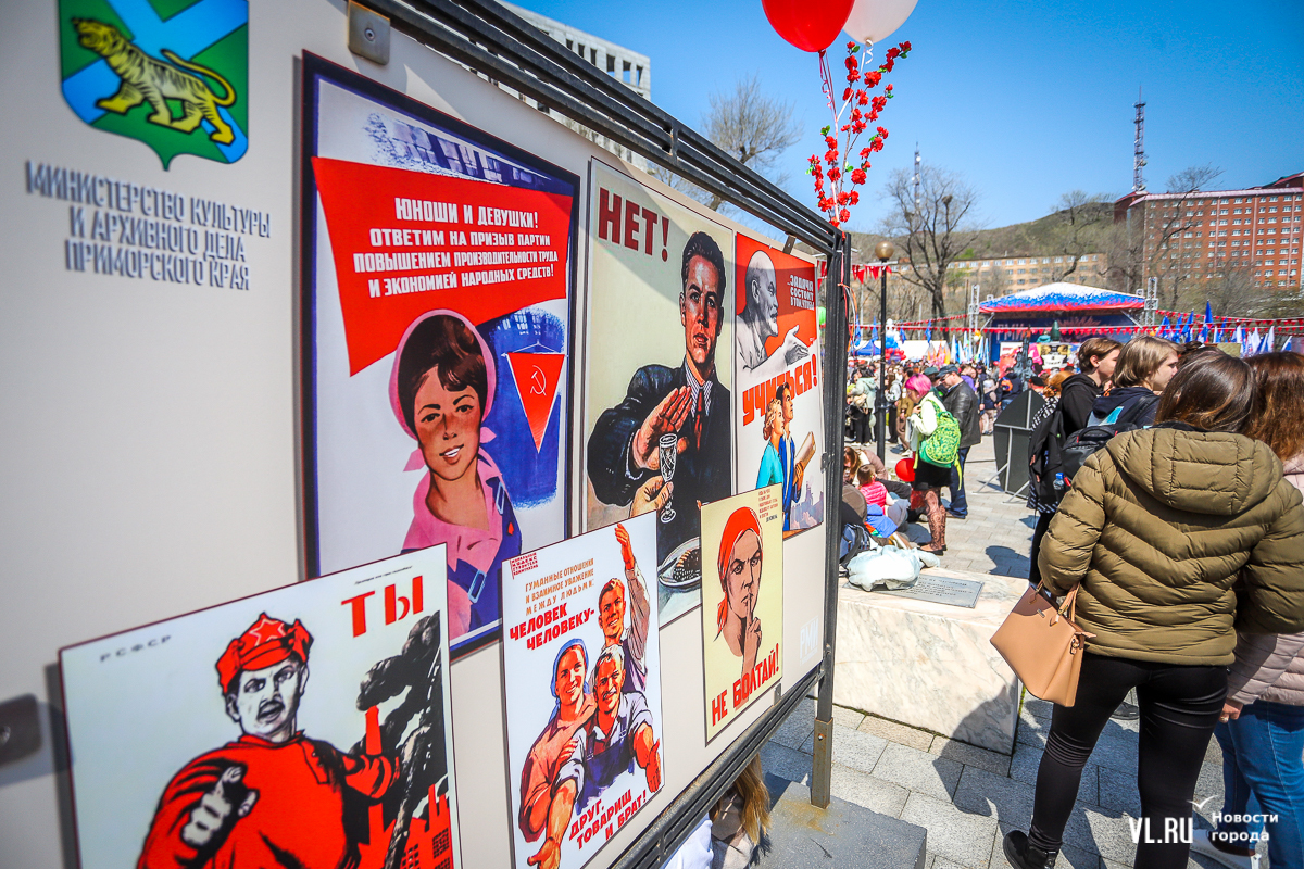 После выступления главы Приморского края начался концерт вокальных и танцевальных коллективов. Здесь же развернулось несколько интерактивных фотозон. Например, можно посидеть в советских интерьерах и позвонить со старого дискового телефона, оценить макет ракеты «Восток», почитать афиши советского кино или полистать юбилейные книги трудовой доблести. Тут же – несколько стендов с историей праздника, который учредили в 1900 году и называли Днём борьбы трудящихся за свои права, и выставка «1 Мая в архивных документах и фотографиях». Можно посмотреть на фото женщин рабочих профессий, снятых в Приморье с 40-х до 80-х годов XX века.