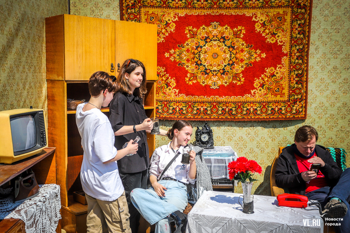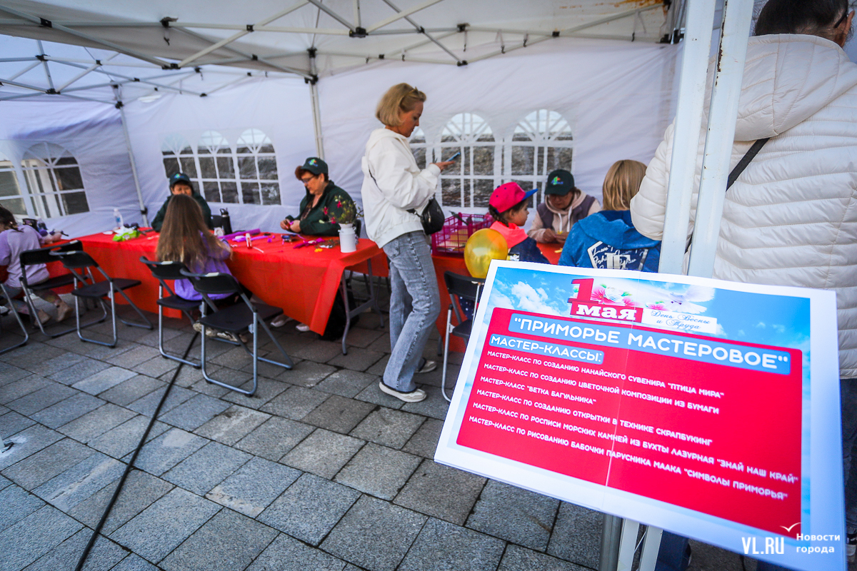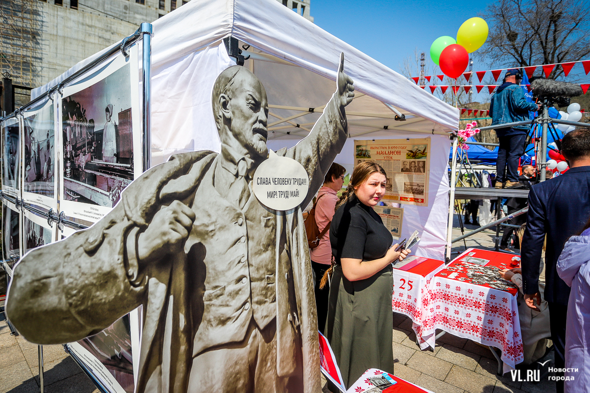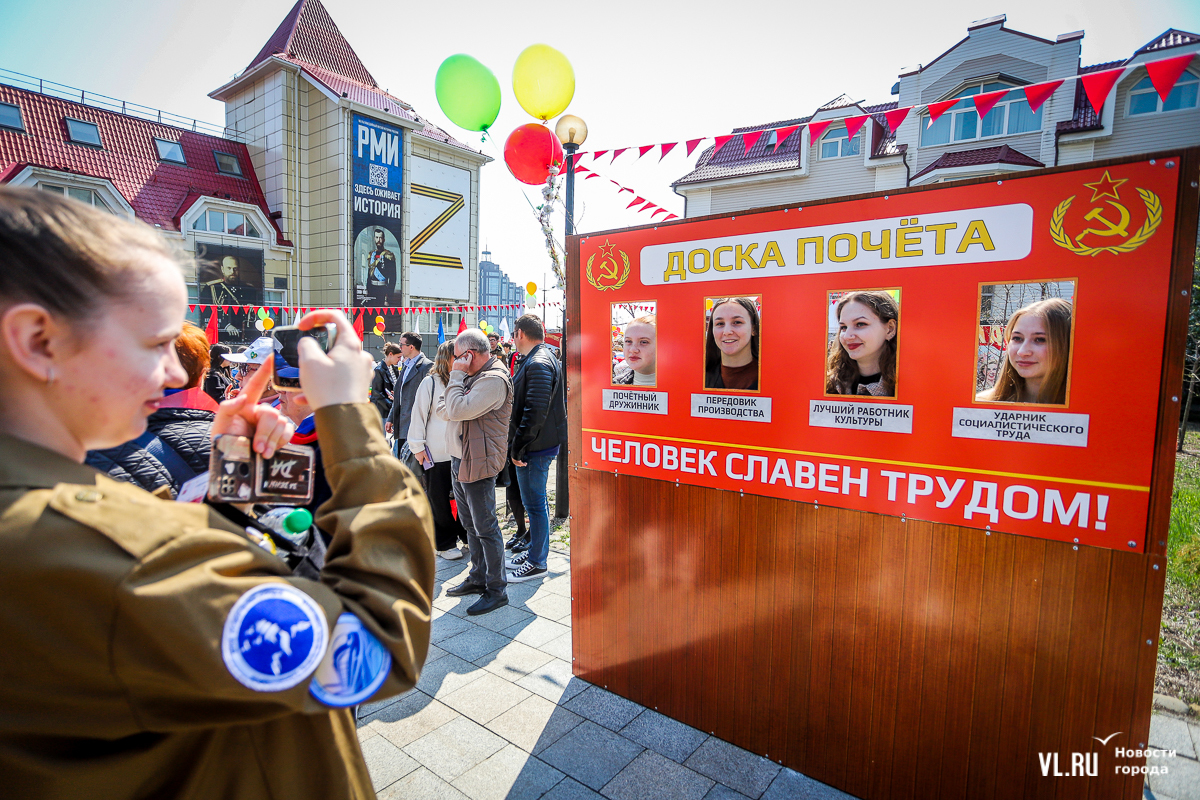 После выступления главы Приморского края начался концерт вокальных и танцевальных коллективов. Здесь же развернулось несколько интерактивных фотозон. Например, можно посидеть в советских интерьерах и позвонить со старого дискового телефона, оценить макет ракеты «Восток», почитать афиши советского кино или полистать юбилейные книги трудовой доблести. Тут же – несколько стендов с историей праздника, который учредили в 1900 году и называли Днём борьбы трудящихся за свои права, и выставка «1 Мая в архивных документах и фотографиях». Можно посмотреть на фото женщин рабочих профессий, снятых в Приморье с 40-х до 80-х годов XX века.