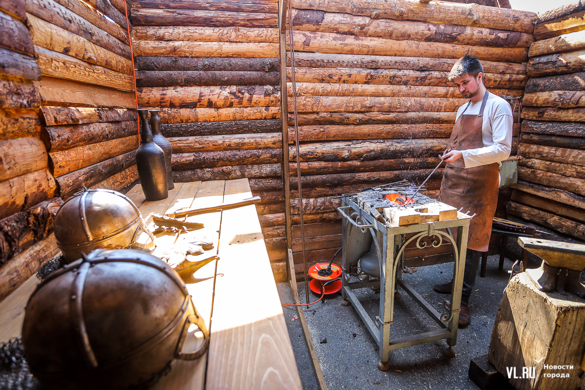 В глубине парка сделали три небольшие интерактивные зоны. Первая – с двумя «Жигули», в которые можно было сесть для фото. Вторая – мастер-классы по езде на велосипедах, в том числе довольно экзотического вида. Третья – «Деревня кузнеца», которую уже показывали на Масленице. Здесь всё так же – вход сторожат два удалых молодца во всеоружии, внутри работает кузнец, стоит макет избы в натуральную величину, можно примерить доспехи и оружие средневекового русского воина.