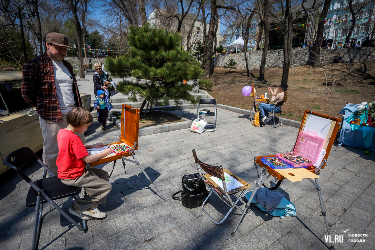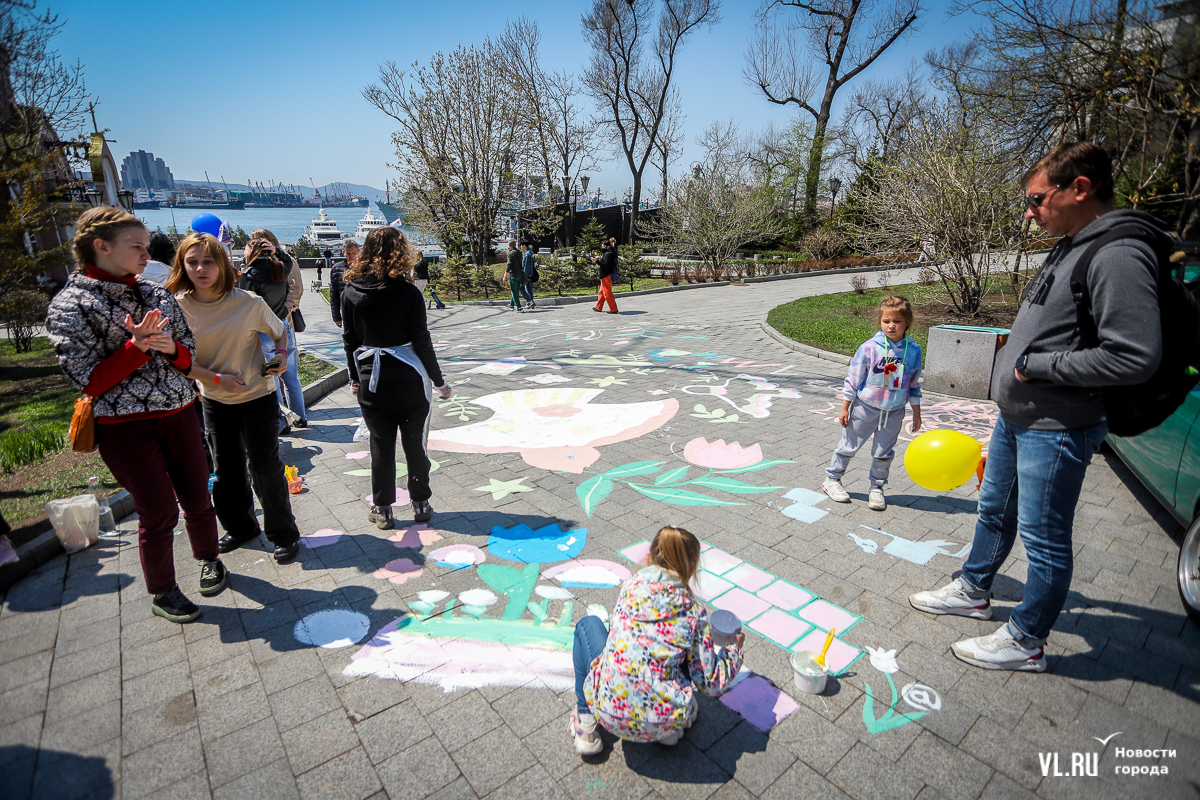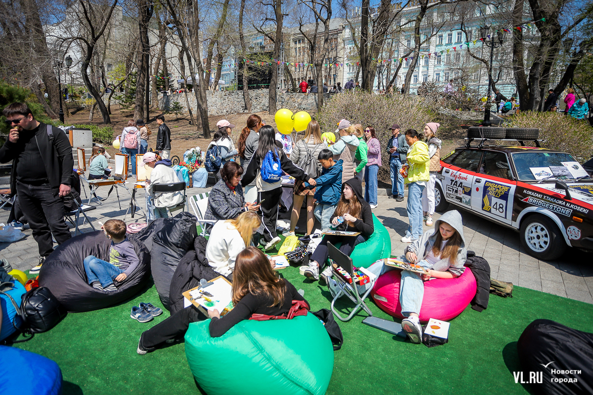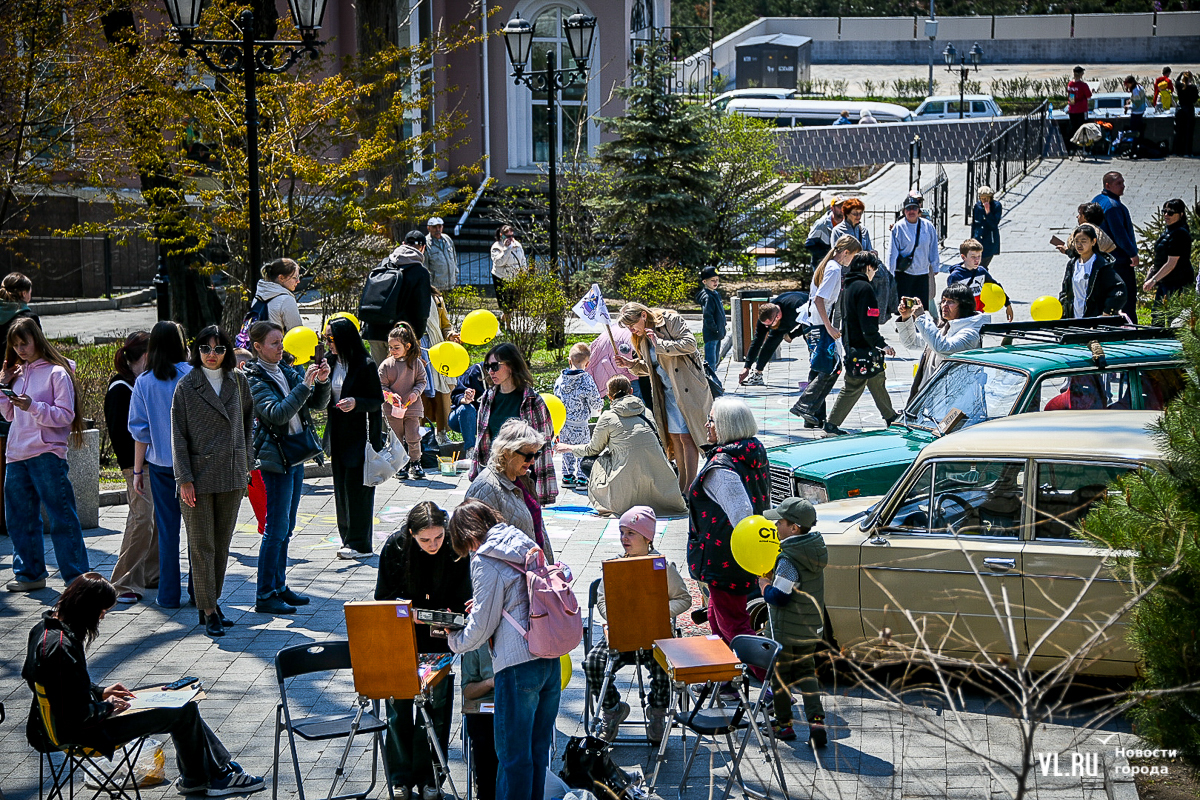 Чуть поодаль от стоянки ретроавтомобилей дети и взрослые красками пастельных тонов создают на плитке сквера большую картину с голубями.