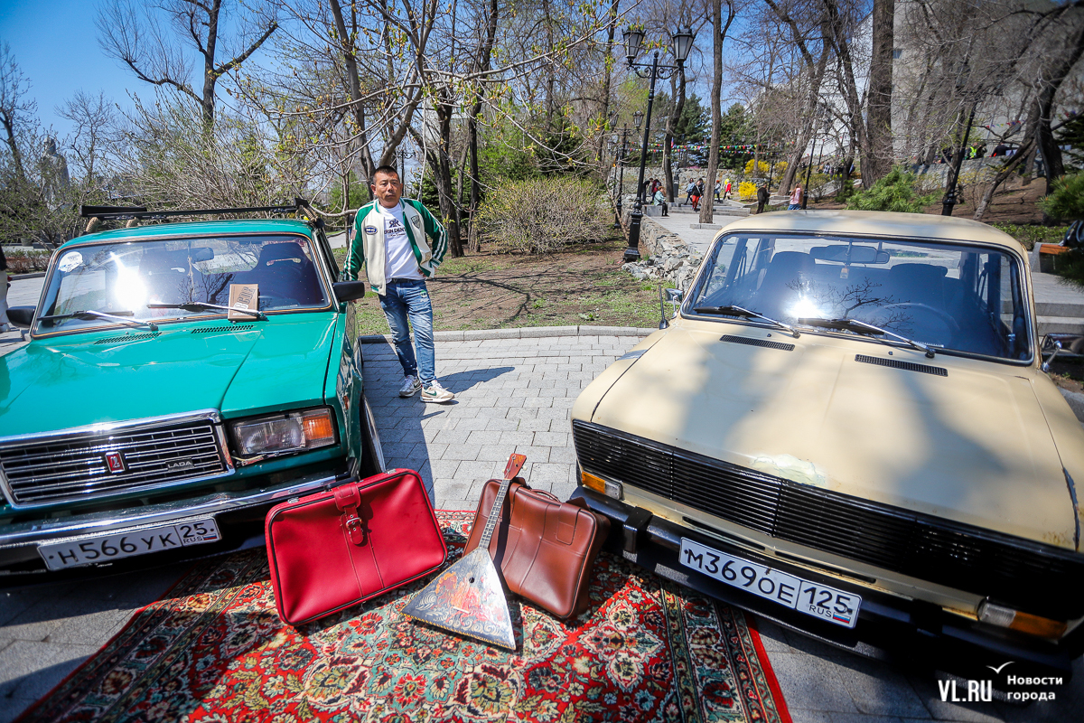 Если спуститься вниз от Триумфальной арки, можно попасть в зону ретроавтомобилей. Горожане здесь фотографируются и с дорогими сердцу советского человека «Жигули», и с представителями классики японского автопрома.
