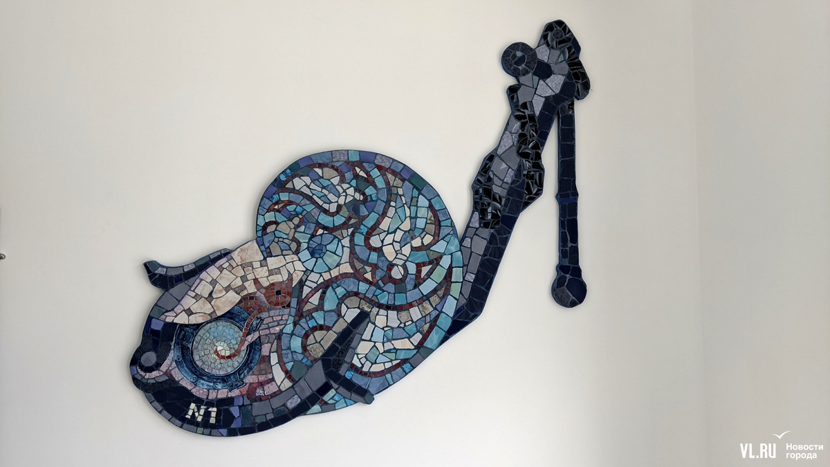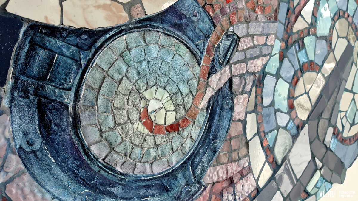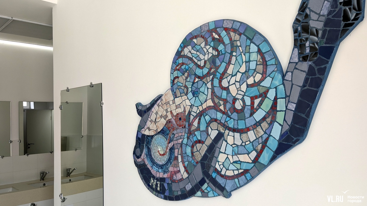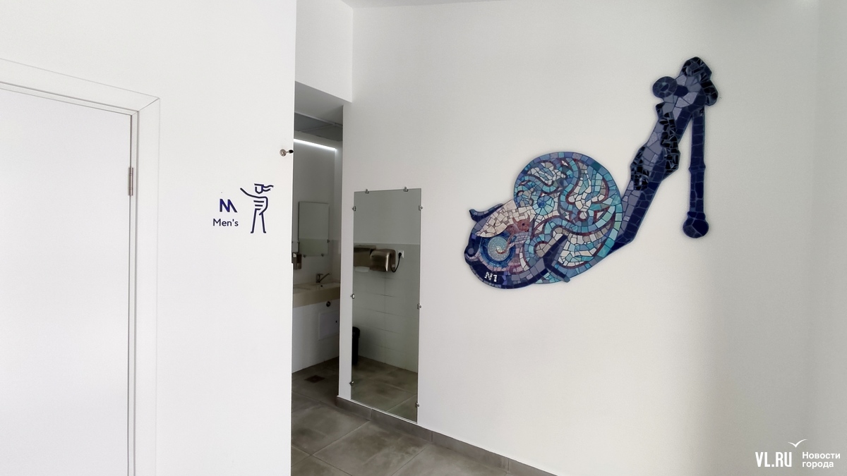 В недавно открытом общественном туалете на площади Адмирала Фокина во Владивостоке появились два арт-объекта. Это абстрактные мозаики с элементами фрески – отдельные элементы разглядеть сперва сложно, но так и было задумано. На стенах общественной уборной изображены якорь, иллюминатор, головоногий моллюск, лобстер в сетях с поплавком и устрица.