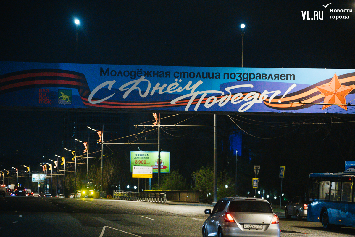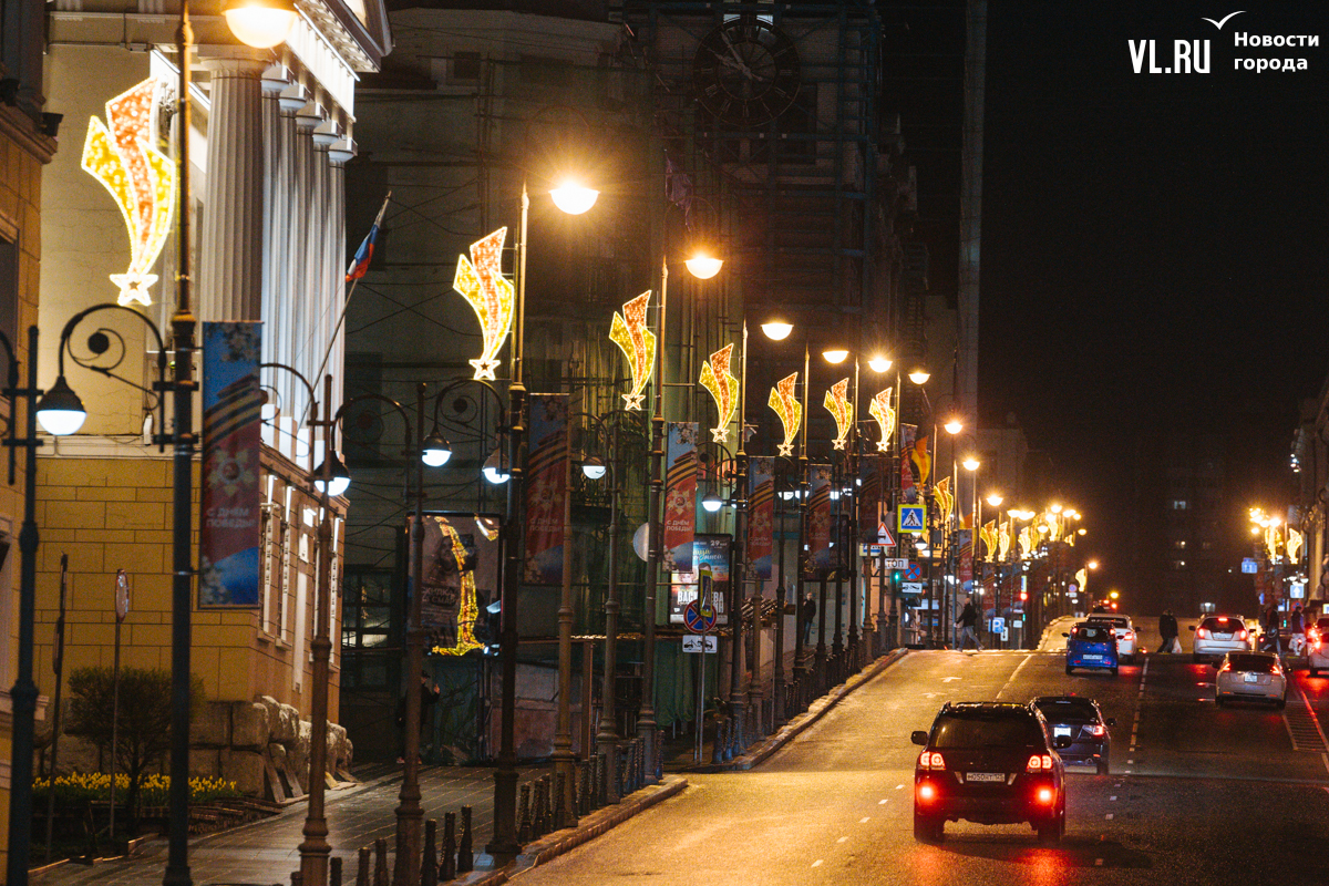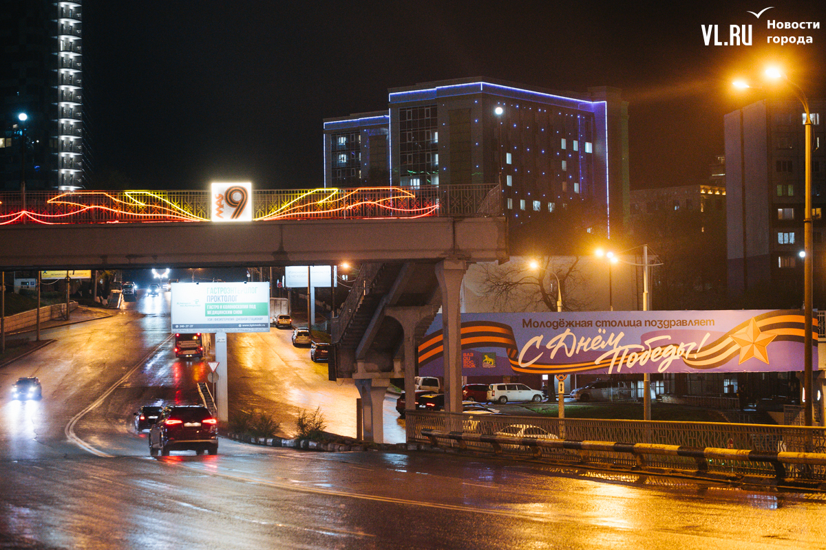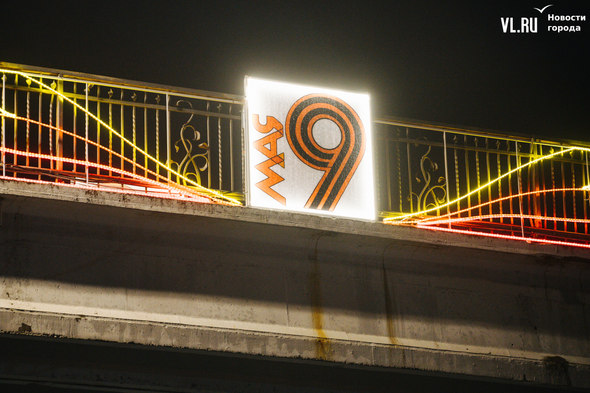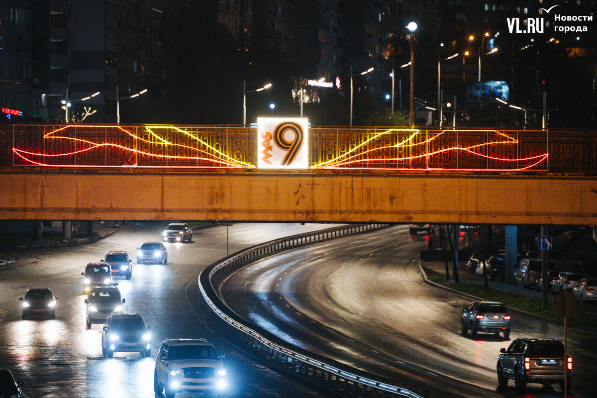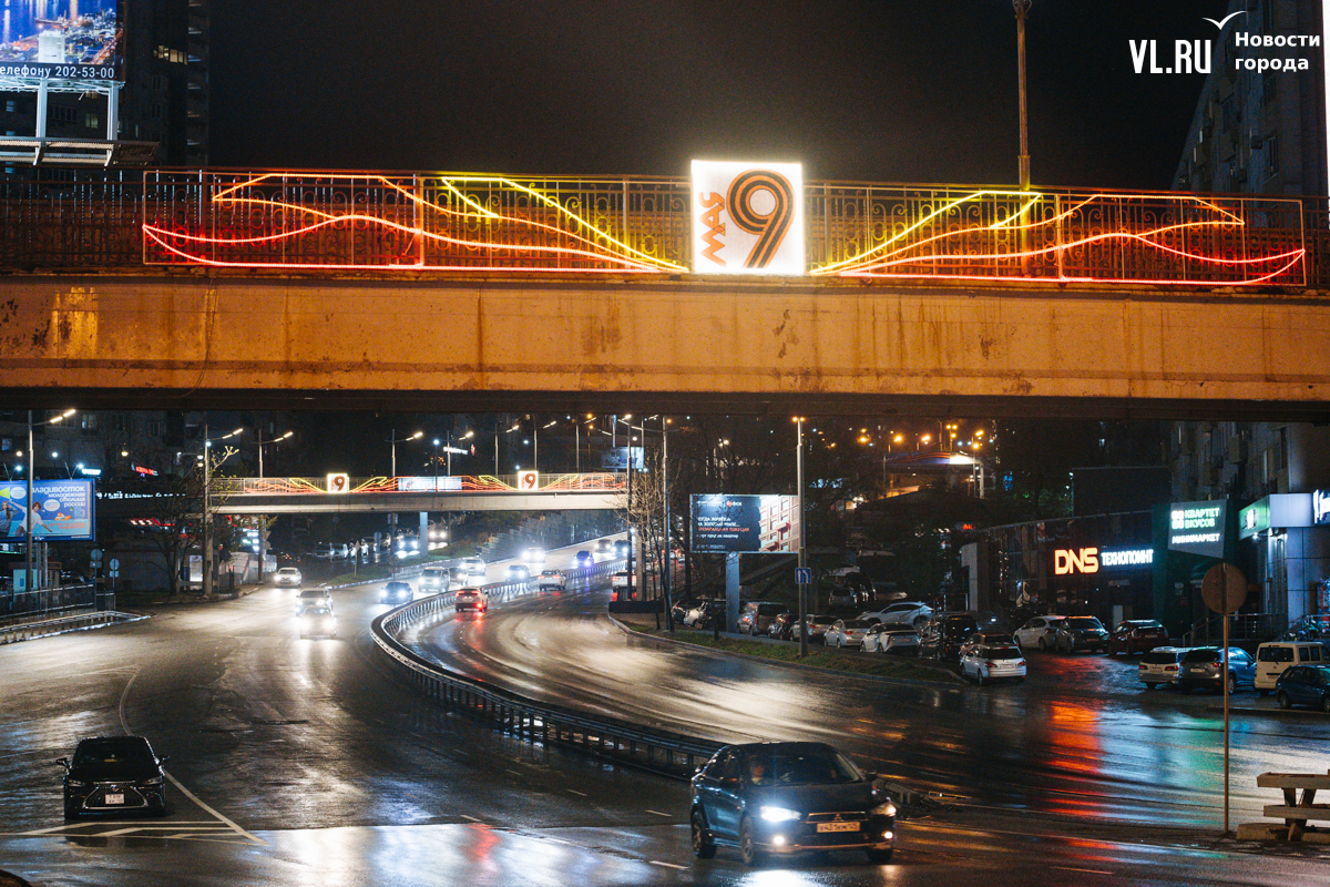 Готовность Владивостока ко Дню Победы теперь видна даже ночью: улицы города украсили праздничной иллюминацией. По заказу ВПЭС специалисты установили тематические конструкции на виадуках. А на опорах освещения появились падающие звёзды. Некоторые горожане считают, что к 9 Мая город выглядит ярче, чем к Новому году.