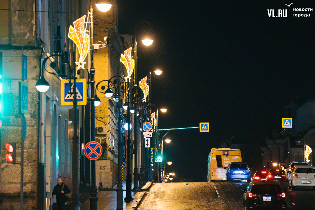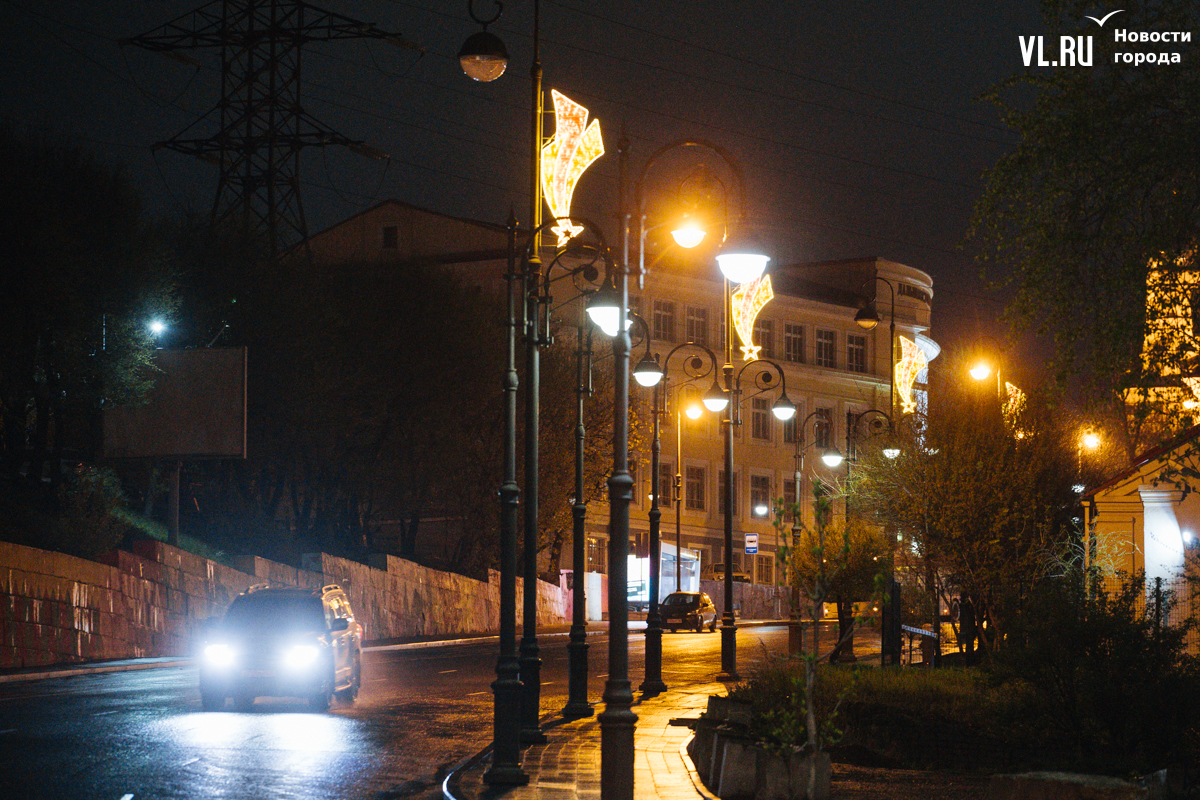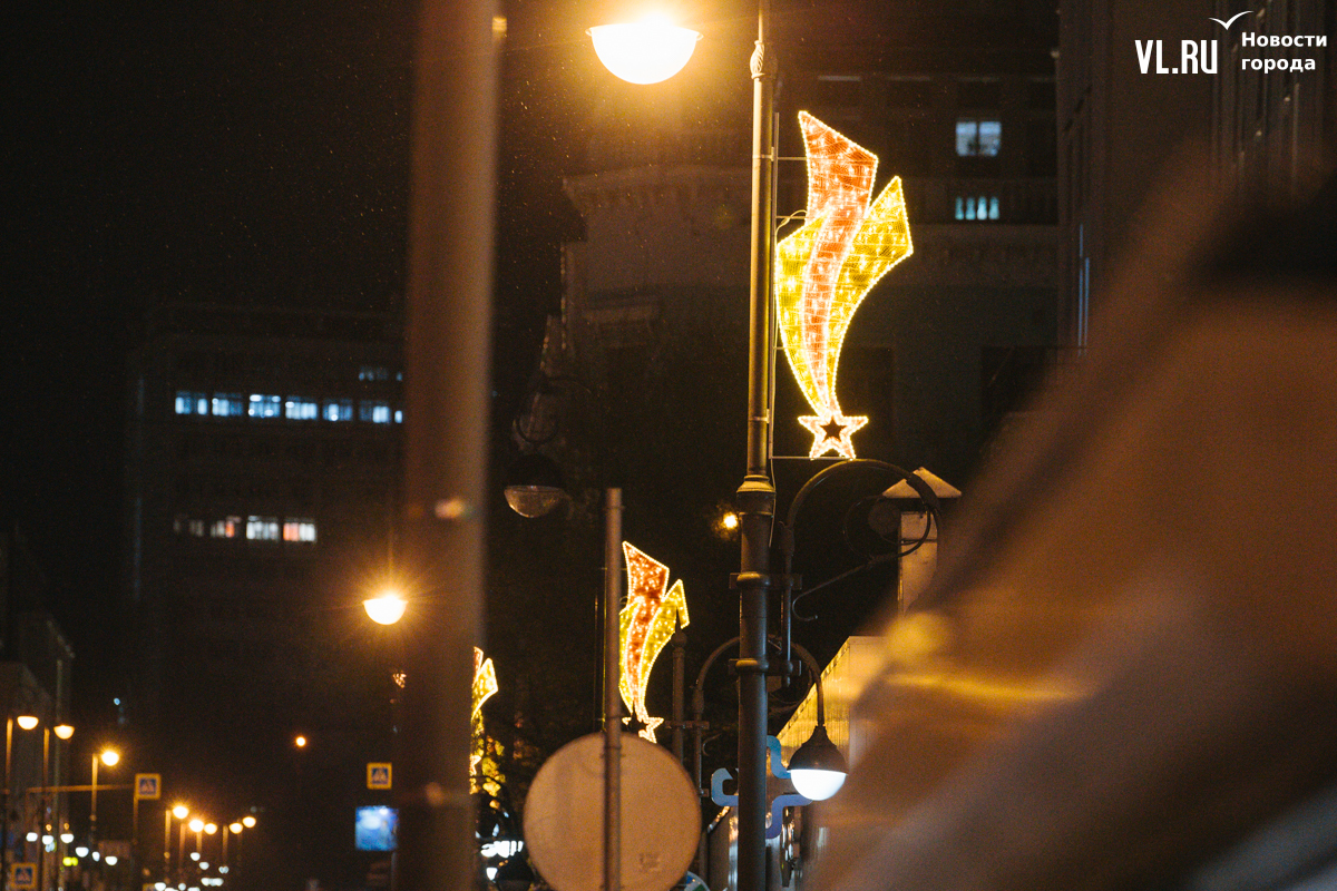 Праздничная иллюминация в виде падающей звезды украшает опоры уличного освещения на проспектах Океанский и 100-летия Владивостока, а также на улицах Светланской и Алеутской.