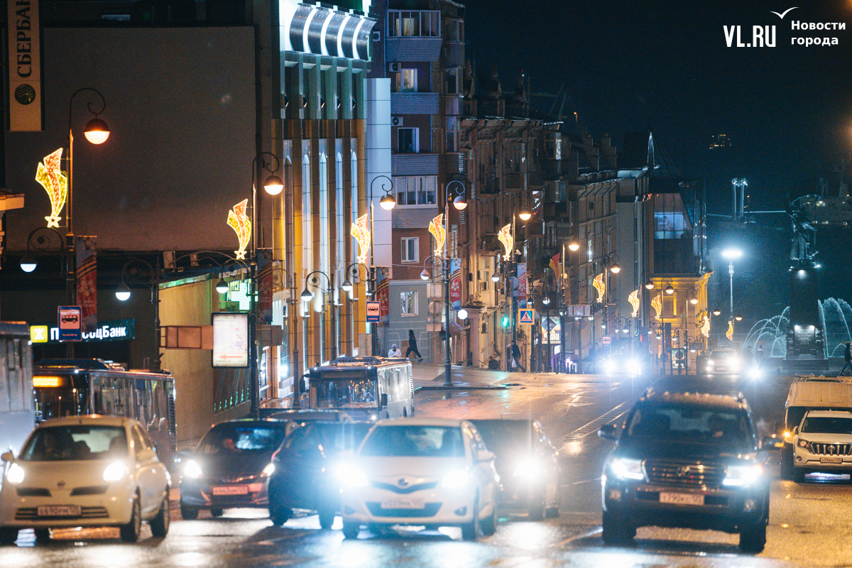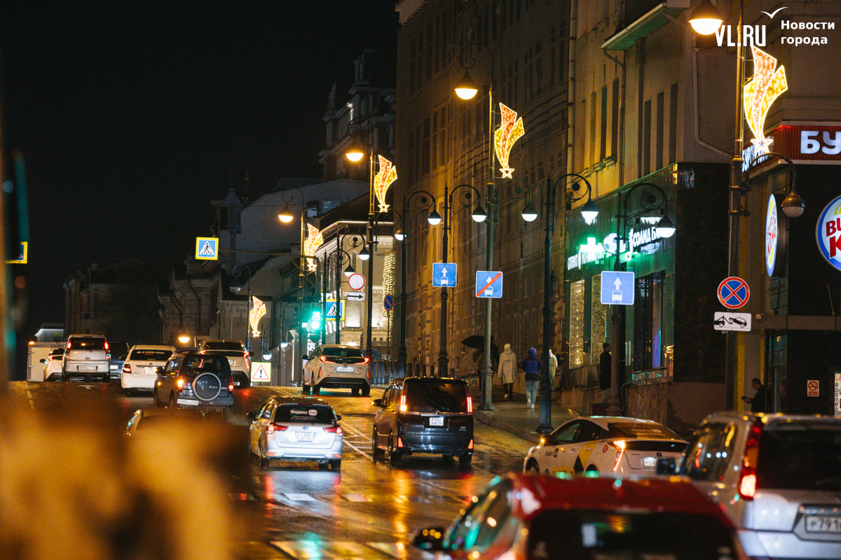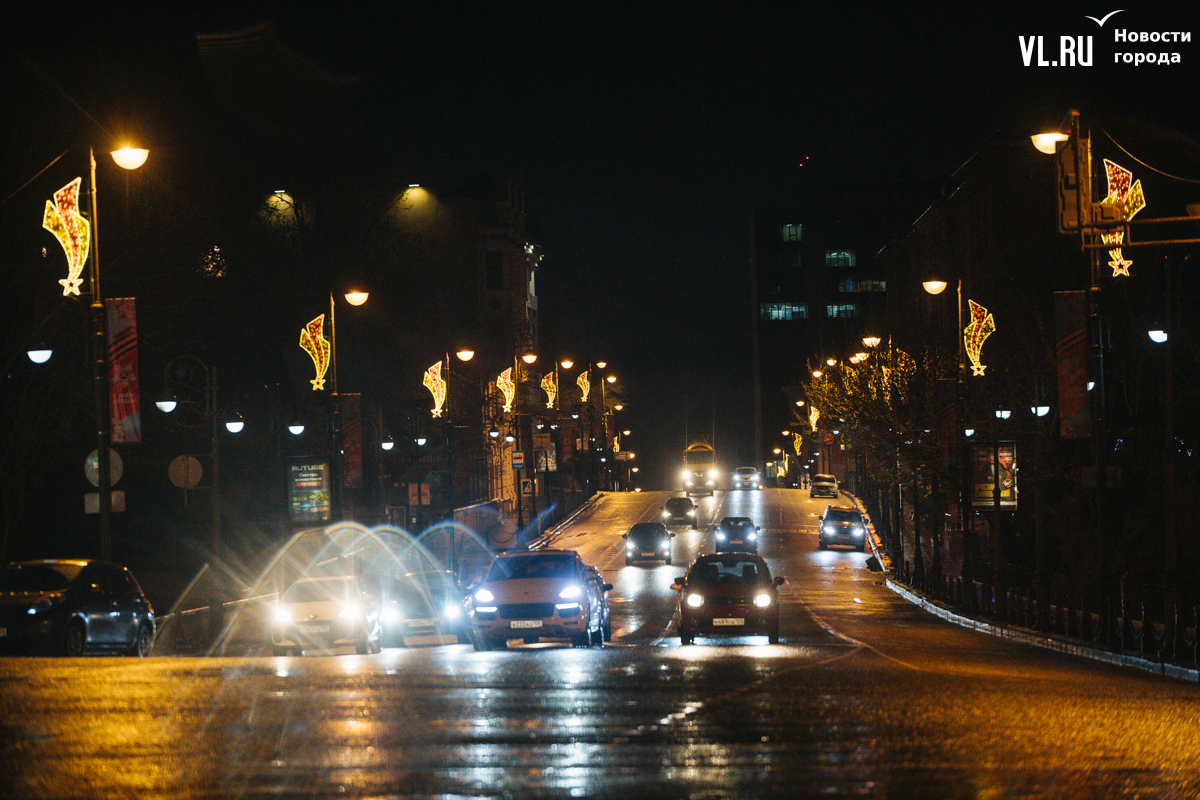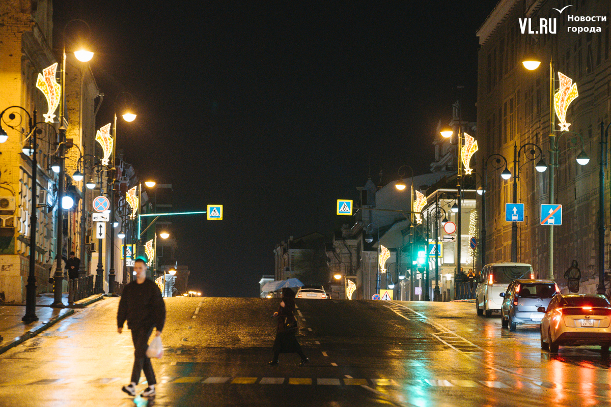 Праздничная иллюминация в виде падающей звезды украшает опоры уличного освещения на проспектах Океанский и 100-летия Владивостока, а также на улицах Светланской и Алеутской.