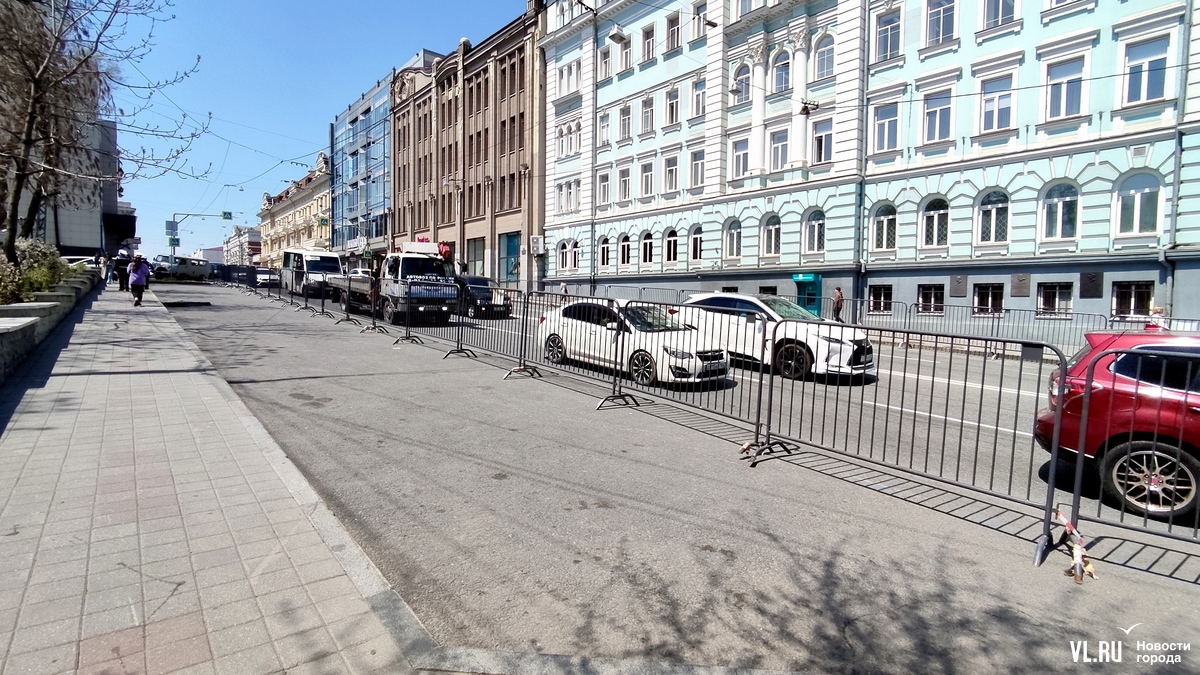 Сейчас часть тех заборов, которыми накануне ограждали «чистую зону» на Светланской от остановки «Лазо», сложены в стопку вдоль дороги. А часть и вовсе оставили на своих местах. По всей видимости, решили не убирать их после репетиции, поскольку уже завтра они снова понадобятся. Попасть 9 мая на парад Победы, напомним, можно будет только через рамки металлоискателей, установленные в определённых местах.