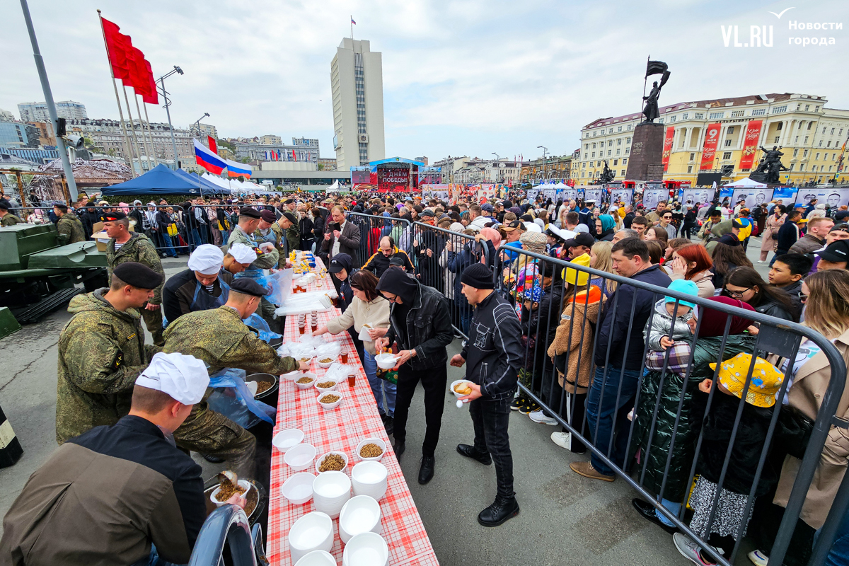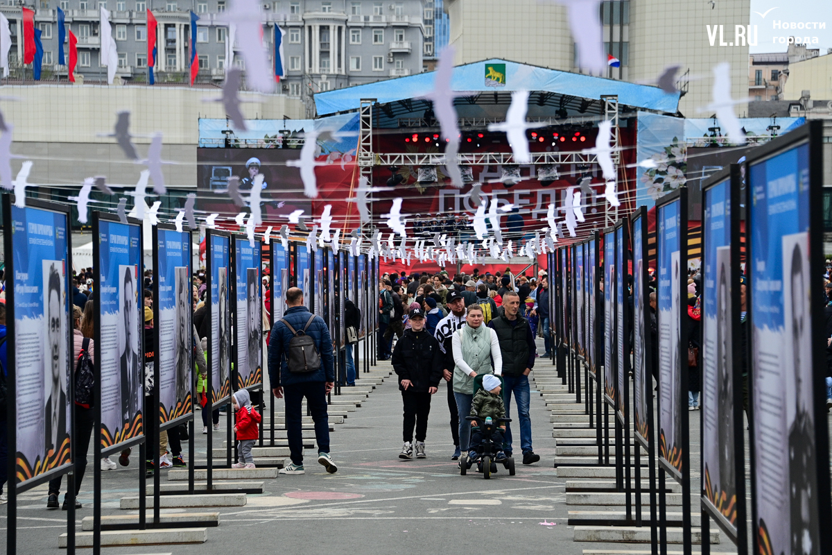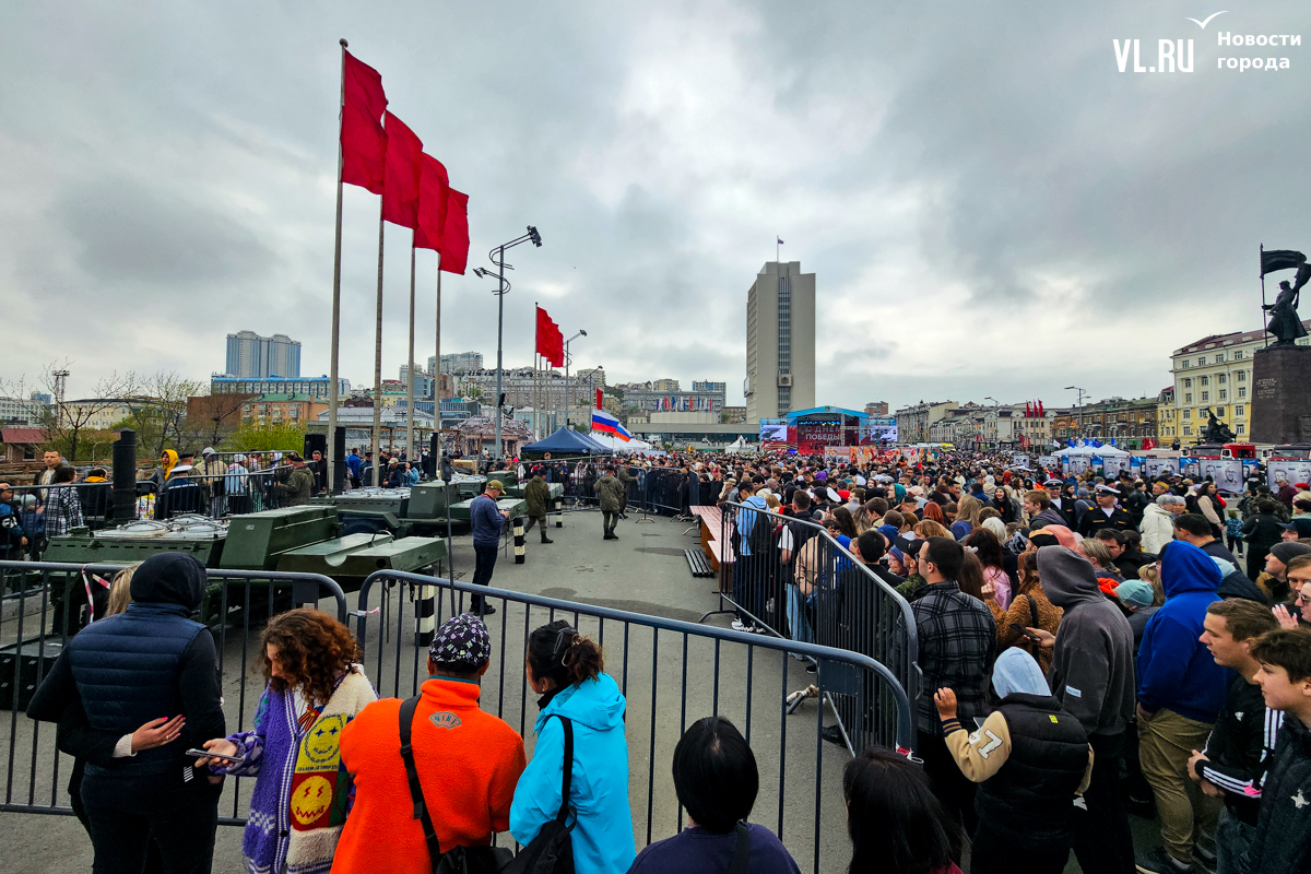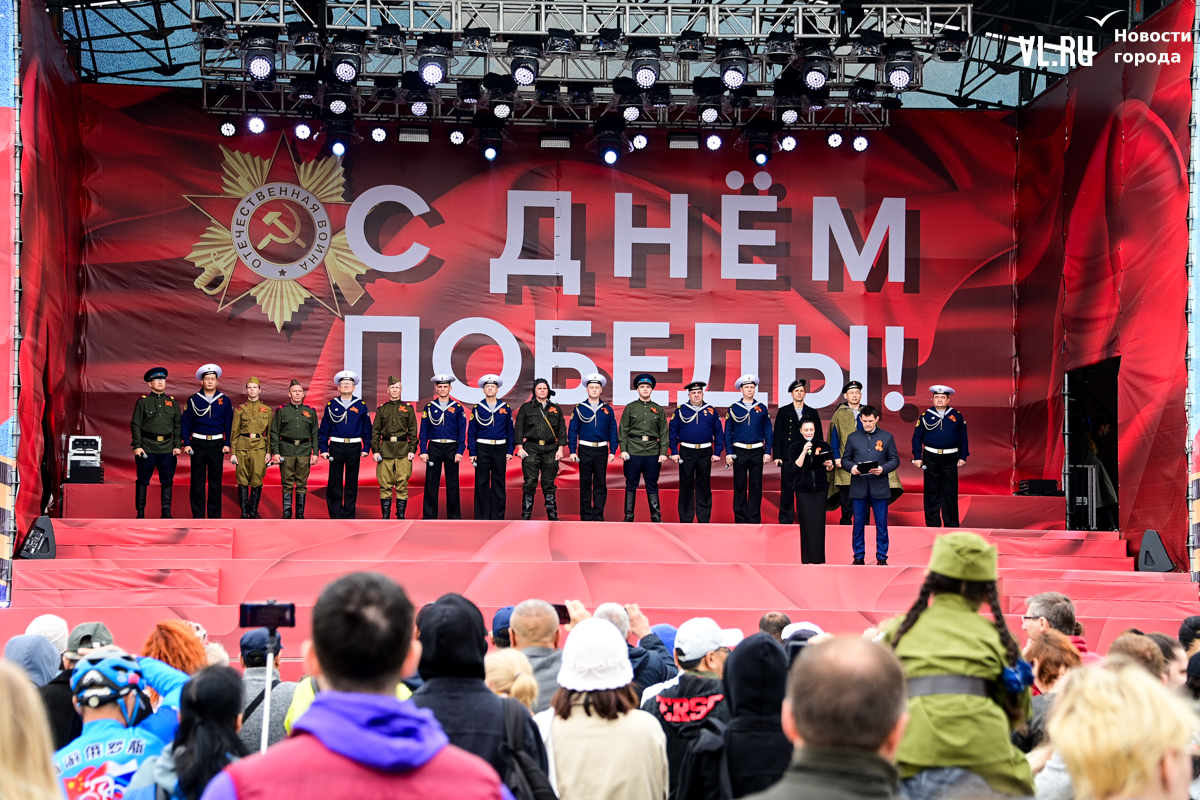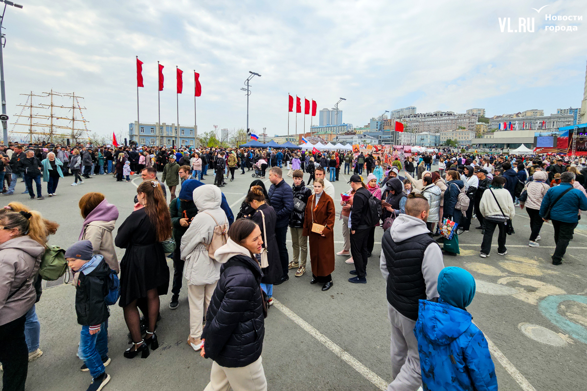 После парада празднование Дня Победы продолжилось на центральной площади Владивостока. Со сцены сегодня звучат песни военных лет, с фотографий выставок на горожан смотрят герои-приморцы и деятели искусства, участвовавшие в Великой Отечественной войне. Дети примеряли на себя роль пожарных или водружали «Знамя Победы» на крыше «Рейхстага», пройдя полосу препятствий. Взрослые читали фронтовые письма и медицинские книги военных лет. Горожане всех возрастов устанавливают рекорд по отжиманиям и пробуют солдатскую кашу.