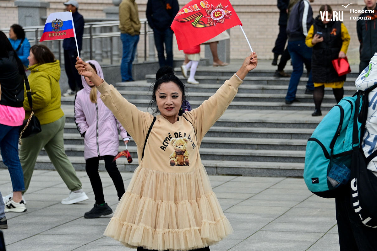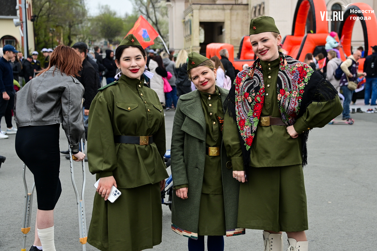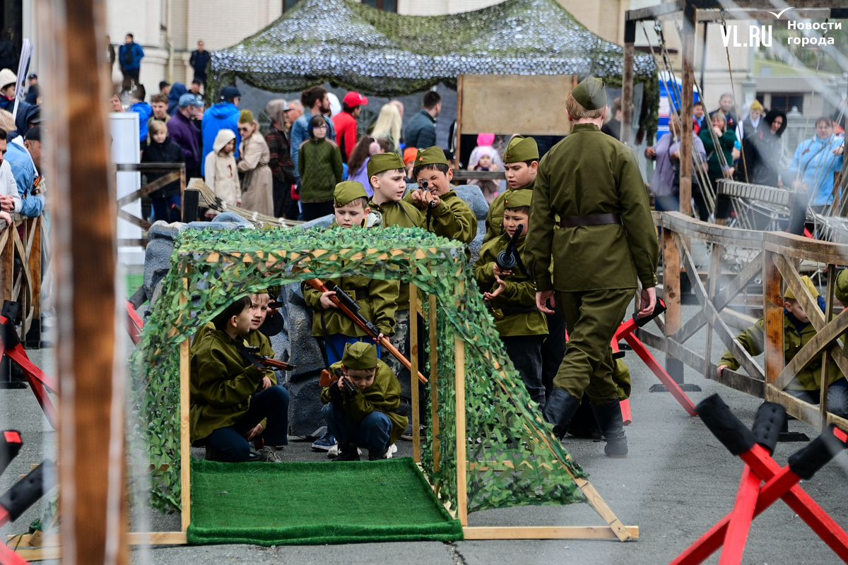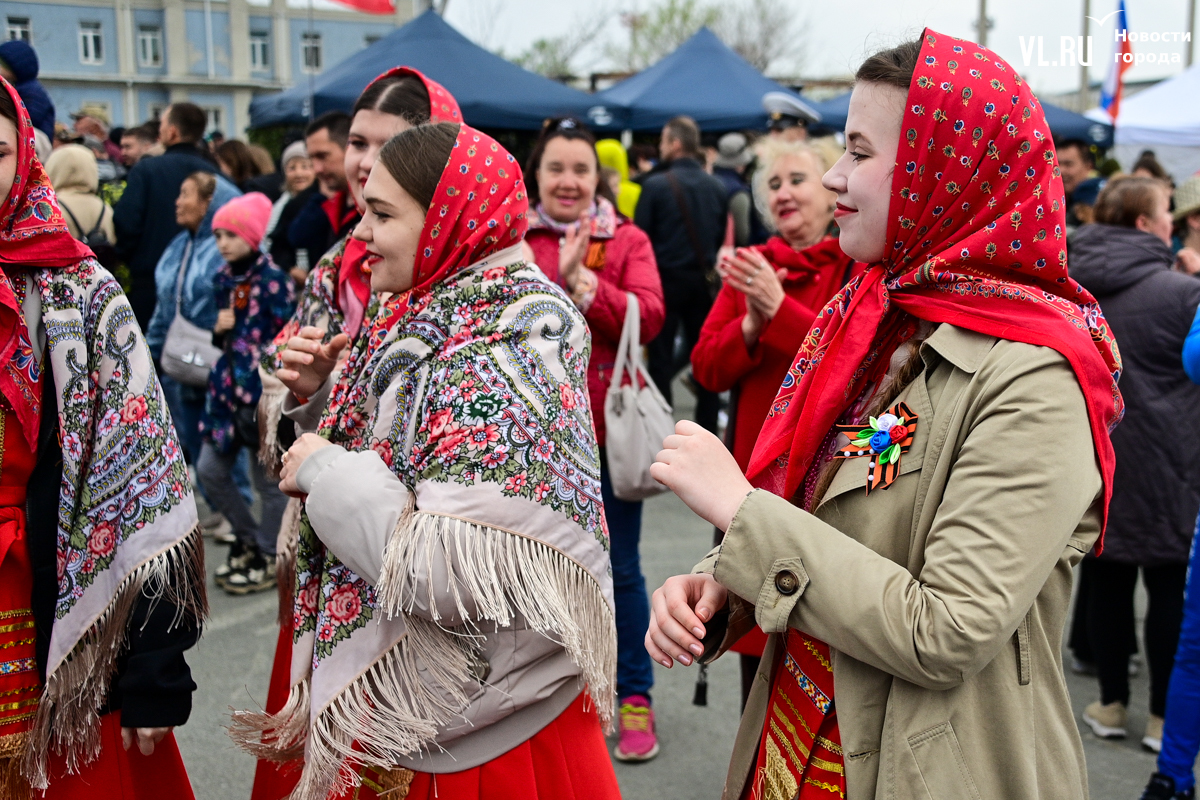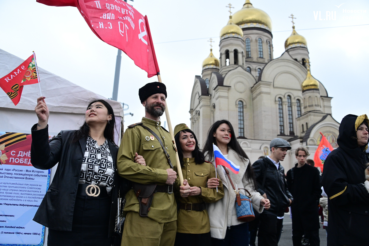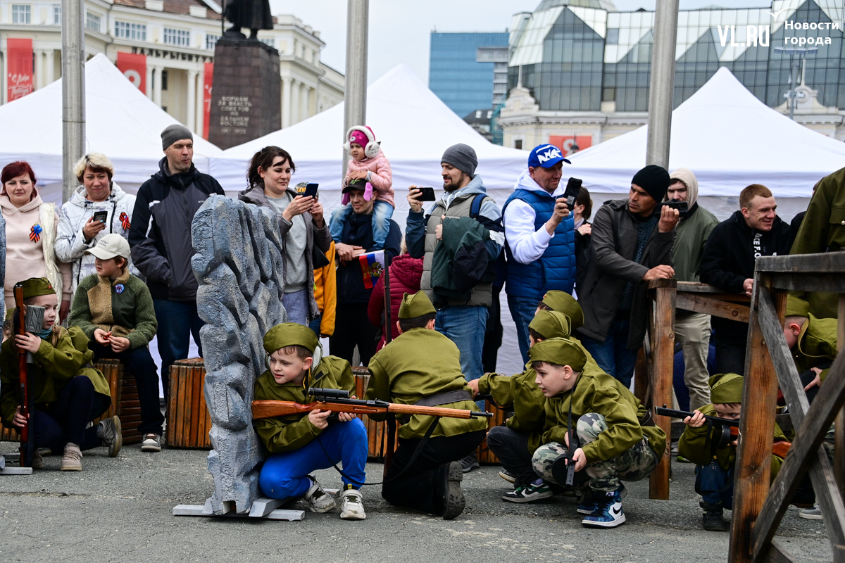 После парада празднование Дня Победы продолжилось на центральной площади Владивостока. Со сцены сегодня звучат песни военных лет, с фотографий выставок на горожан смотрят герои-приморцы и деятели искусства, участвовавшие в Великой Отечественной войне. Дети примеряли на себя роль пожарных или водружали «Знамя Победы» на крыше «Рейхстага», пройдя полосу препятствий. Взрослые читали фронтовые письма и медицинские книги военных лет. Горожане всех возрастов устанавливают рекорд по отжиманиям и пробуют солдатскую кашу.