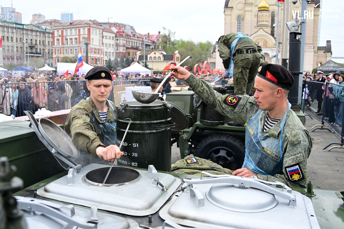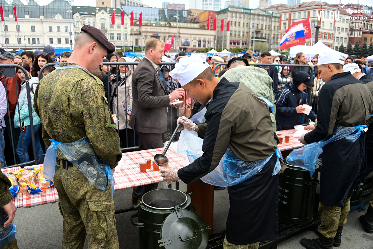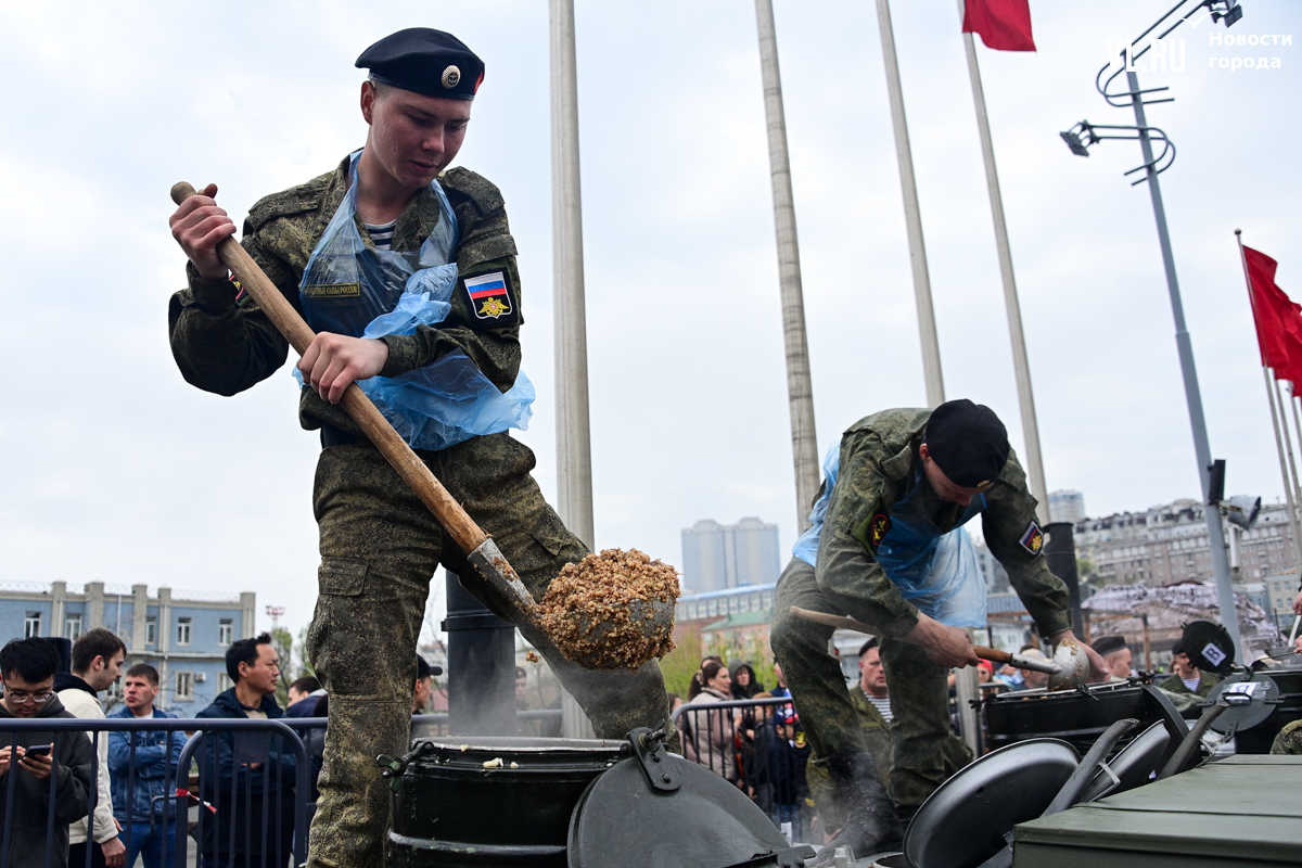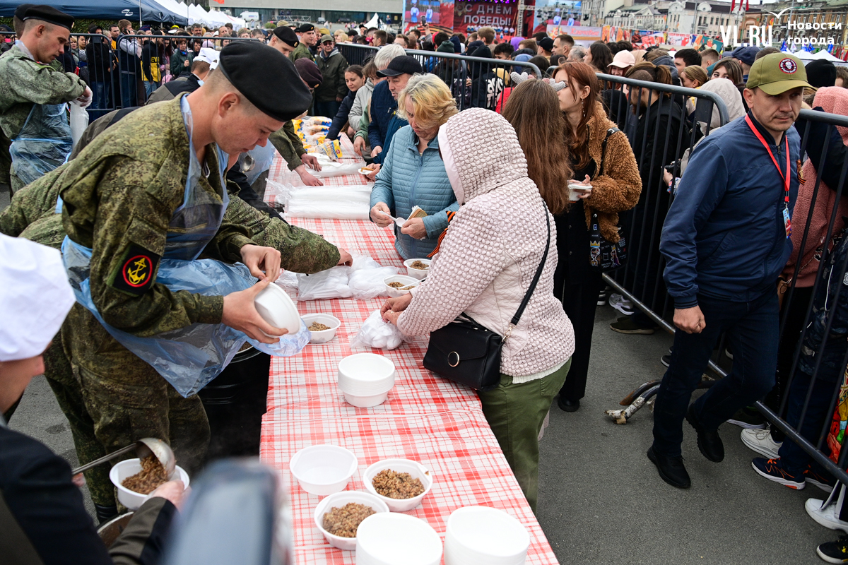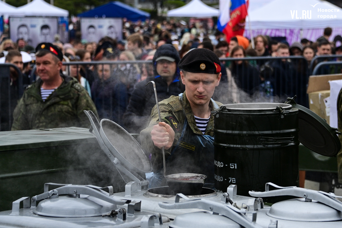 Неподалёку от полосы препятствий расположилась полевая кухня – здесь готовили солдатскую кашу. Желающие получить свою порцию в начале праздника выстроились в гигантскую очередь, которая растянулась на половину площади.