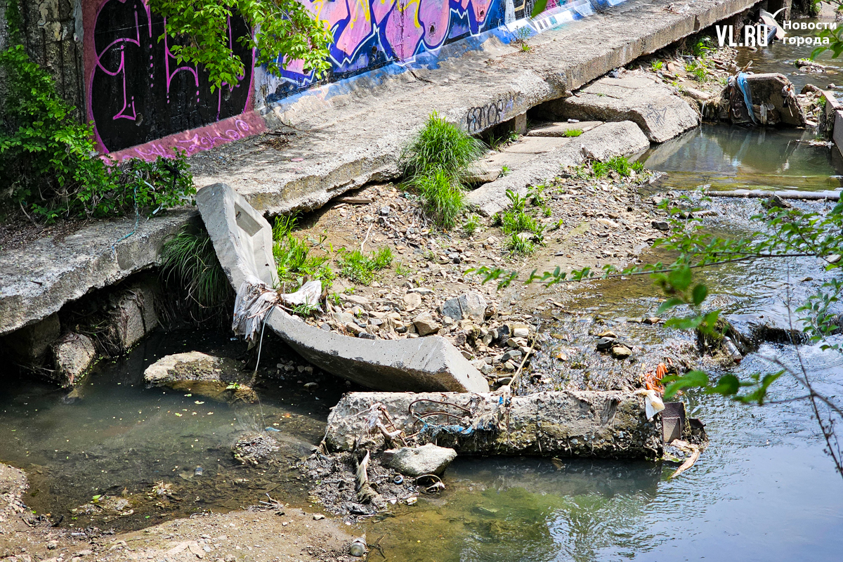 А вот если пойти гулять по Бородинской хотя бы до завода «Дальприбор», как это сделал фотограф Новостей VL.ru, то можно наблюдать уже привычную картину: 50-летние бетонные блоки и трубы попадали в реку. Обмелевшая пока река лениво окатывает их на пути к Амурскому заливу. Неизвестно откуда в районе одного из заводов в реку стекает водопад. Из старых водопропускных труб течёт мутная жидкость неизвестного происхождения. Но также по берегам можно заметить уже и новые трубы – пластиковые гофры, которые явно положили не далее чем несколько лет назад. Что стекает в реку из них, тоже неизвестно.