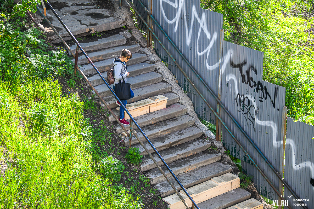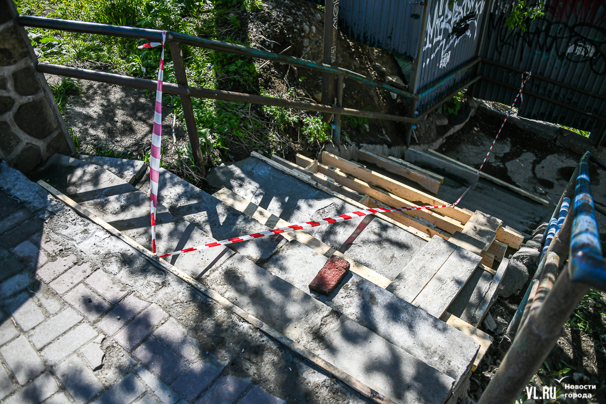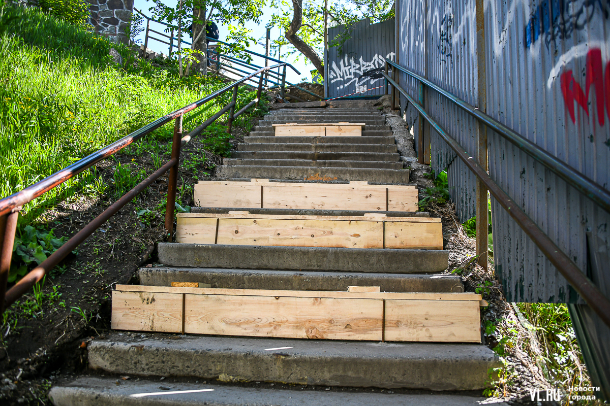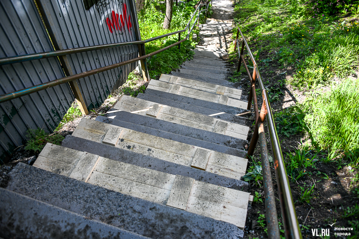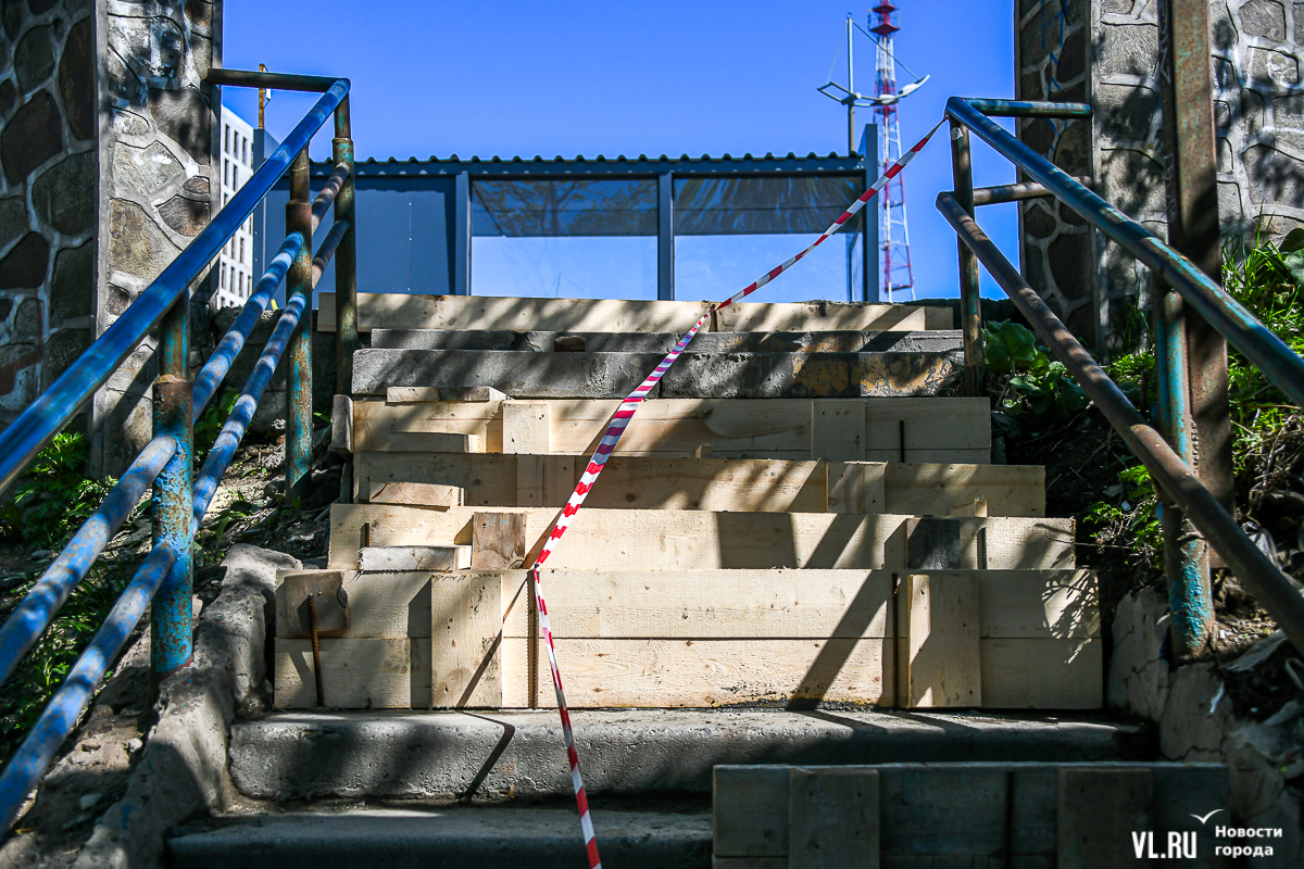 Подведомственное учреждение мэрии, МКУ «Зелёный Владивосток», начало локальный ремонт лестницы около верхней станции фуникулёра. Работы планируют закончить до конца мая, потому что уже с 1 июня фуникулёр на месяц закроется на ремонт и проход по лестнице окажется единственной альтернативой.