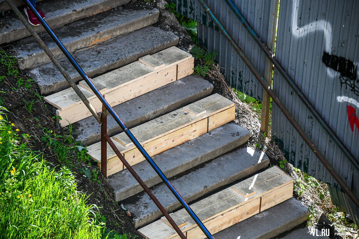 Целыми маршами лестницу не меняют, вместо этого идёт не такой затратный по финансам и времени локальный ремонт. Сейчас восстановлены около 10 ступеней – аварийные конструкции демонтировали, вместо них установили опалубку и залили новый бетон. Проход при этом не перекрыт – для пешеходов сверху положили доски.