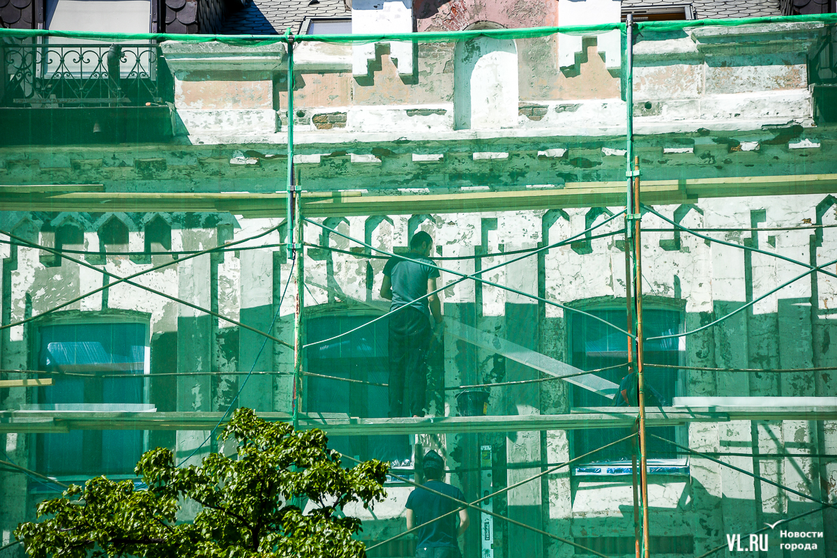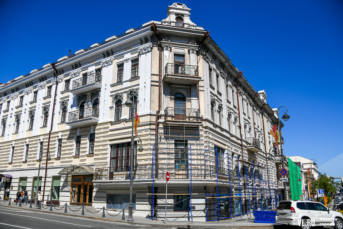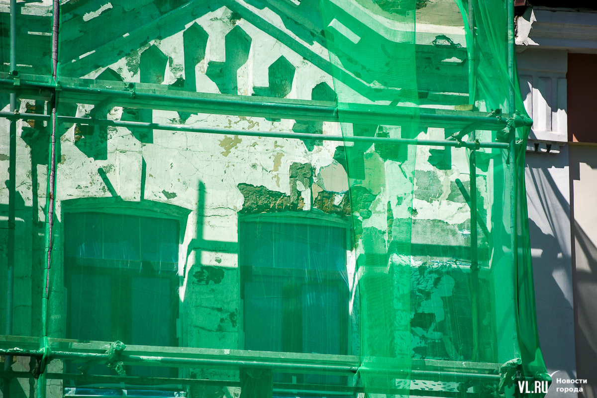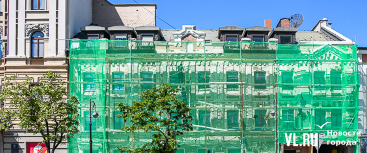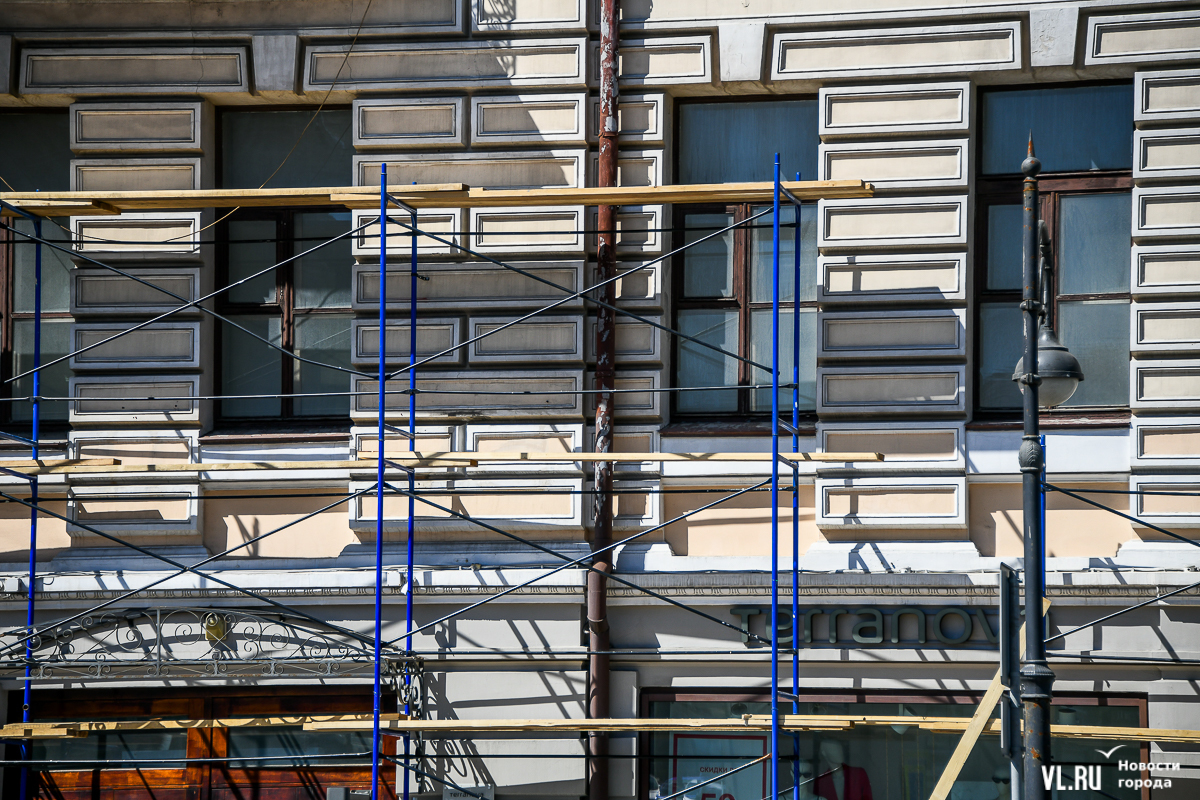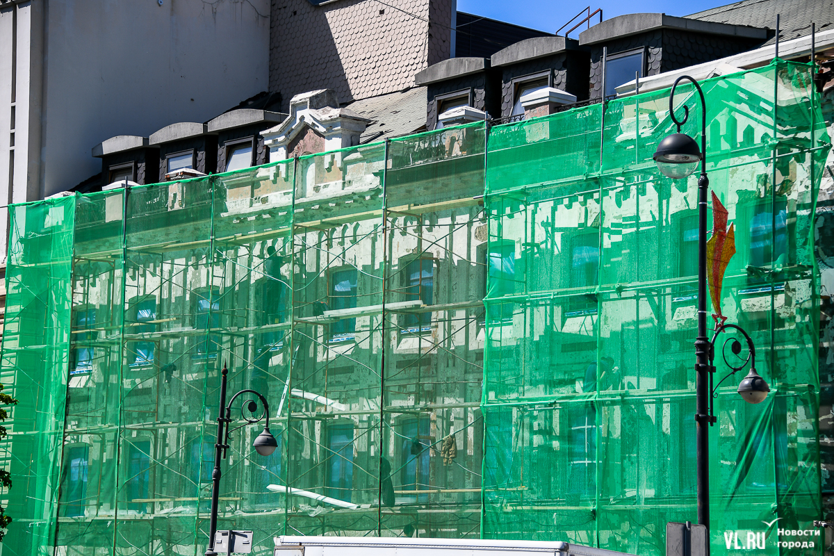 В центре Владивостока продолжается капитальный ремонт фасадов двух исторических зданий – ТЦ «Золотой Рог» (Алеутская, 20/Светланская, 13) и краевой филармонии (Светланская, 15). В первом случае работы проводит частный собственник, во втором заказчиком работ выступило краевое министерство культуры. Завершение их запланировано, соответственно, на конец июня и август.