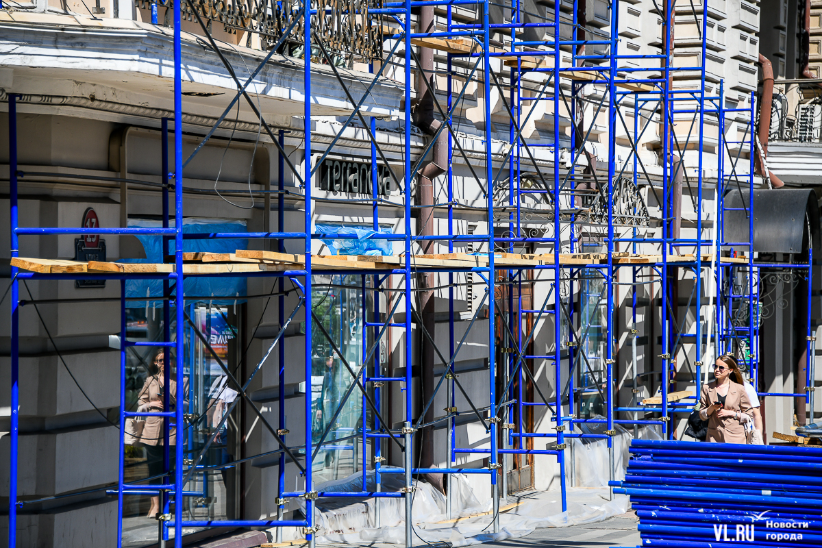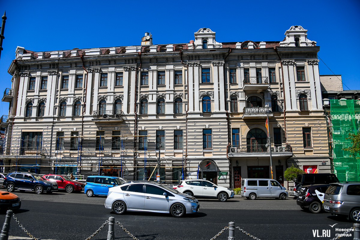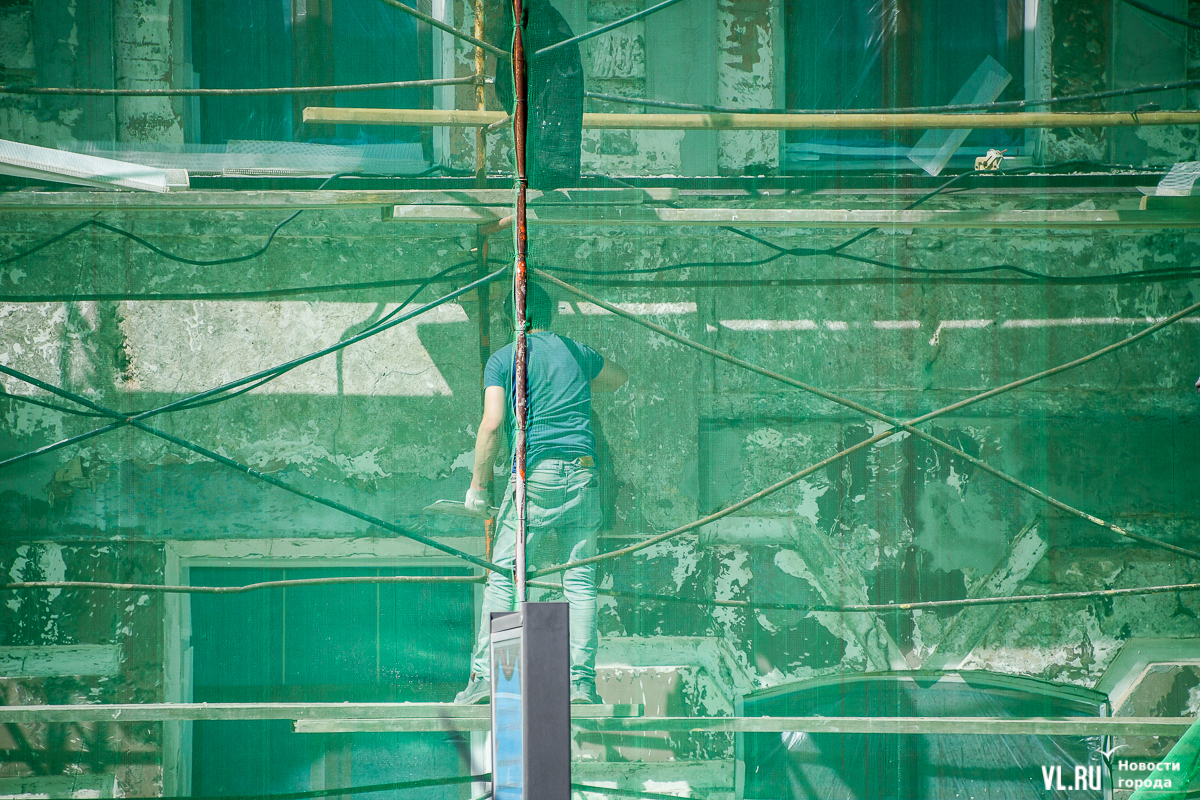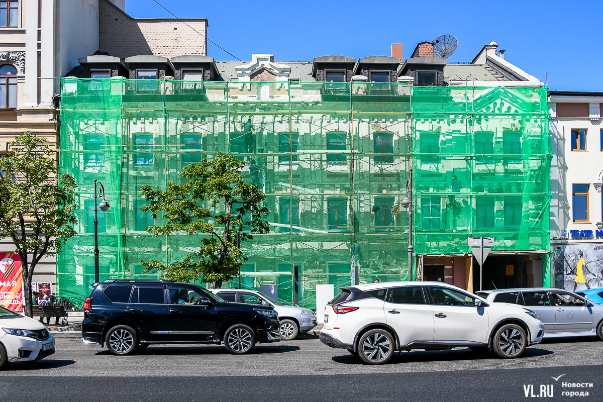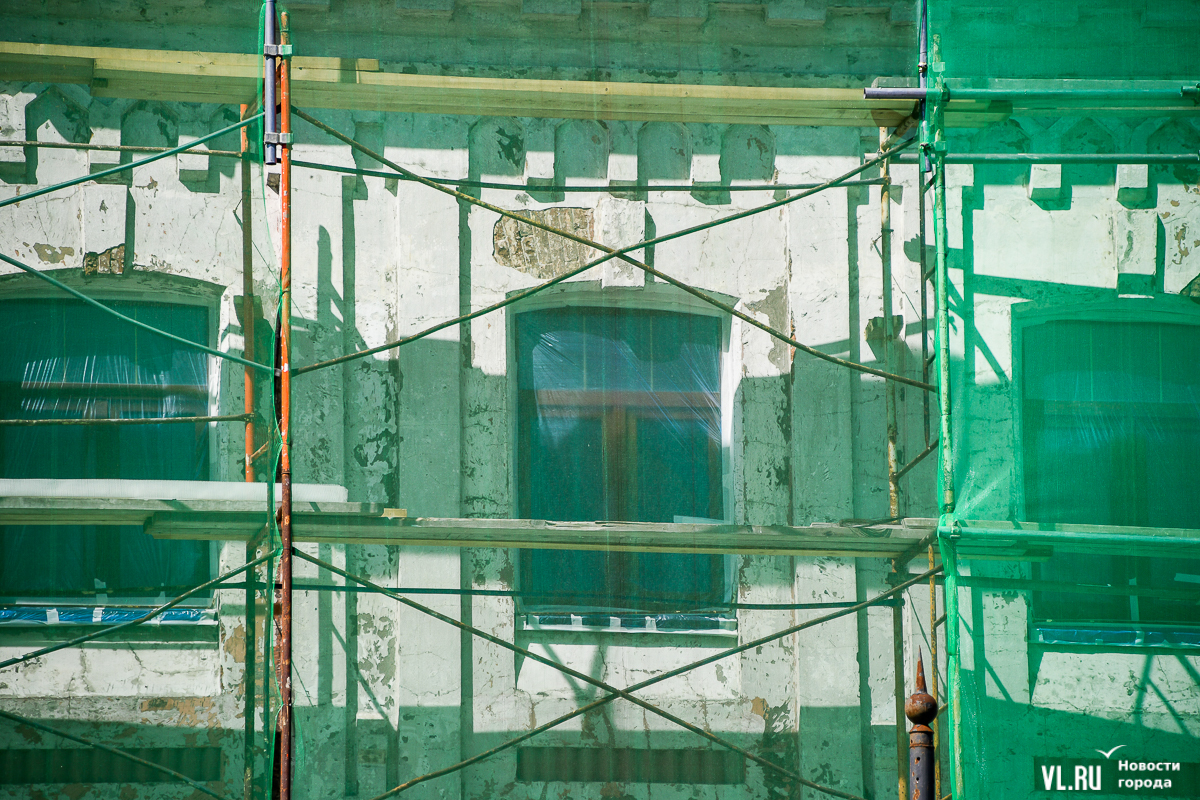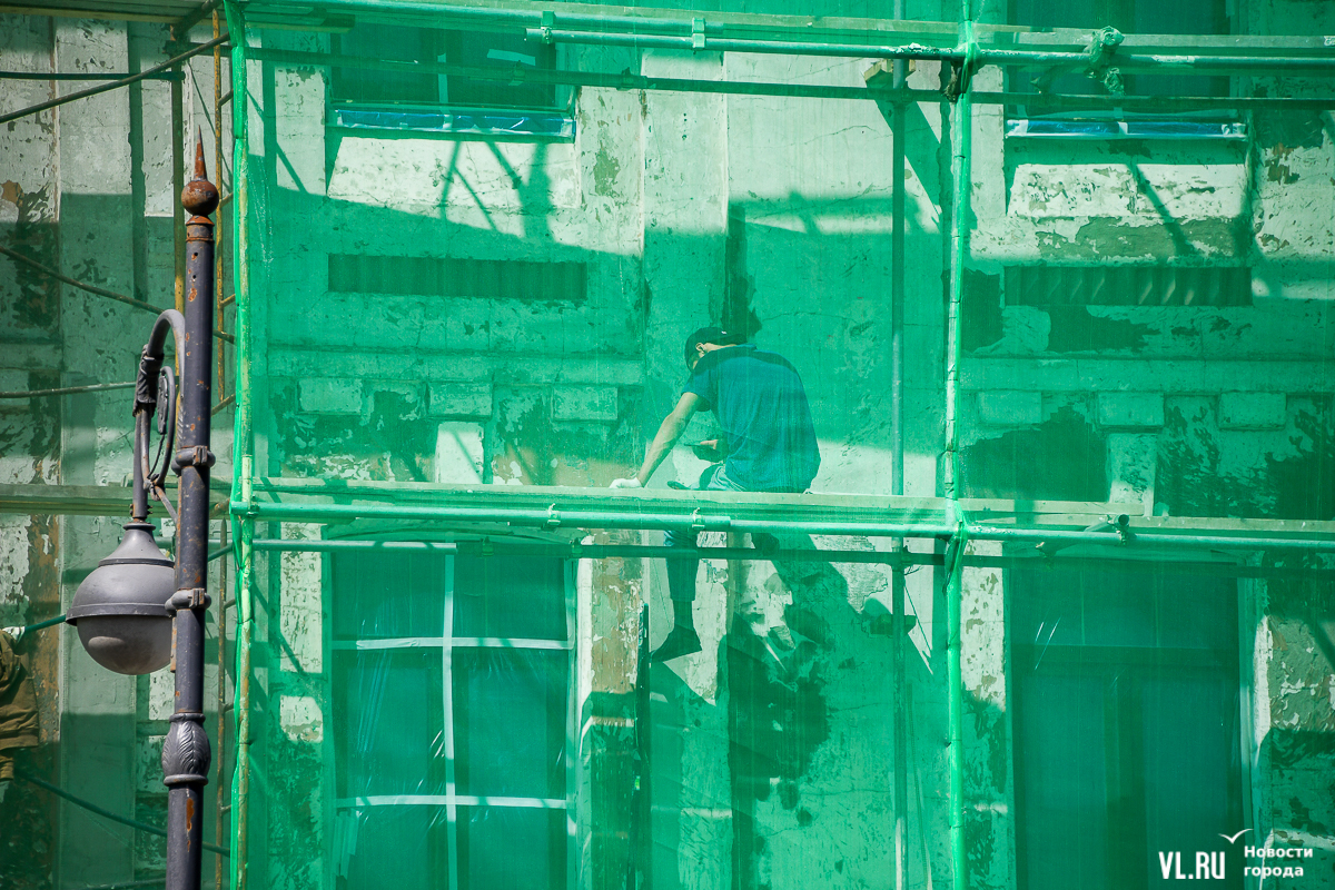 В центре Владивостока продолжается капитальный ремонт фасадов двух исторических зданий – ТЦ «Золотой Рог» (Алеутская, 20/Светланская, 13) и краевой филармонии (Светланская, 15). В первом случае работы проводит частный собственник, во втором заказчиком работ выступило краевое министерство культуры. Завершение их запланировано, соответственно, на конец июня и август.