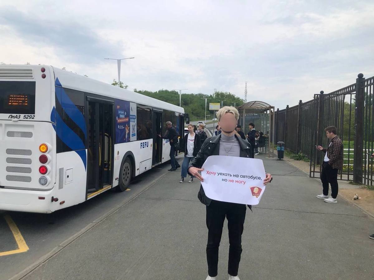 Мысли выйти на пикет не раз пробегали в головах студентов, вынужденных добираться до учёбы и домой на общественном транспорте. На фоне ребят с плакатами видны люди, спешащие на автобус. Больше всего их на остановке «Южные ворота» – именно туда после пар устремляются учащиеся и сотрудники ДВФУ, чтобы попытать удачу и занять сидячие места.