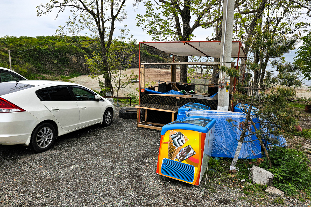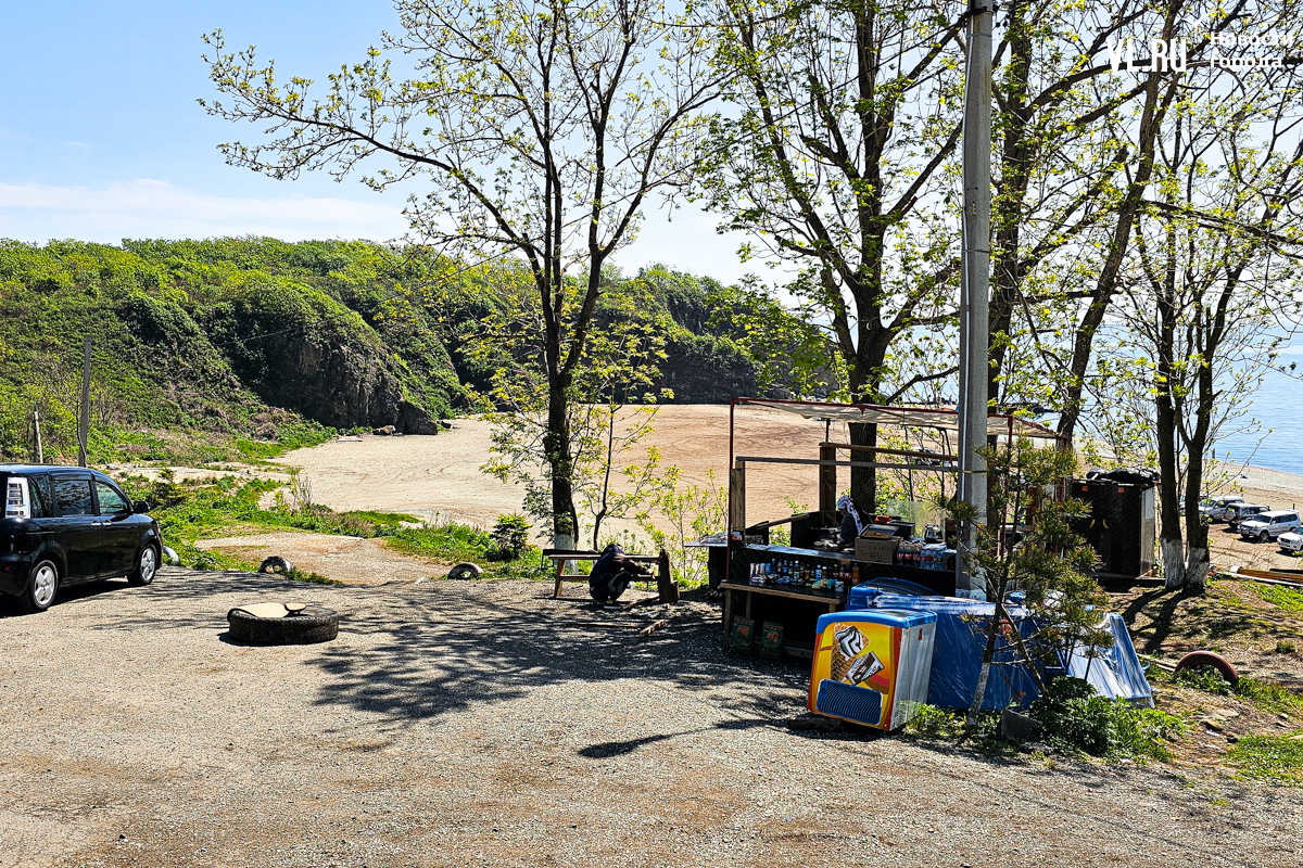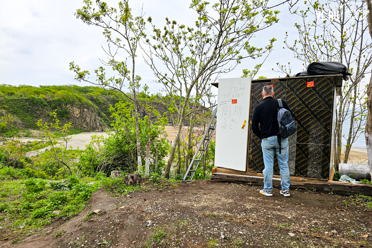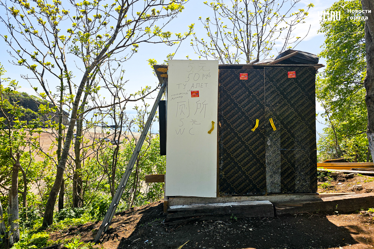 Кстати, полноценного возвращения верёвочников на берег бухты пока не случилось, но некоторые признаки уже имеются. У трассы, к примеру, появился туалет с ценником 50 рублей или 5 юаней за визит. А на пляже прямо из автомобиля торгуют кофе, лимонадом и сэндвичами. Причём и тут предприниматель продублировал рекламу сразу на китайском.