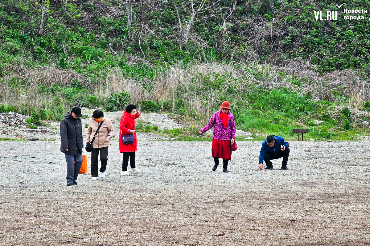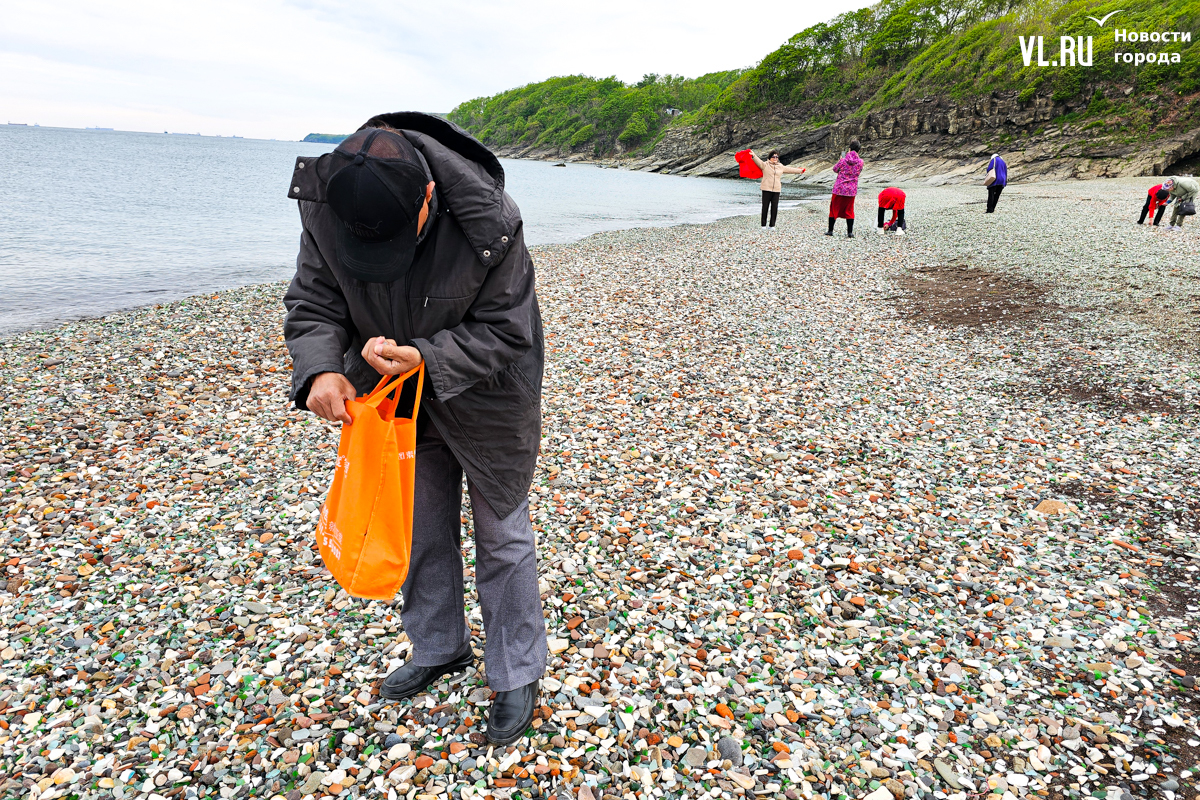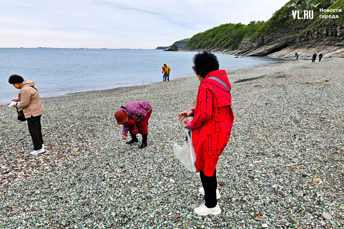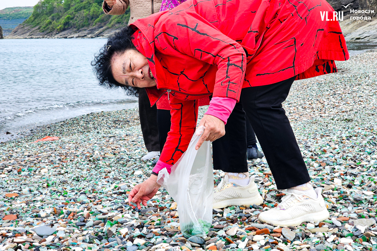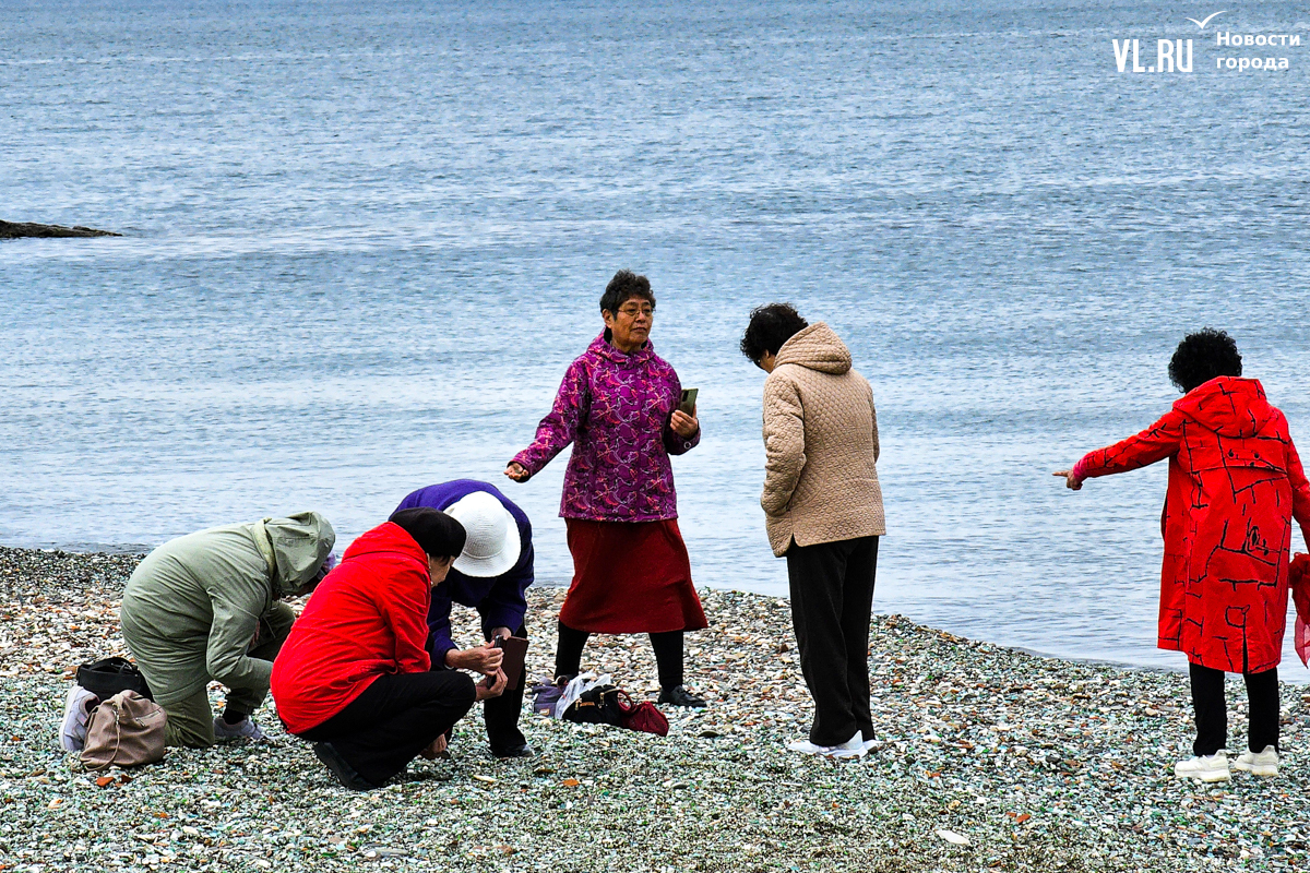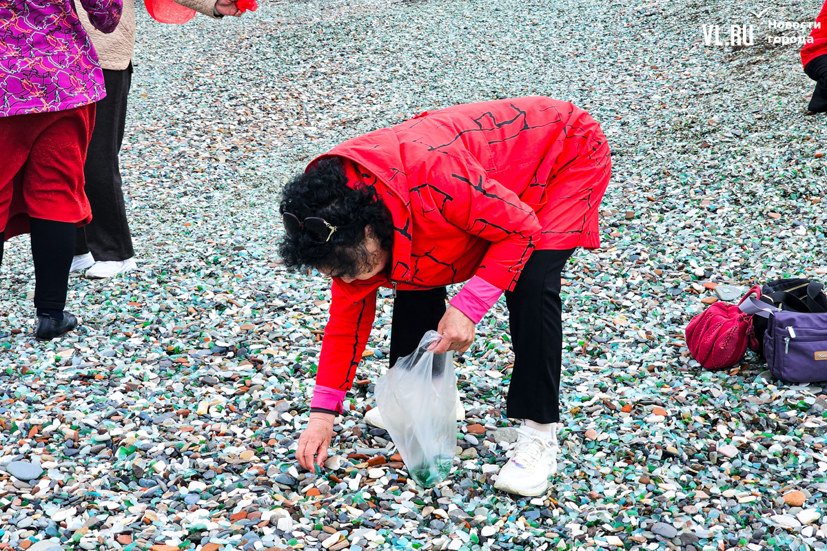 Появились тургруппы и на «Стекляшке», и проблема повторилась. Уже несколько недель горожане жалуются в соцсетях, что китайские туристы, чаще всего пожилые женщины, снова набирают и увозят с собой полные пакеты стекла, выбирая самые красивые «камушки». Фотограф Новостей VL.ru поехал на место и убедился, что это правда. Туристы собирают стекло открыто, без стеснения, от камеры не прятались, напротив, даже попросили сфотографироваться с нашим фотографом, а потом продолжили кладоискательство.