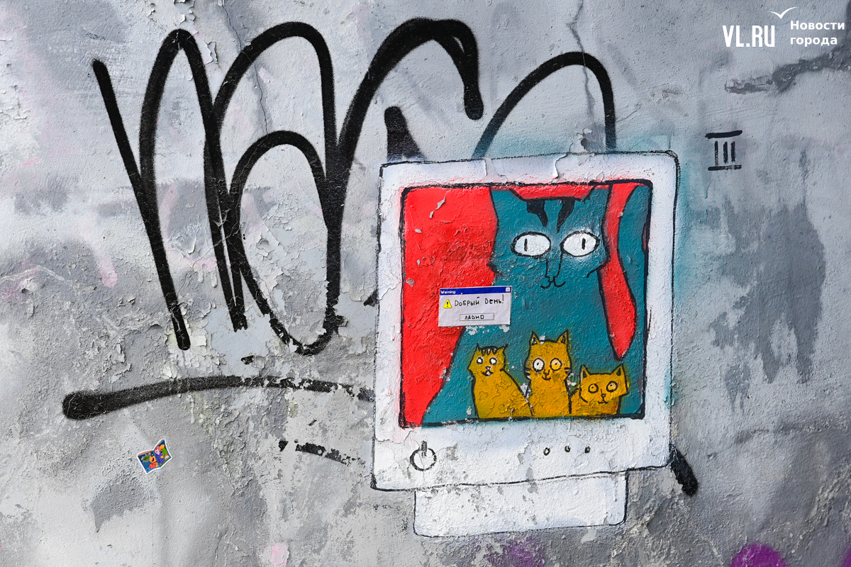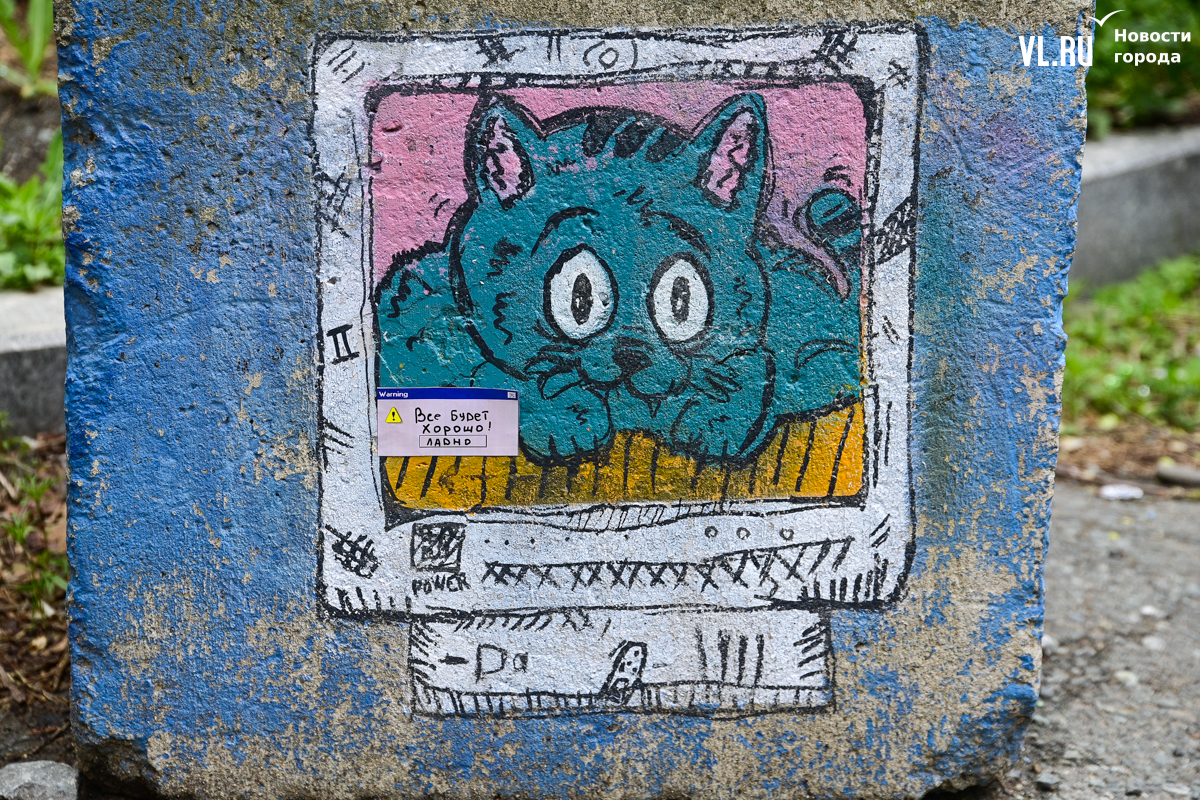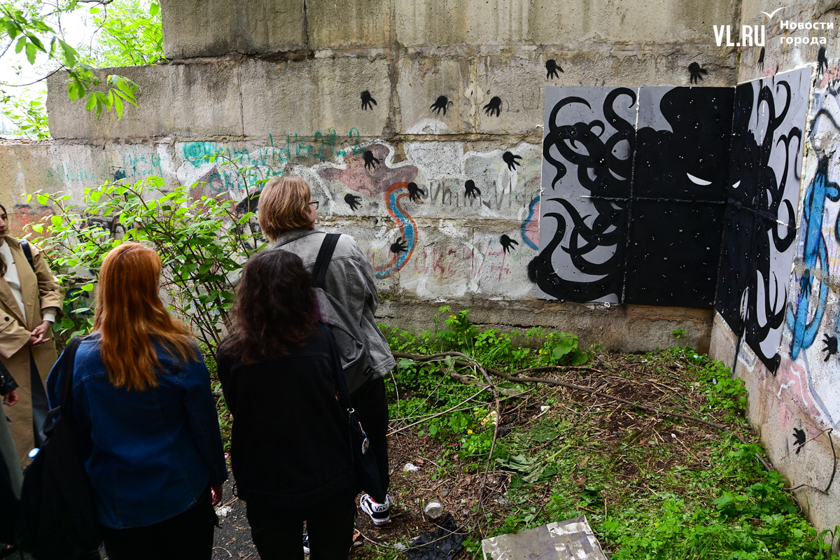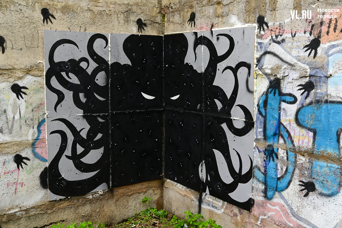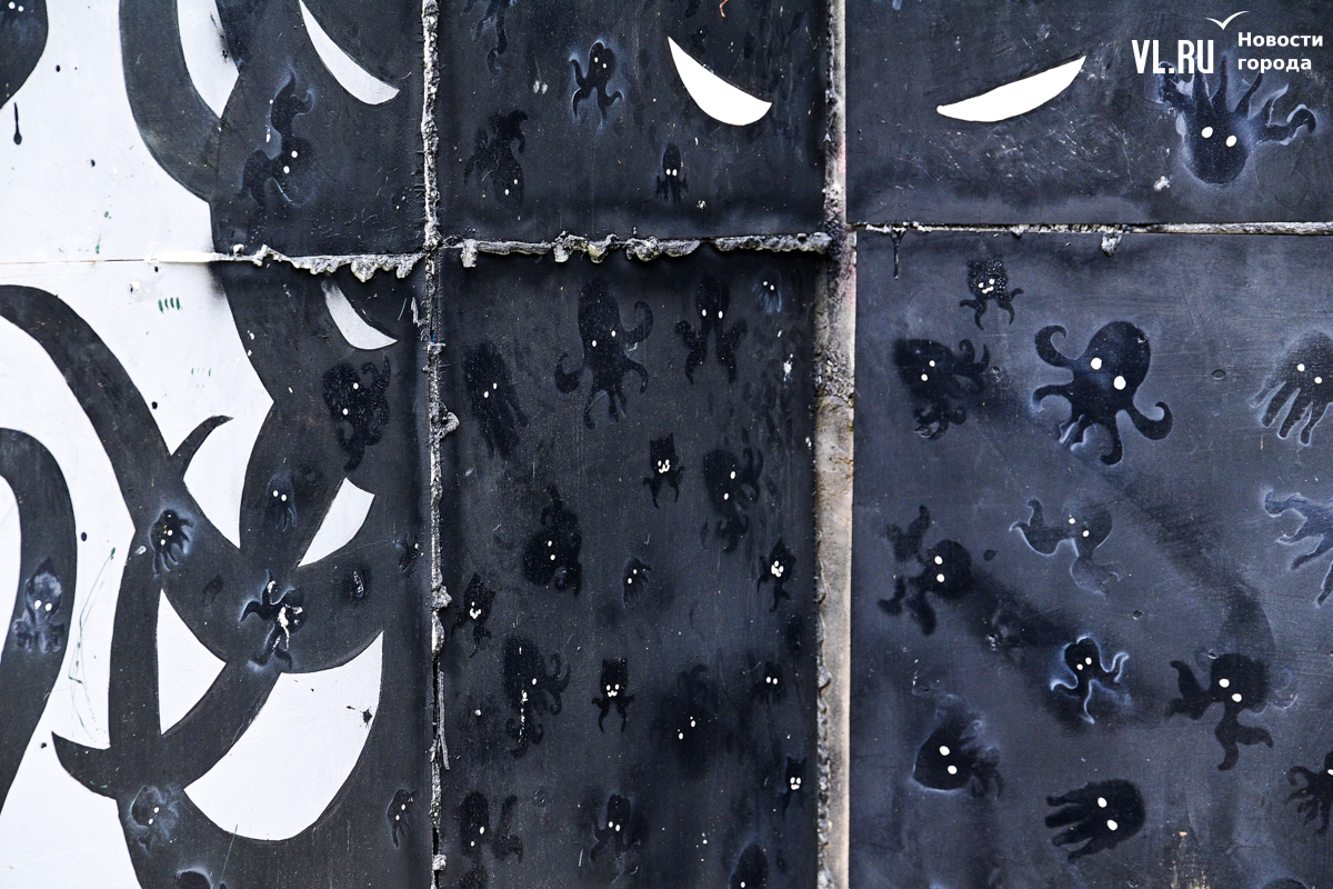 Студенты ДВФУ выбрали для художественного высказывания тихие уголки старого центра Владивостока, разместив на вертикальных и горизонтальных поверхностях более десятка объектов стрит-арта. Они некрупные, и многие с ходу можно не найти. Учащиеся магистрата по специальности «Цифровое искусство» и их преподаватель Павел Шугуров показали корреспондентам Новостей VL.ru, где стоит останавливаться прохожим.