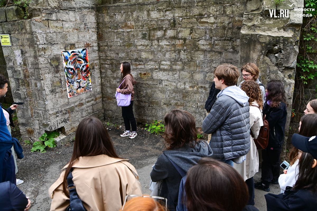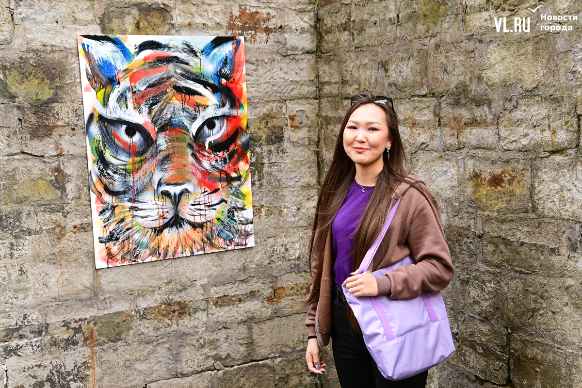 На стене в ближайшем дворе – красавец-тигр. Автор, Кэрэл Ючюгяева, из Якутска. Вообще, на курсе учатся ребята из Москвы, Краснодара, с Сахалина, и они только начинают открывать Владивосток. Когда Кэрэл навешивала картину, подошёл жилец, сказал, что красиво выглядит, и принялся помогать всё закрепить. Работа видна с основной улицы, но если прохожий подойдёт ближе – увидит уютный двор за старым домом с развешанным бельём и маленькими сарайчиками. Таких уже немного во Владивостоке. Получается, арт-объект выглядит как маркер места.