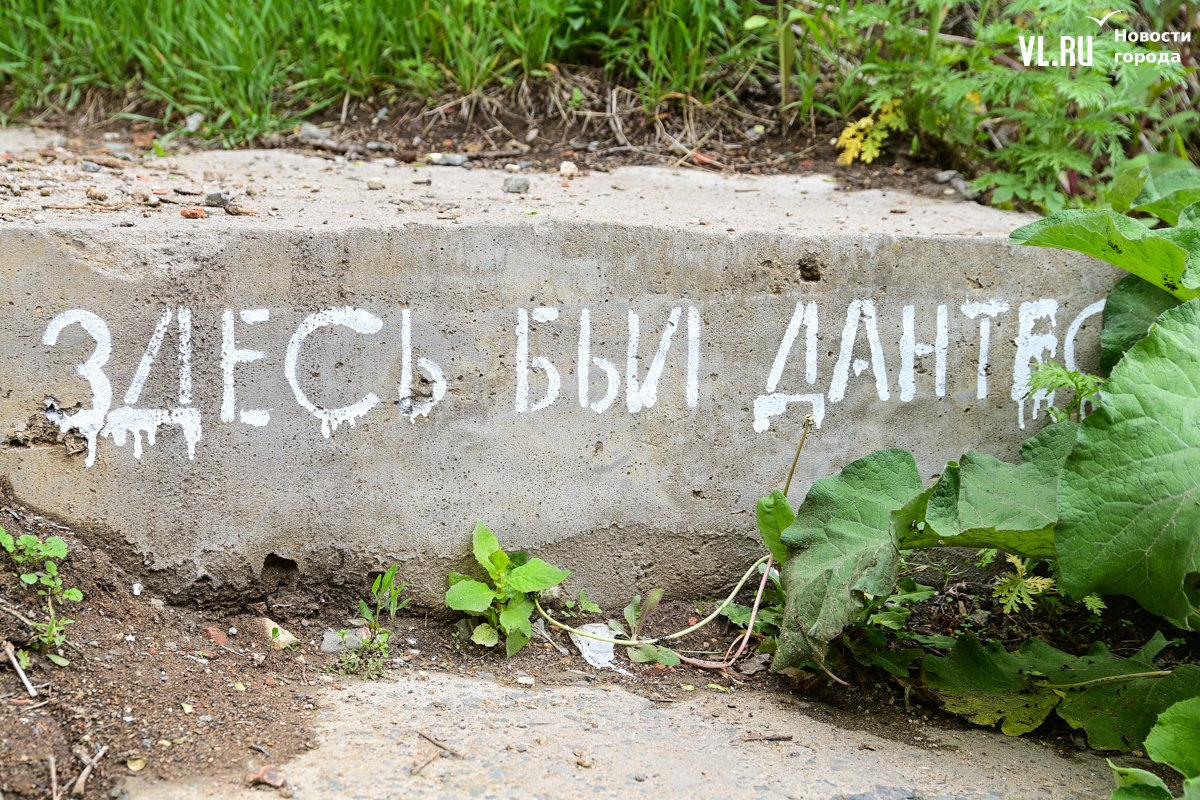 Старая разбитая лестница через дорогу тоже стала арт-объектом. На фронтальной стороне ступеньки надпись «здесь был Дантес». Надо полагать, это он так покуролесил. Автор Кирилл Бубновский искал разрушенные места, чтобы обратить внимание на городские проблемы. В итоге у него получилось четыре разных надписи, в том числе вокруг ям, – как привет коммунальщикам.