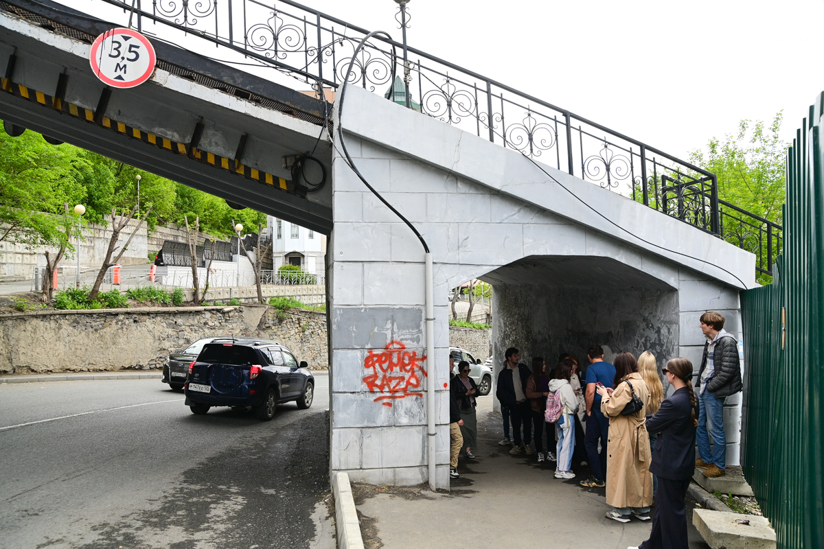 Так студенты учатся осваивать городское пространство, понимать его и видеть себя в нём. Придуманные ими проекты решили расположить в старом центре. И это получилось во всех смыслах уличное искусство – здесь нет согласованных работ. Авторы пытались утвердить в администрации Владивостока мурал на Семёновской, посвящённый «людям-селёдкам» в 15-м автобусе. Студентам эта тема до боли близка – маршрут на Русский проходит мимо ДВФУ. Но в мэрии эскиз не понравился.