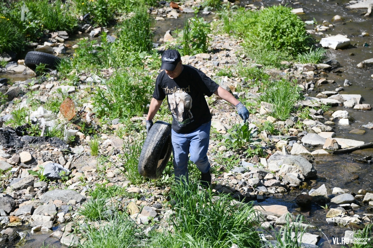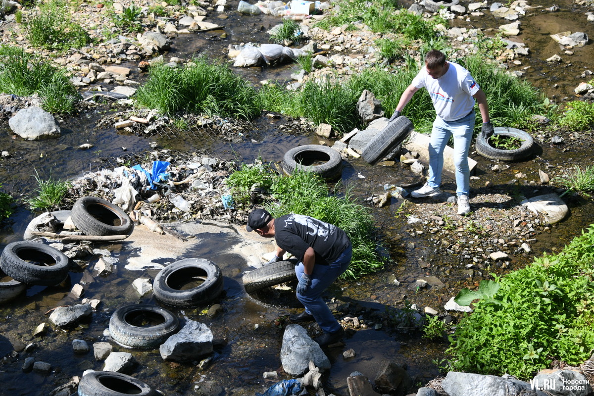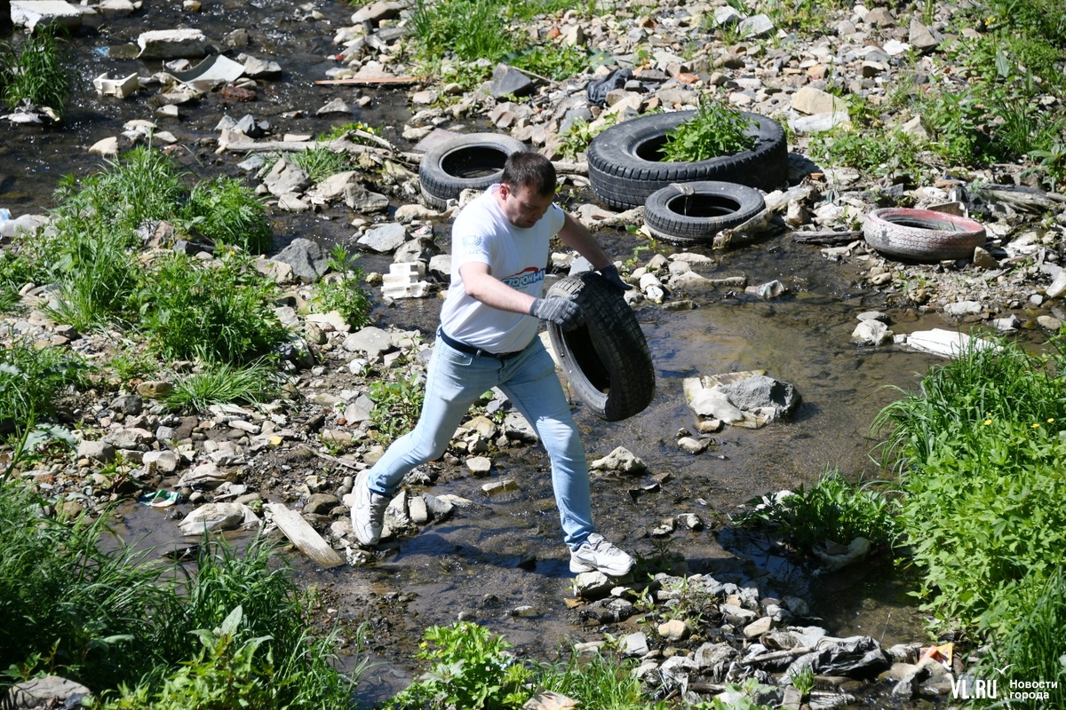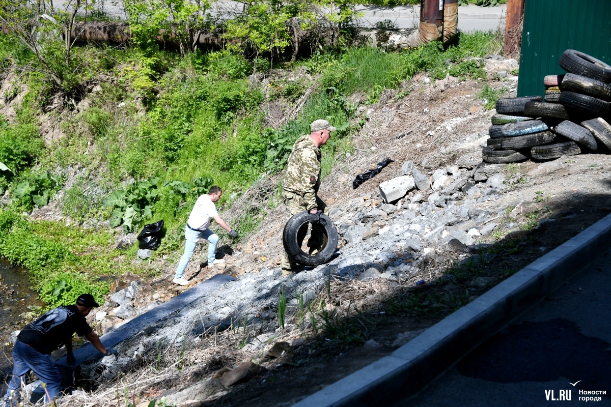 От природы живописный берег Первой речки в районе улицы Карьерной в последнее время выглядел грязным и запущенным. Мусор, ветки и покрышки, очень много покрышек: судя по остаткам краски на их боках, раньше они играли роль клумб на местных грядках, а затем волею судеб оказались на дне речном. Однако общественники Владивостока решили ситуацию исправить и привести территорию в порядок.