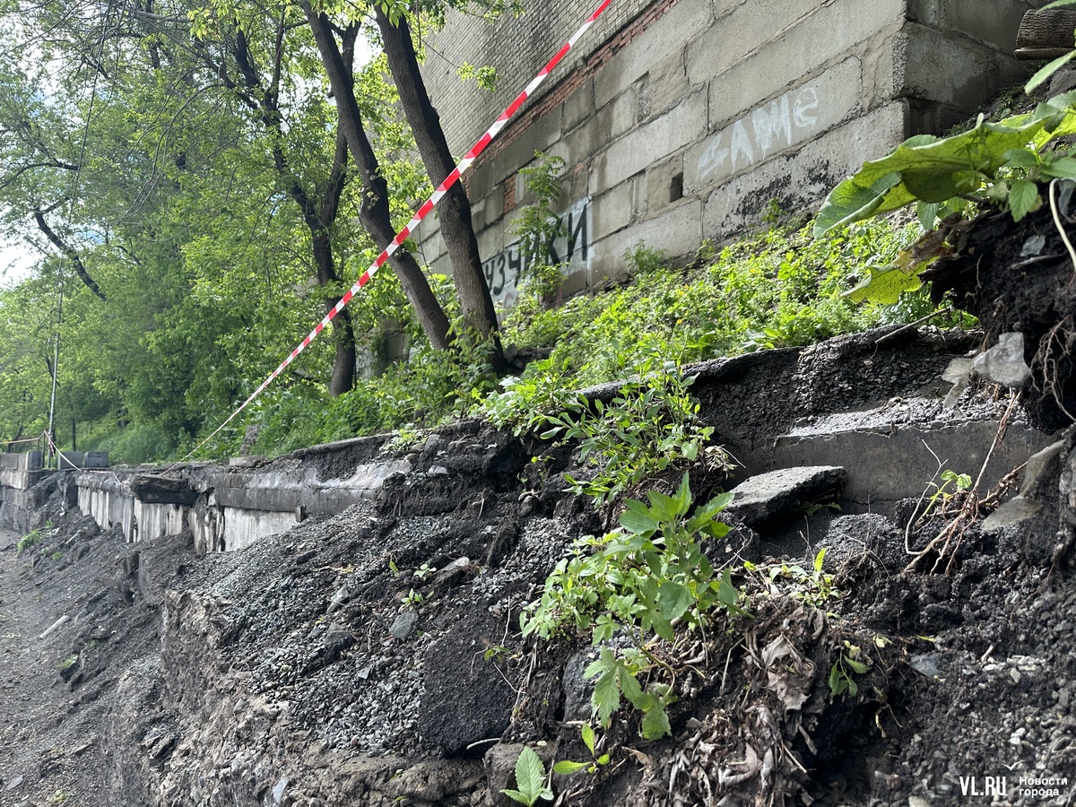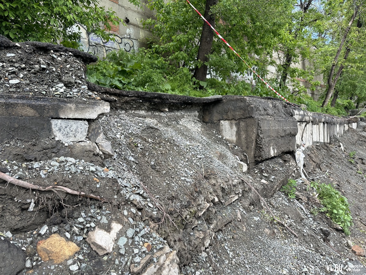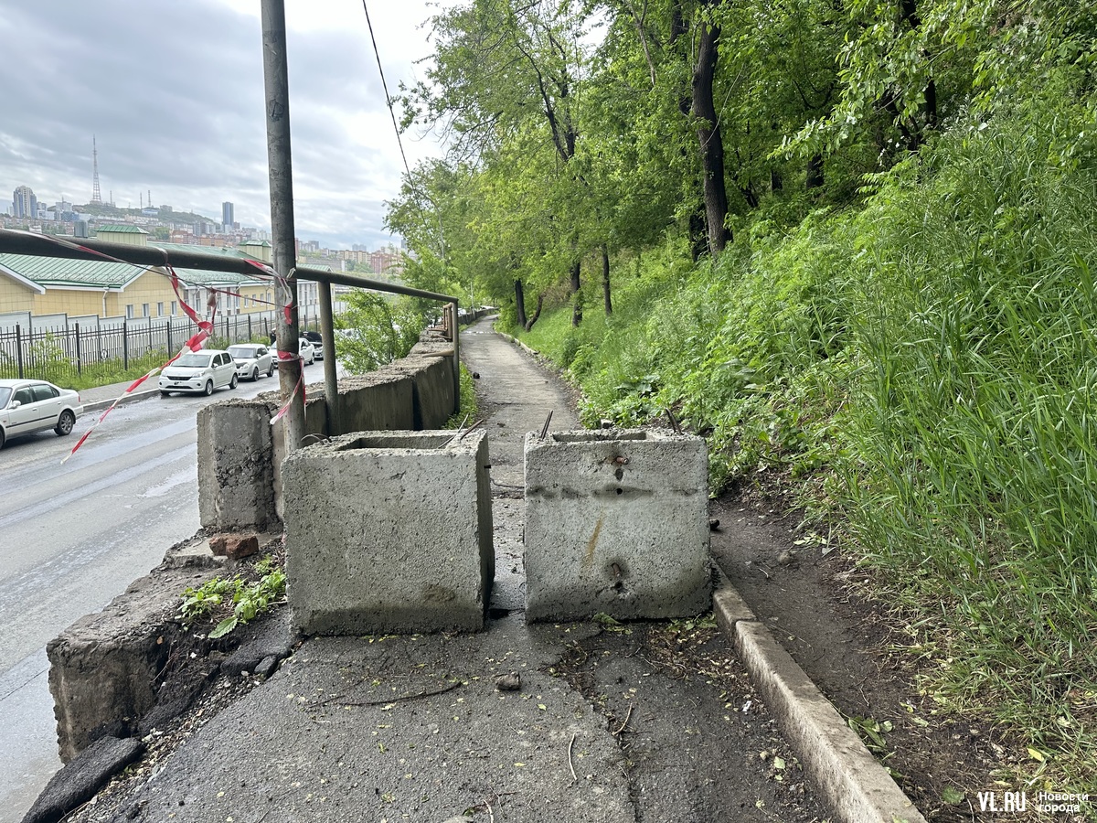 Пройти вдоль аварийного пешеходного участка можно, но если на дорожке столкнутся два человека, кому-то из них придётся залезть на склон. Сам асфальт на тротуаре тоже наклонился. Корреспондент Новостей VL.ru, который решил осмотреть место обвала получше, сам того не желая, проверил, насколько больно будет упасть с тротуара на проезжую часть.