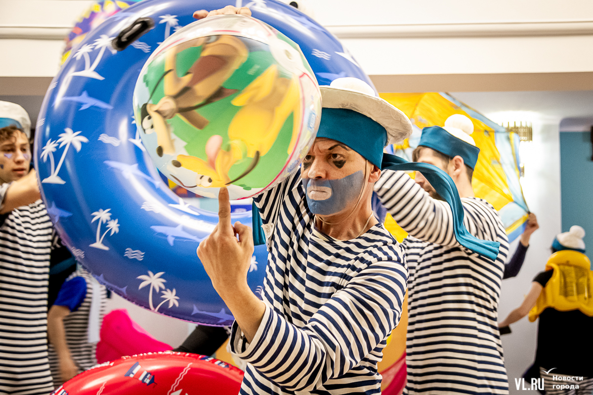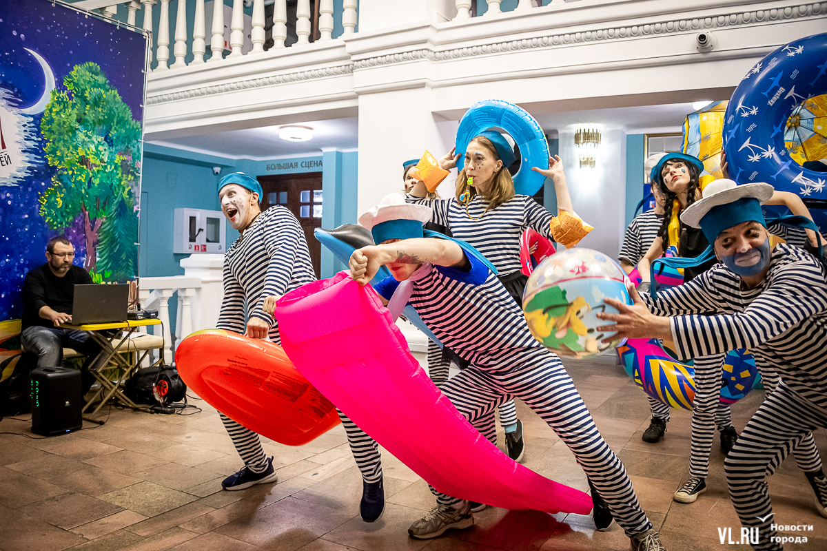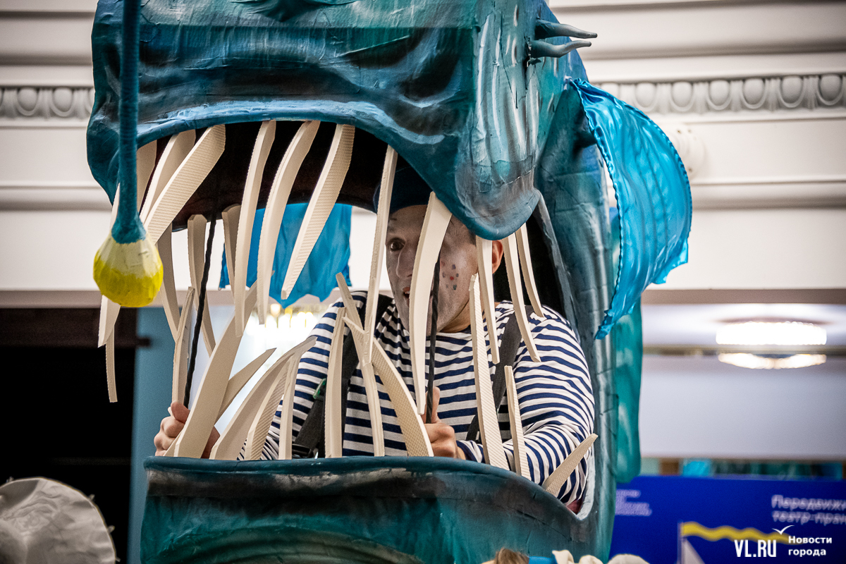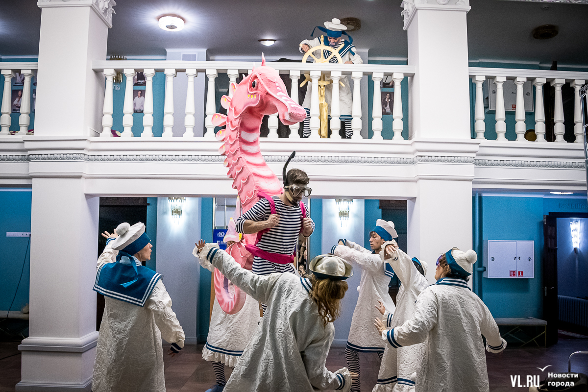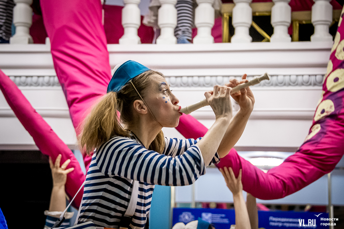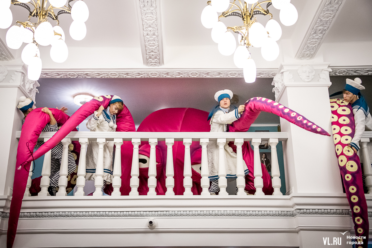 В среду, 29 мая, в Приморском краевом театре кукол прошла презентация уличного спектакля «Колесница радости». Из-за дождя театральное действие перенесли под крышу, но менее зрелищным от этого оно не стало. Горожане смогут увидеть бесплатное представление уже в эту субботу в Адмиральском сквере.