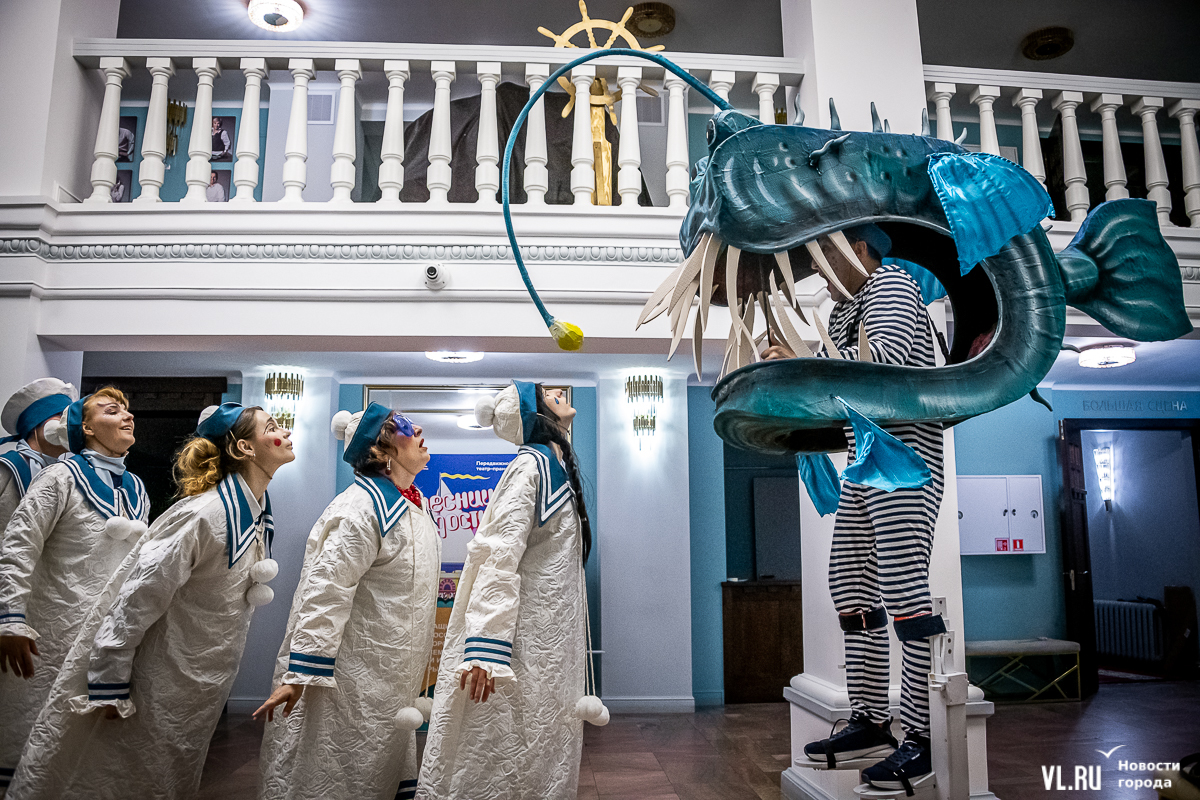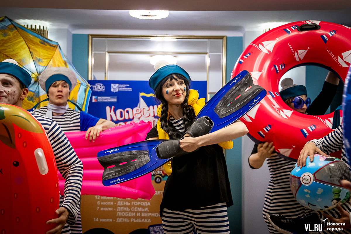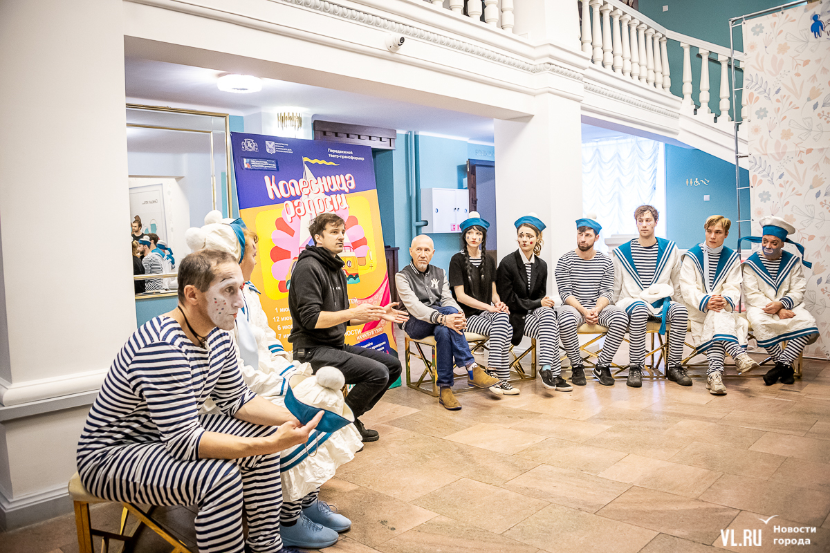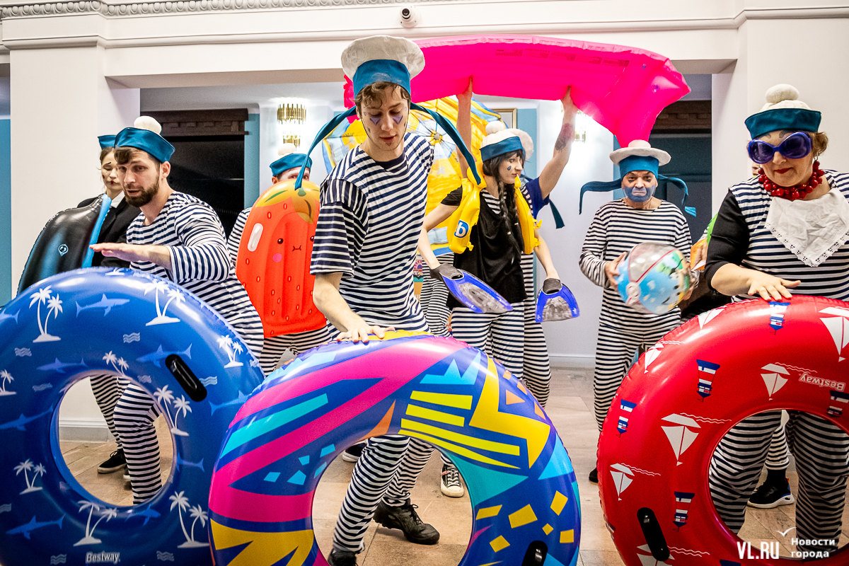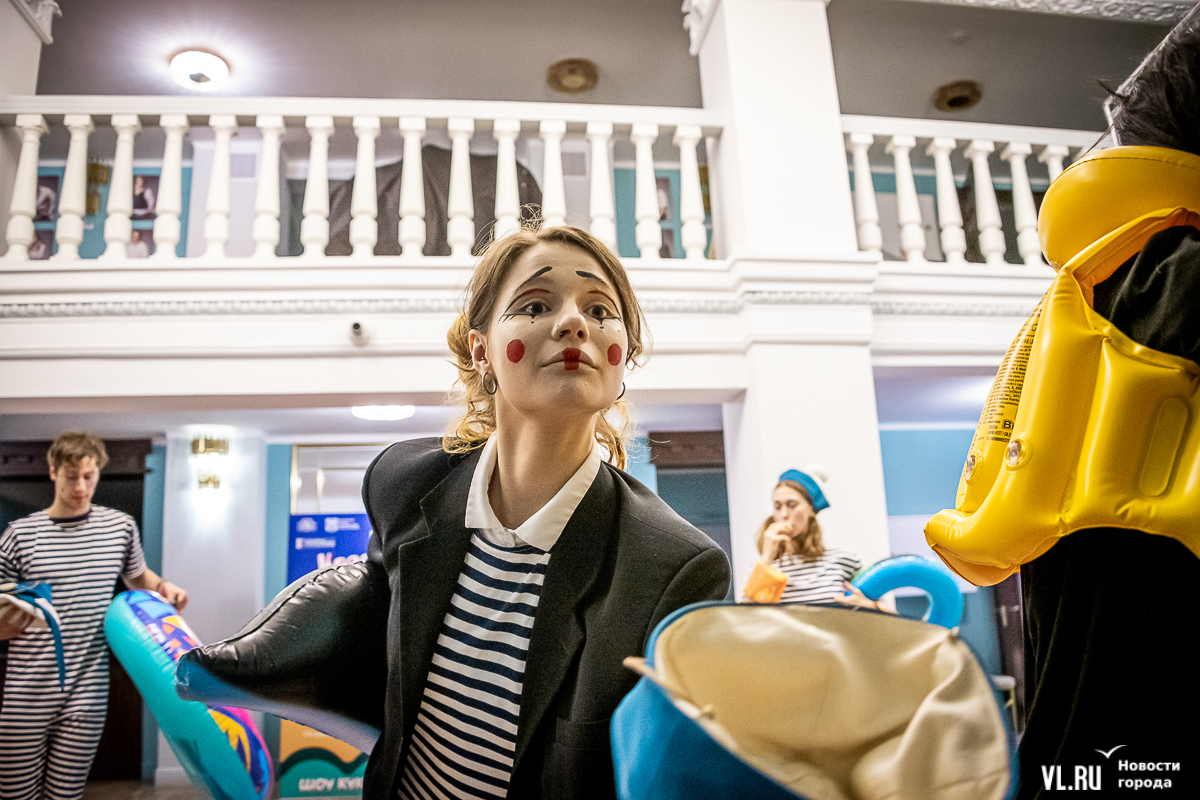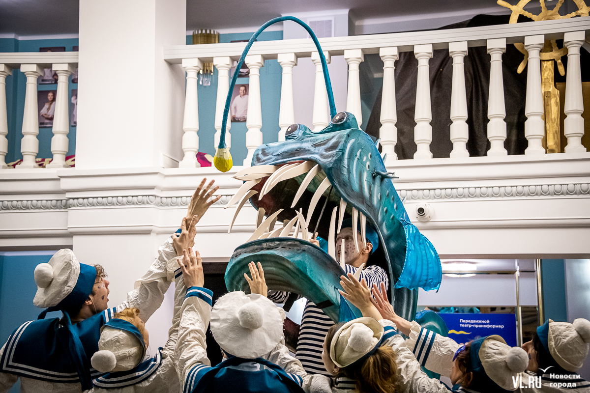 В среду, 29 мая, в Приморском краевом театре кукол прошла презентация уличного спектакля «Колесница радости». Из-за дождя театральное действие перенесли под крышу, но менее зрелищным от этого оно не стало. Горожане смогут увидеть бесплатное представление уже в эту субботу в Адмиральском сквере.