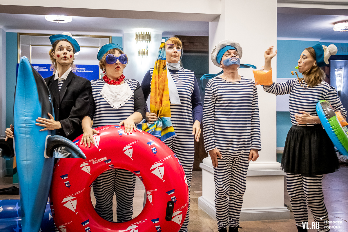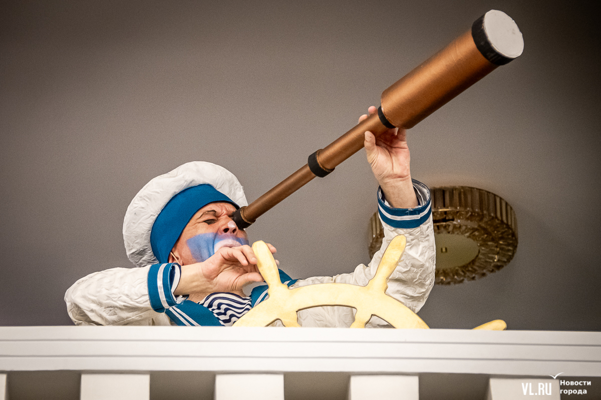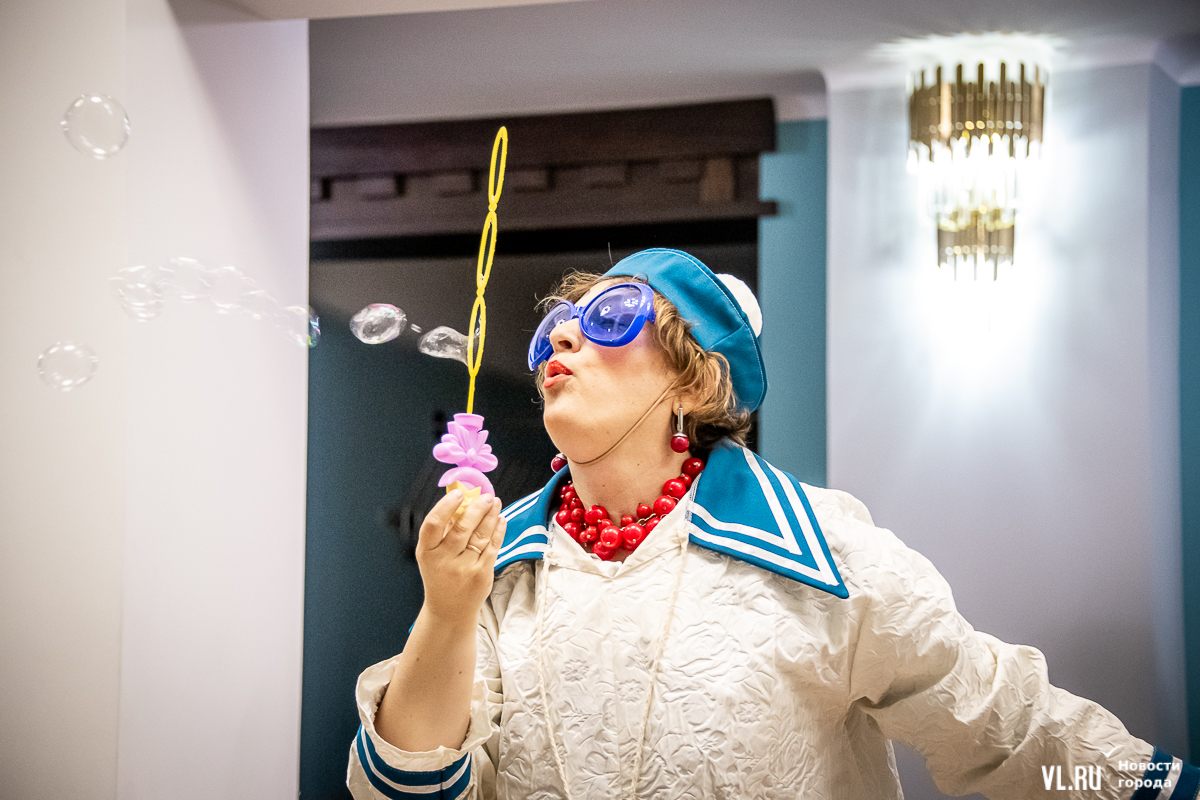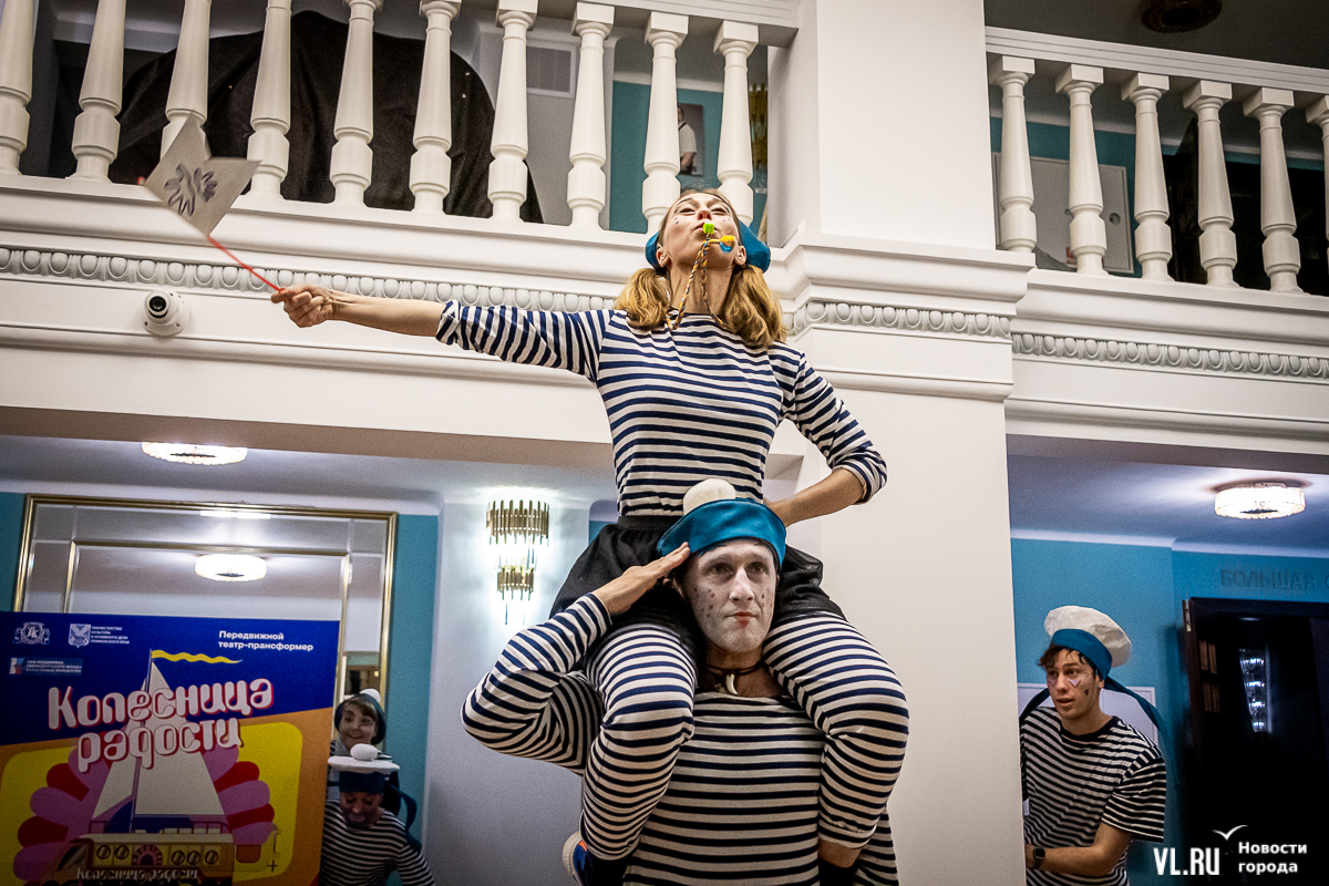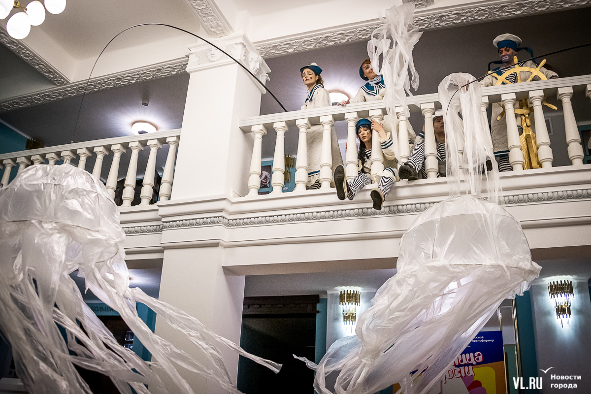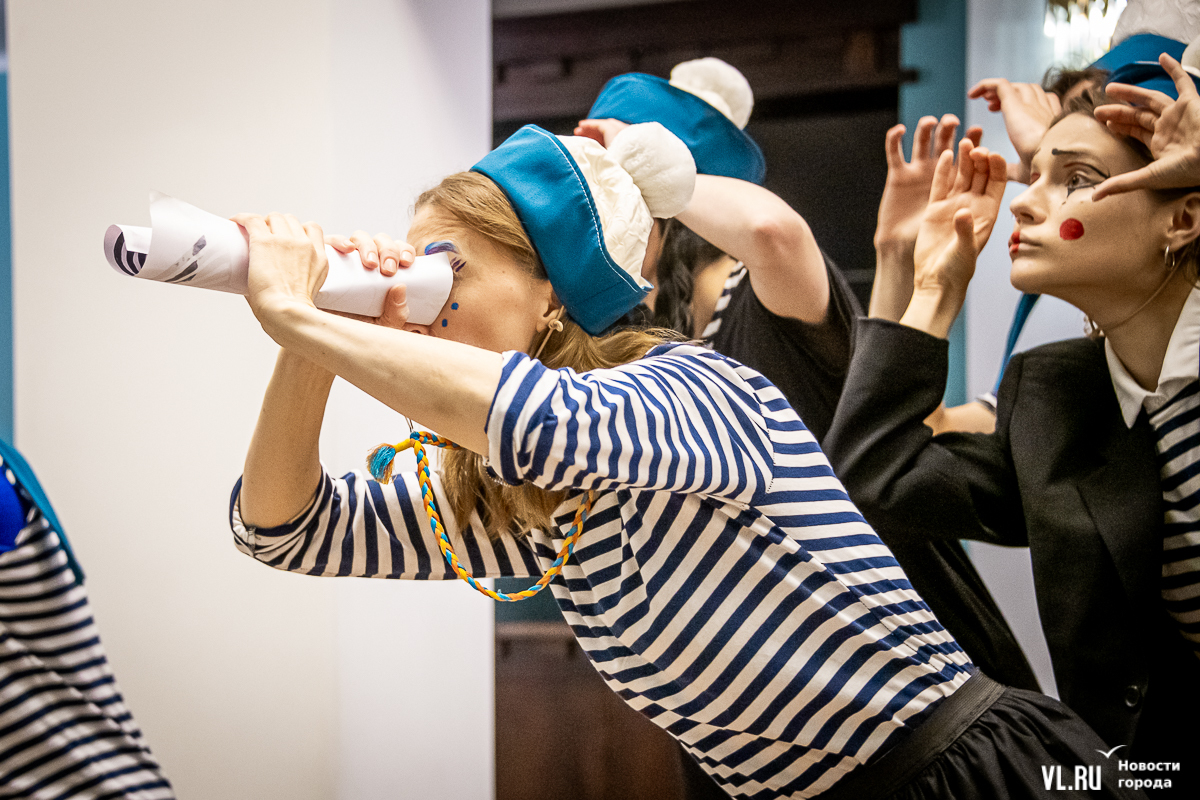 В среду, 29 мая, в Приморском краевом театре кукол прошла презентация уличного спектакля «Колесница радости». Из-за дождя театральное действие перенесли под крышу, но менее зрелищным от этого оно не стало. Горожане смогут увидеть бесплатное представление уже в эту субботу в Адмиральском сквере.