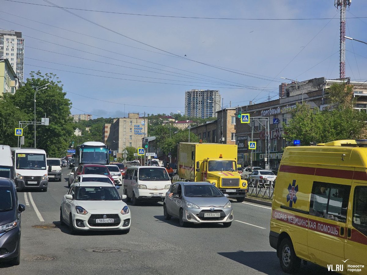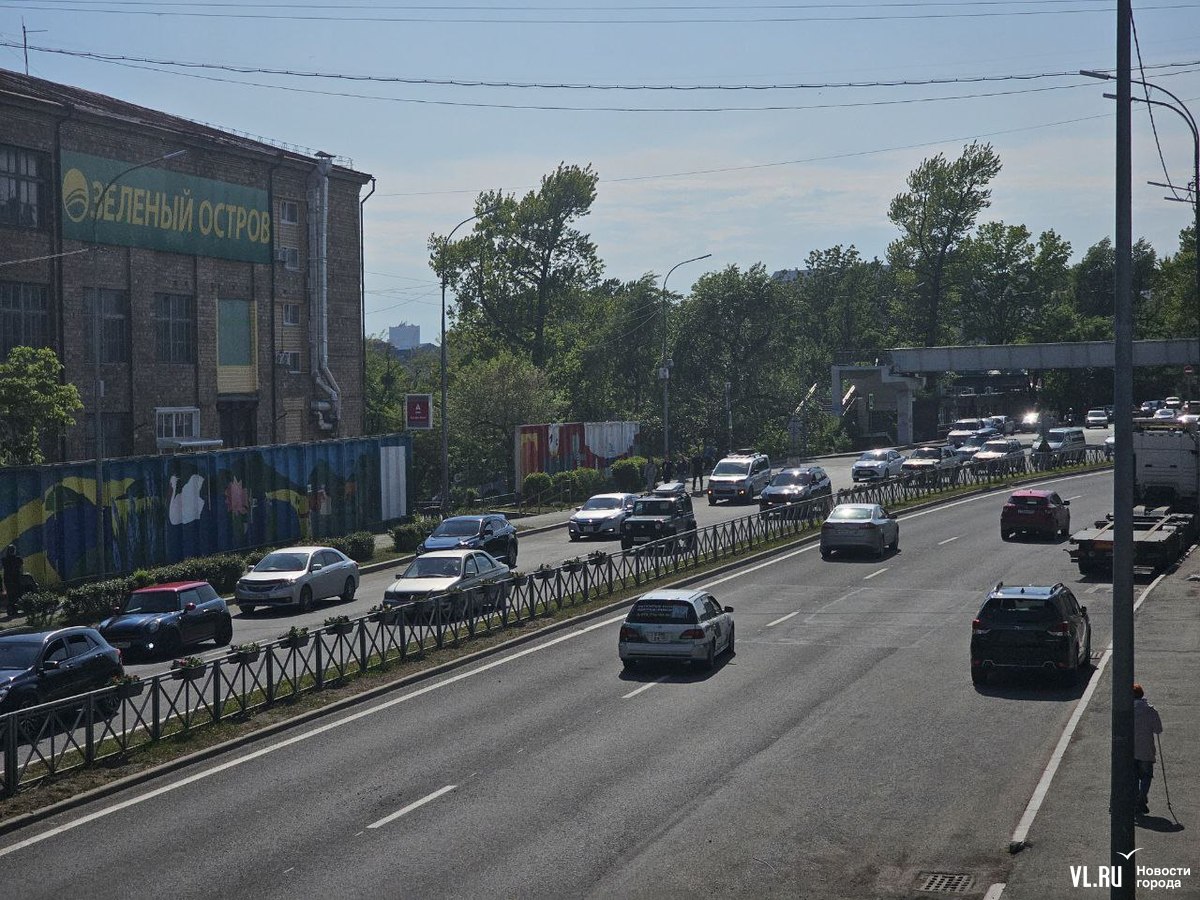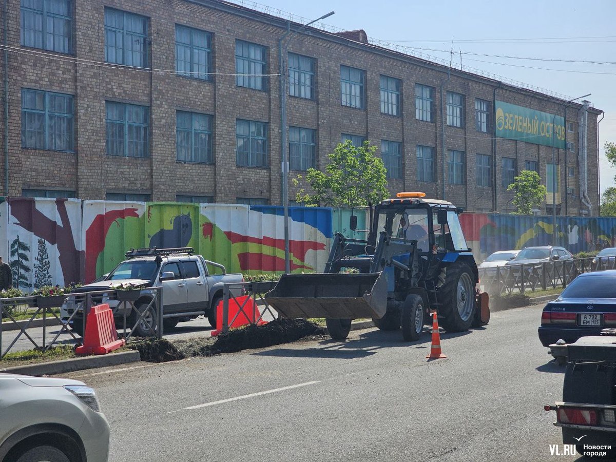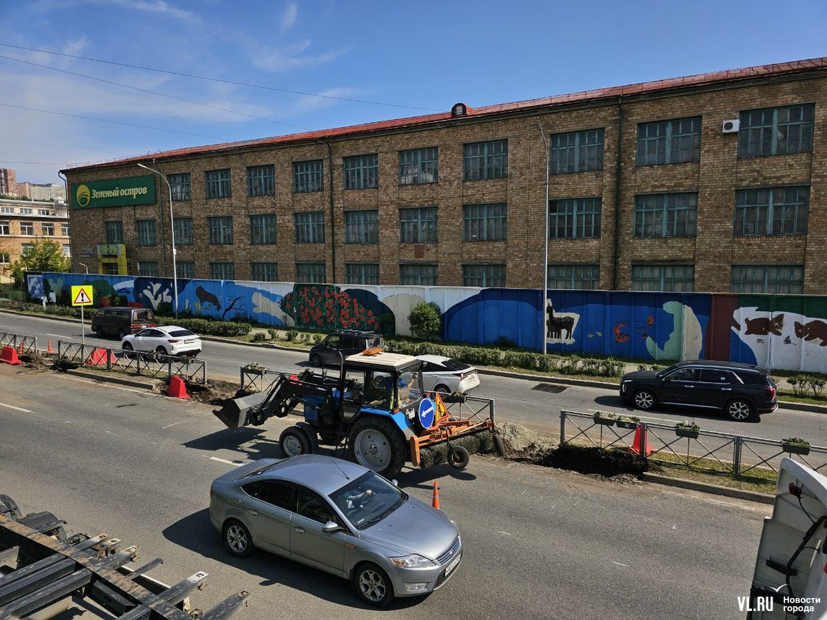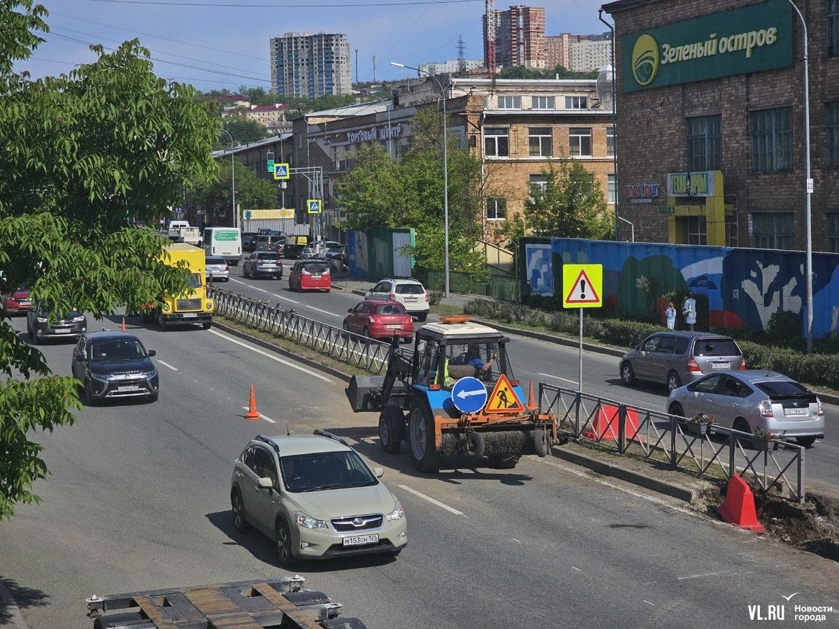 В районе «Зелёного острова» сегодня большая пробка в обе стороны. Здесь посреди дороги делают технологический разрыв. Рабочие и техника заняли по одной полосе в каждом направлении.