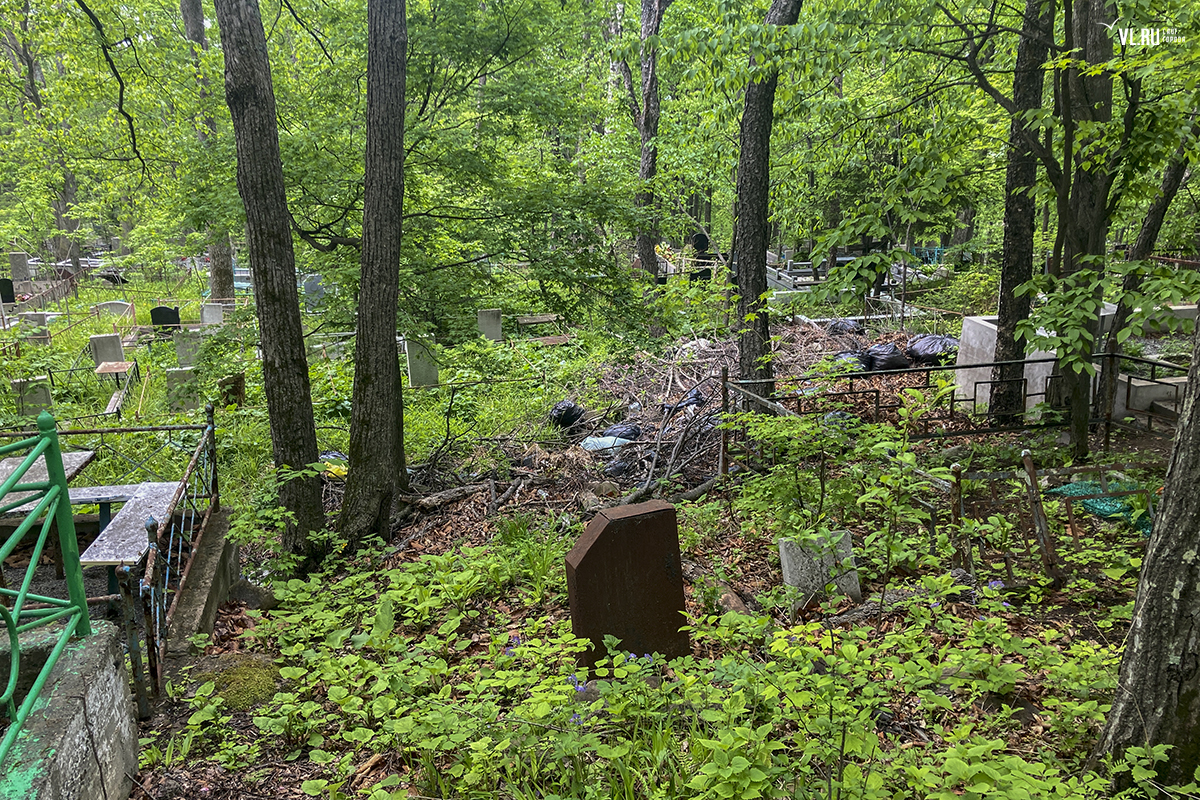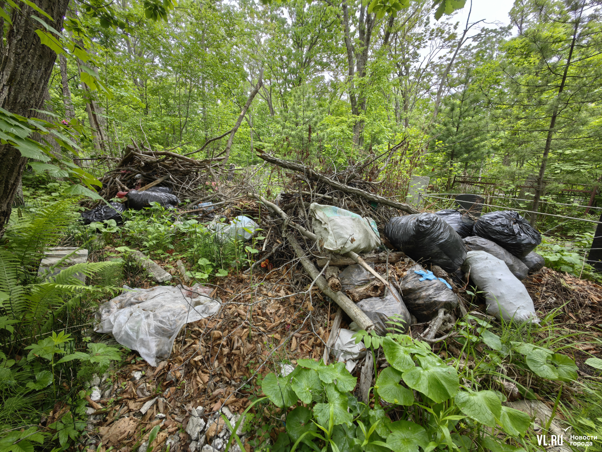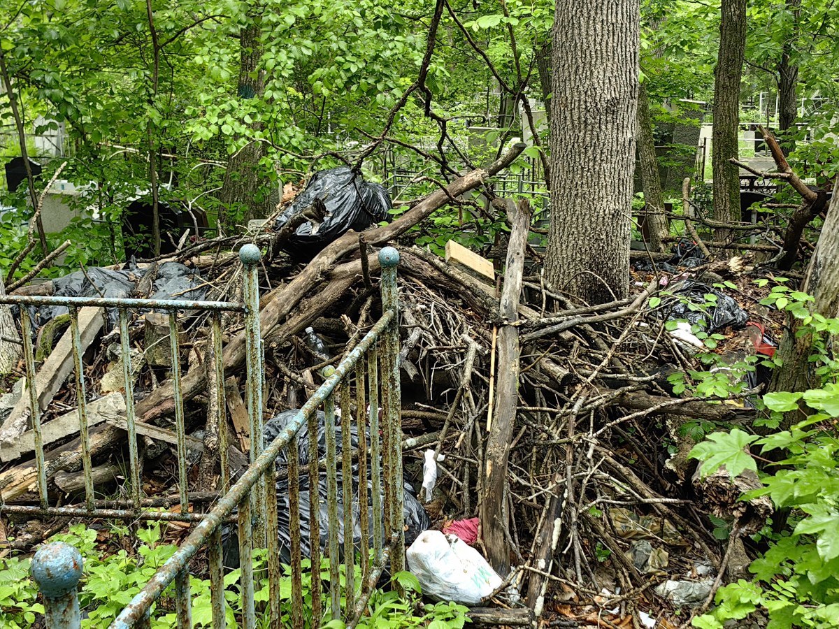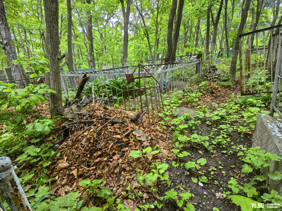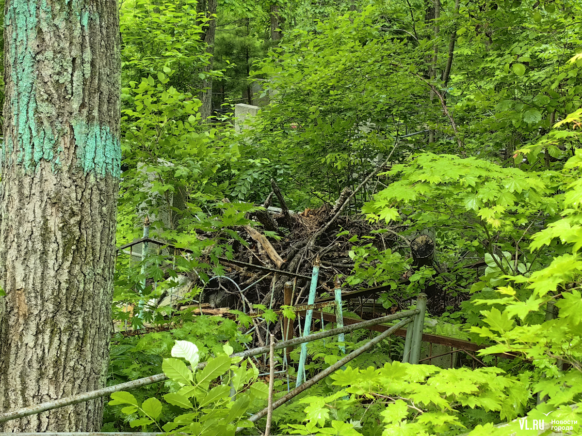 В последнее время руководители Приморья и Владивостока очень полюбили говорить о памяти, преемственности поколений и некоем наследии, которое остаётся после нас детям. Так вот – на Лесном кладбище до сих пор не ликвидировали свалки и горы веток, оставшиеся после «ледяного дождя», но, возможно, появившиеся и раньше. Состояние места упокоения удручает. К началу лета все извилистые тропки между могилами заросли, грунтовые дороги разбиты и размыты, участок возле колумбария просел, а ливнёвки сломаны.